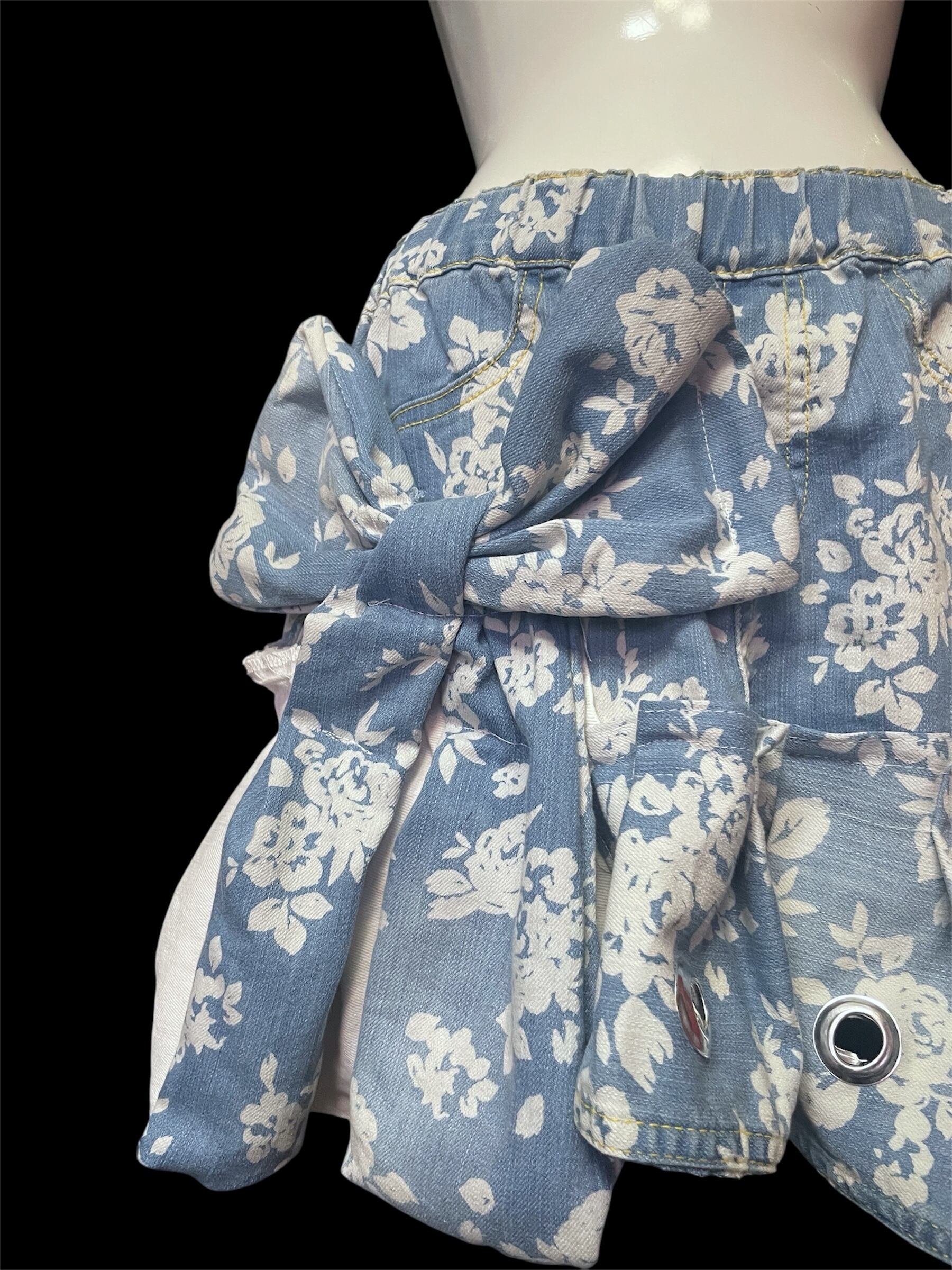ヴィンテージデニムをリメイクしたスカート。淡いブルーに白い花柄が映えるガーリーなデザイン。大きなリボンがアクセントになり、フェミニンな雰囲気を演出。裾のハトメデザインとフリルが個性的で、カジュアルながらも上品な一枚。