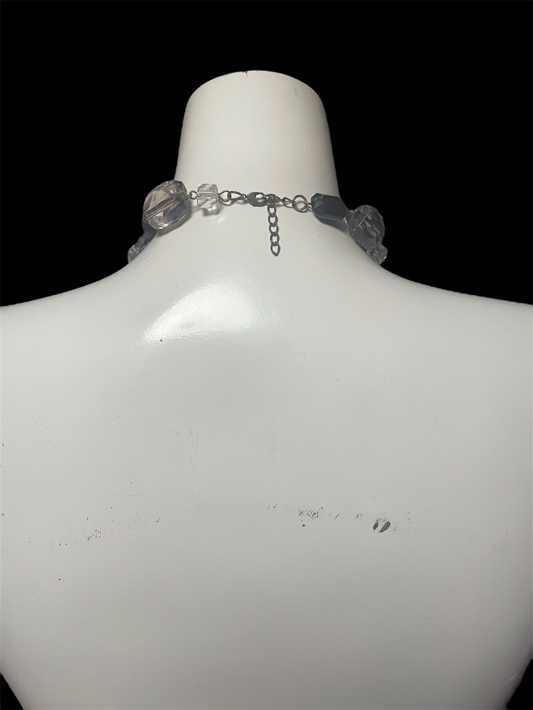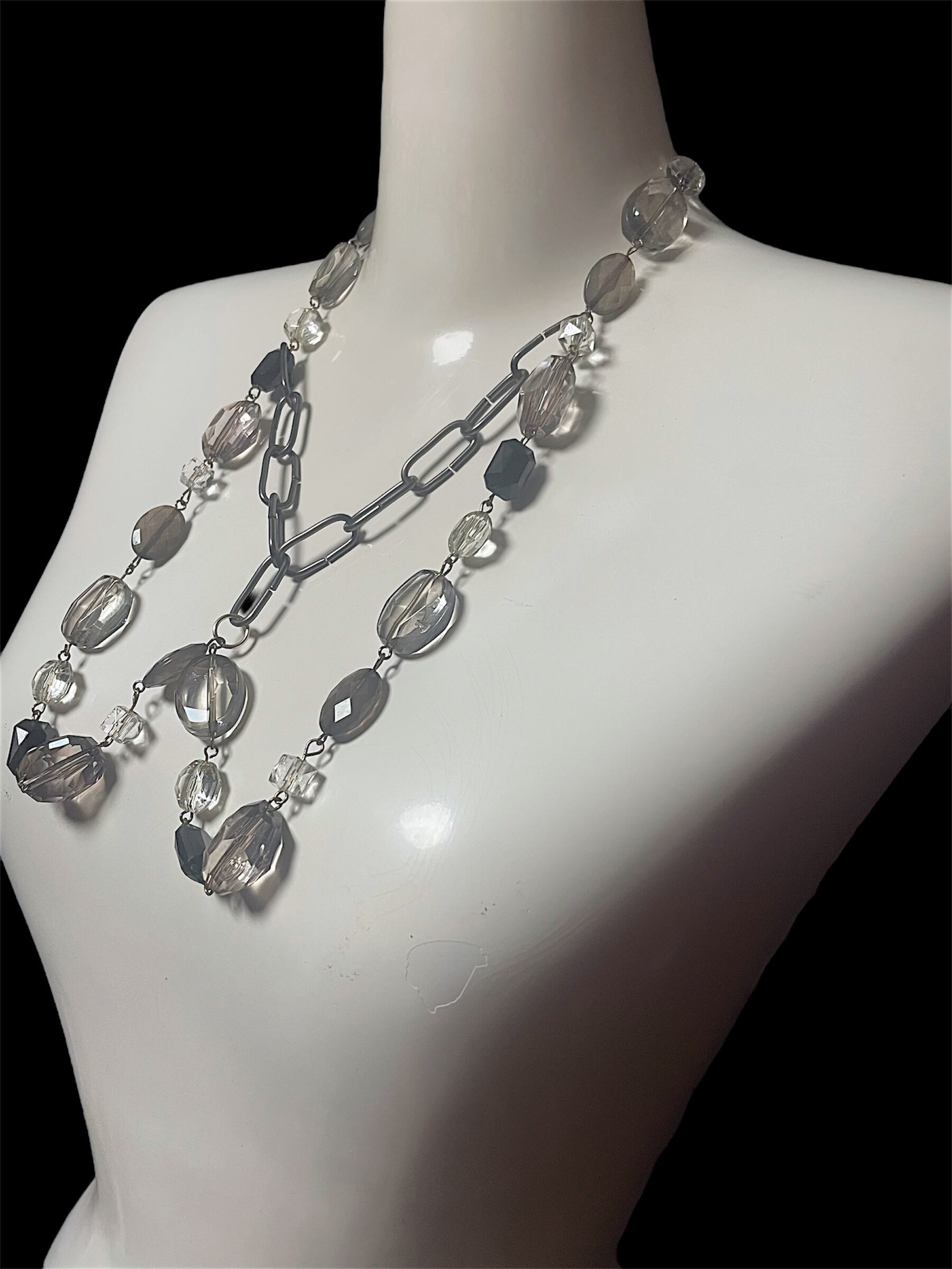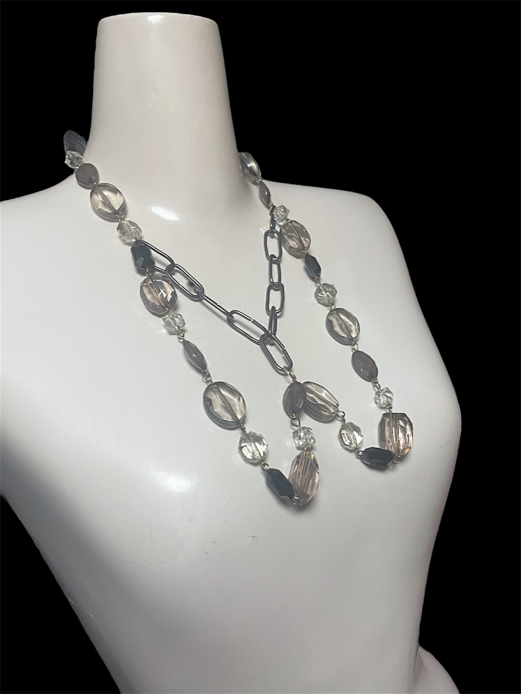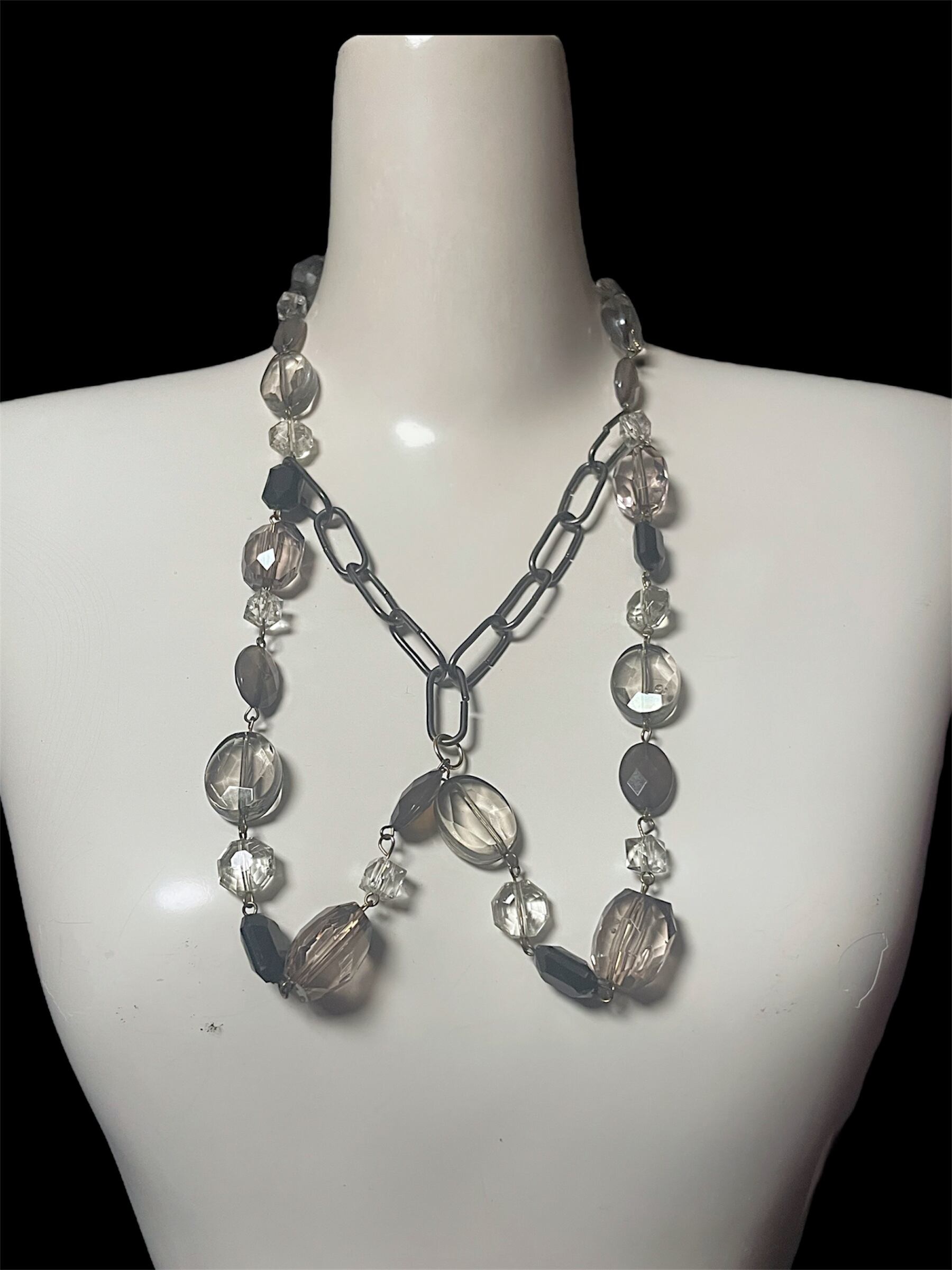 透明感のあるビーズと無骨なチェーンパーツを組み合わせました。素材感は異なりながらも、トーンを揃えることでまとまりのある仕上がりに。繊細さと力強さが同居する一本です。
