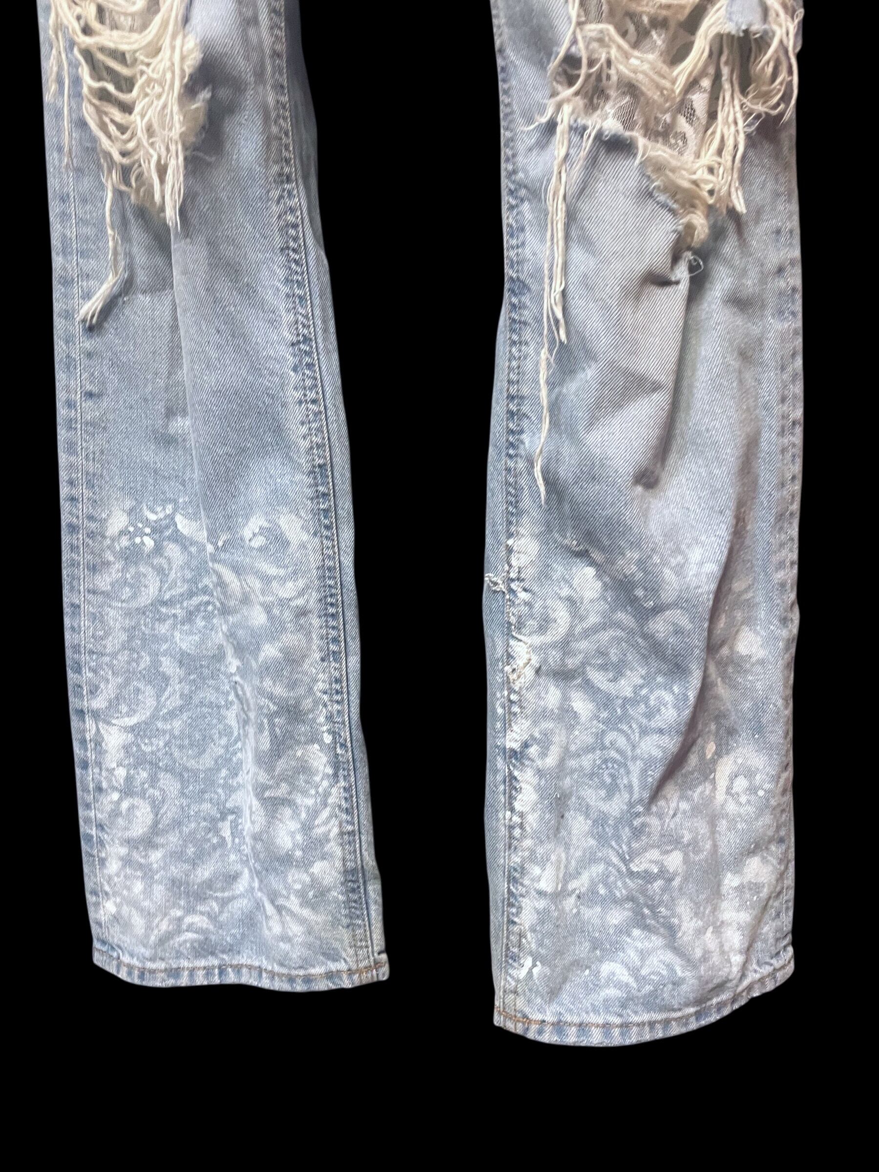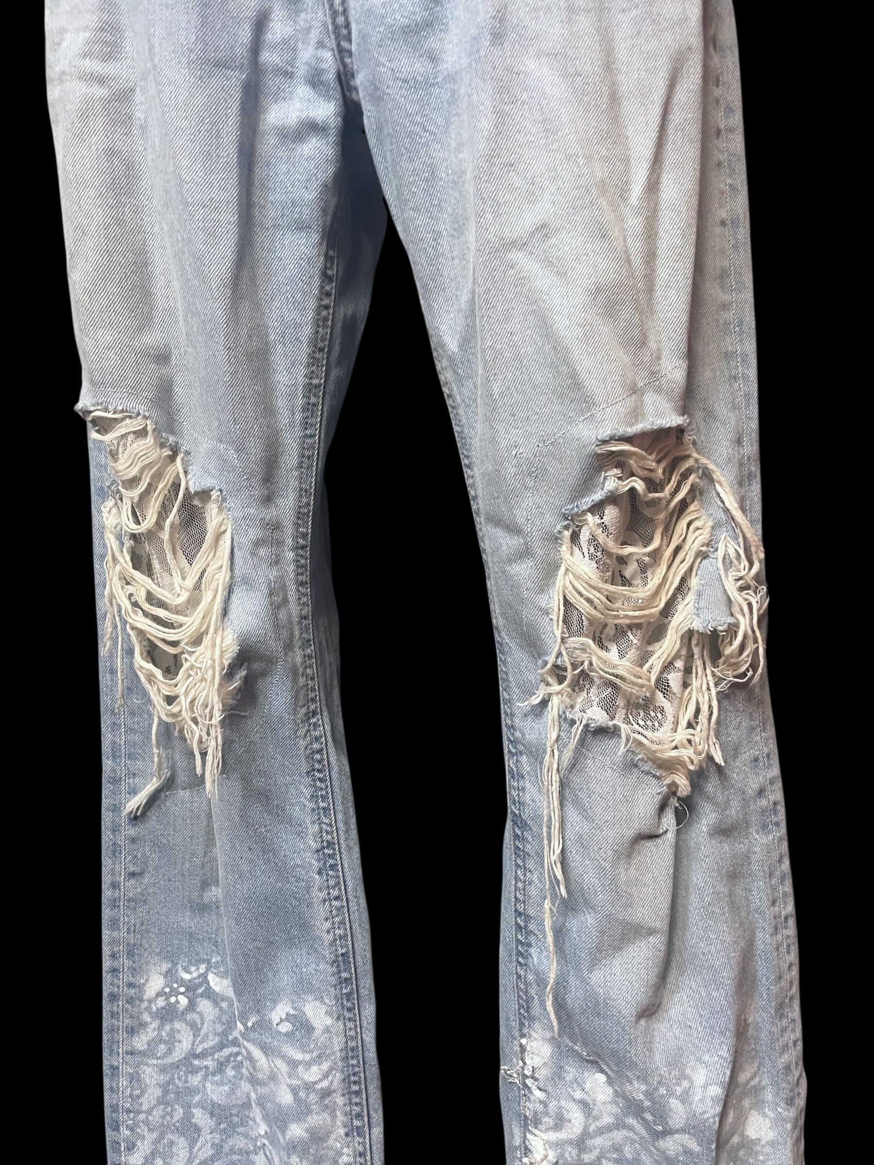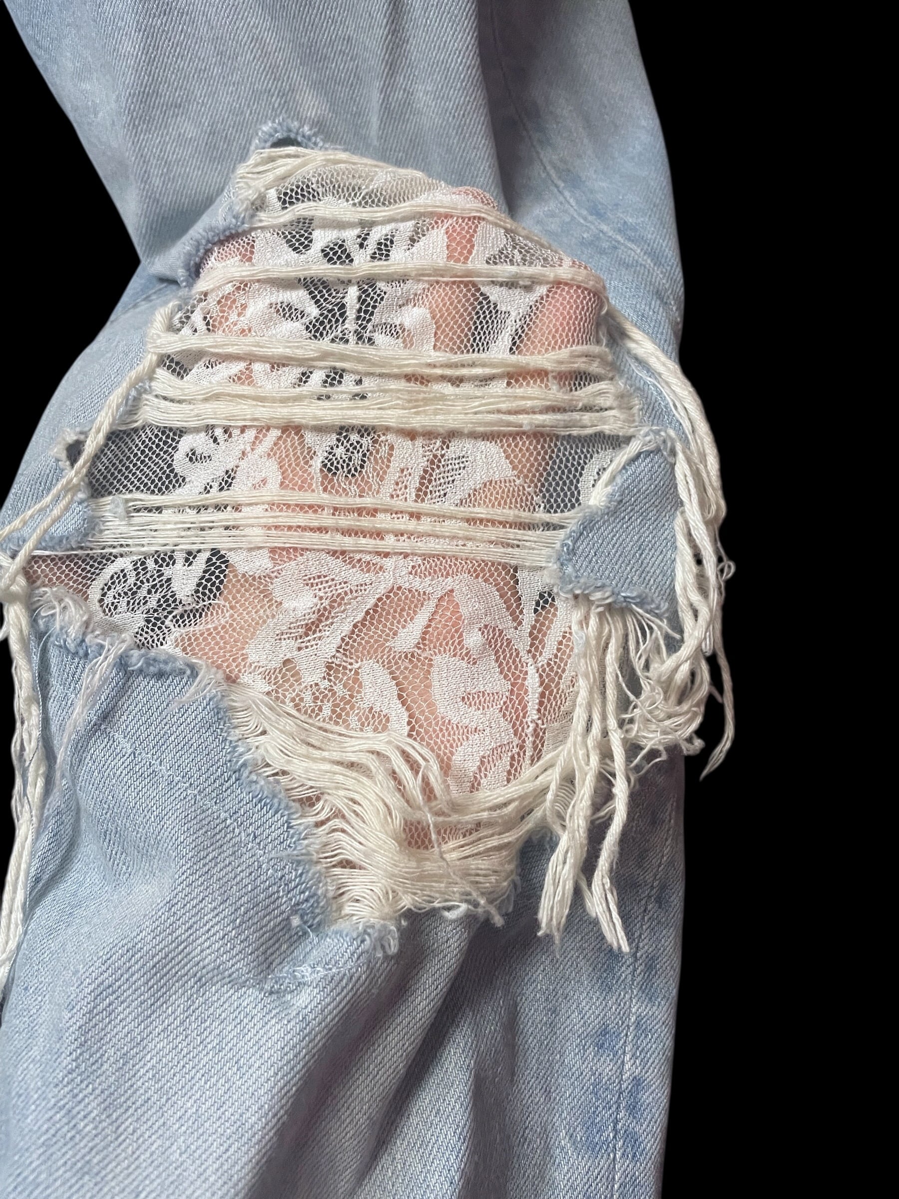 膝のダメージ部分に伸縮性のあるレース生地を入れ、ハードさとフェミニンさをミックスしたデザインに仕上げました。