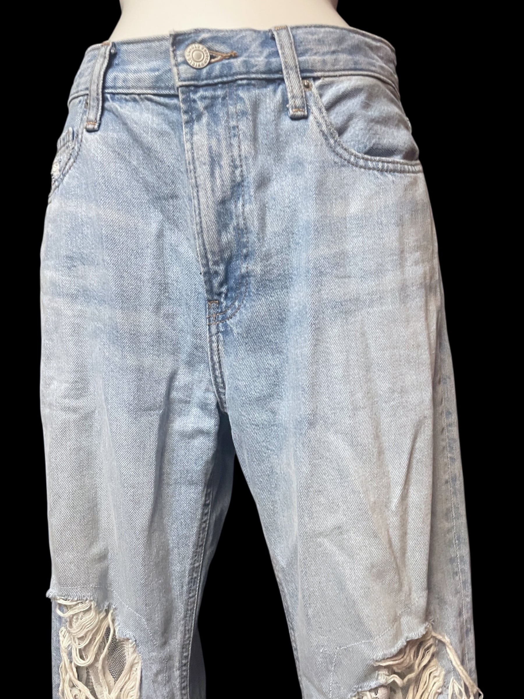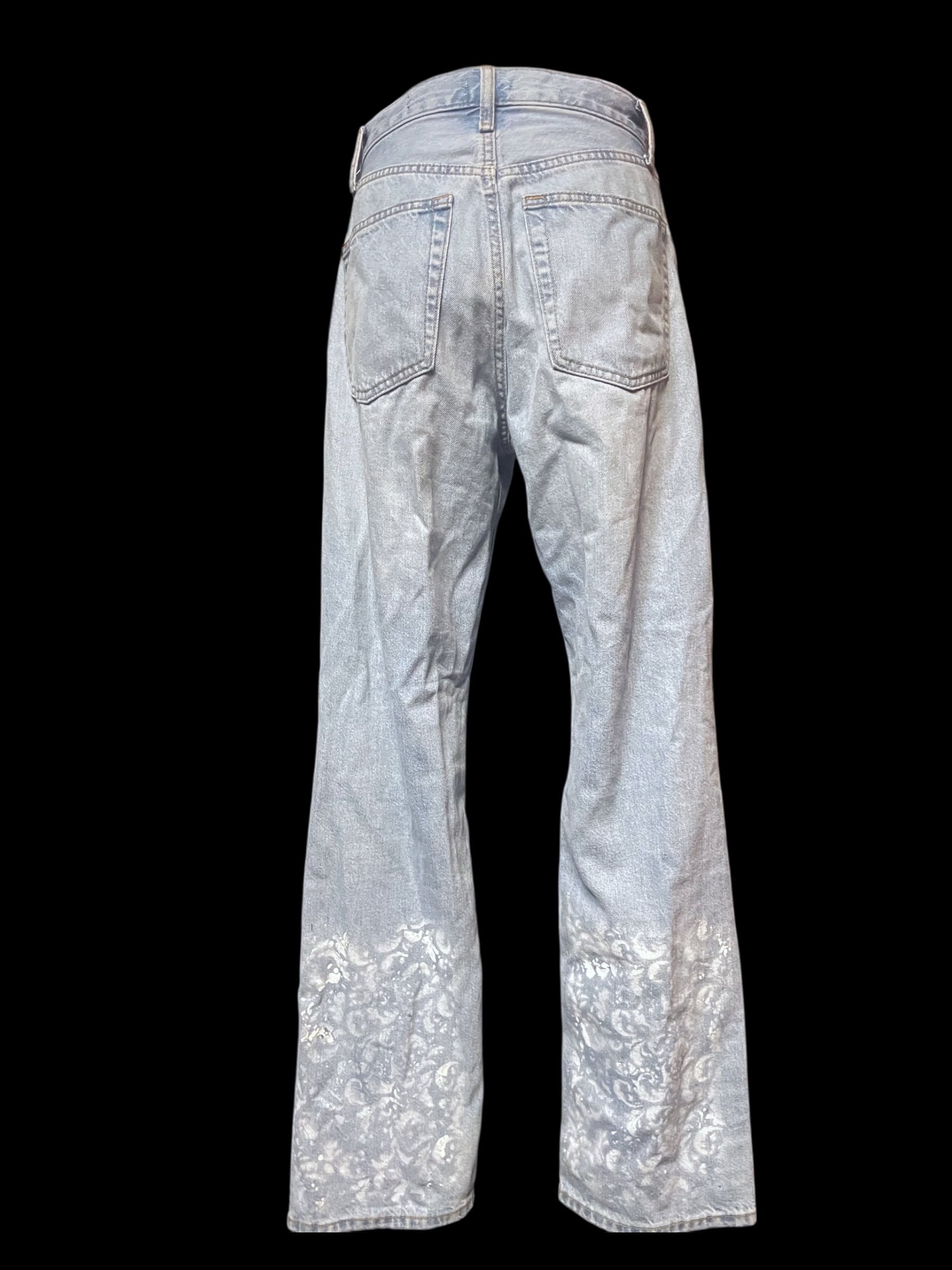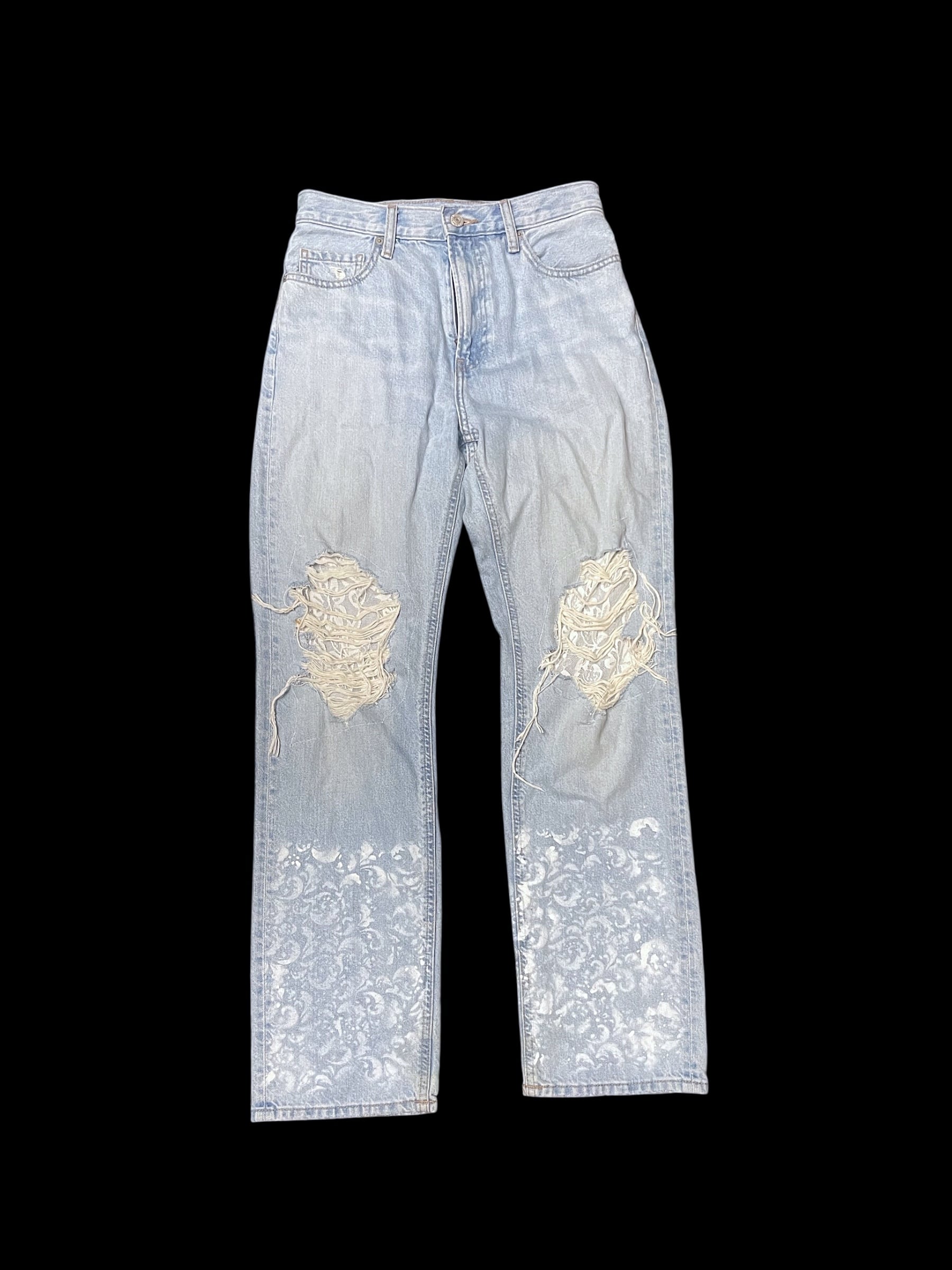 膝のダメージ部分に伸縮性のあるレース生地を入れ、ハードさとフェミニンさをミックスしたデザインに仕上げました。