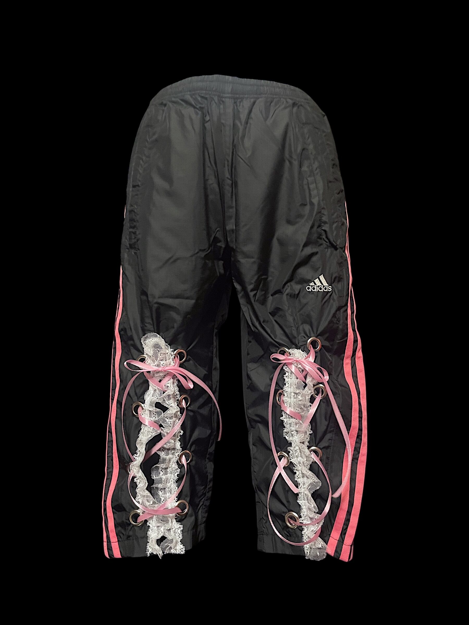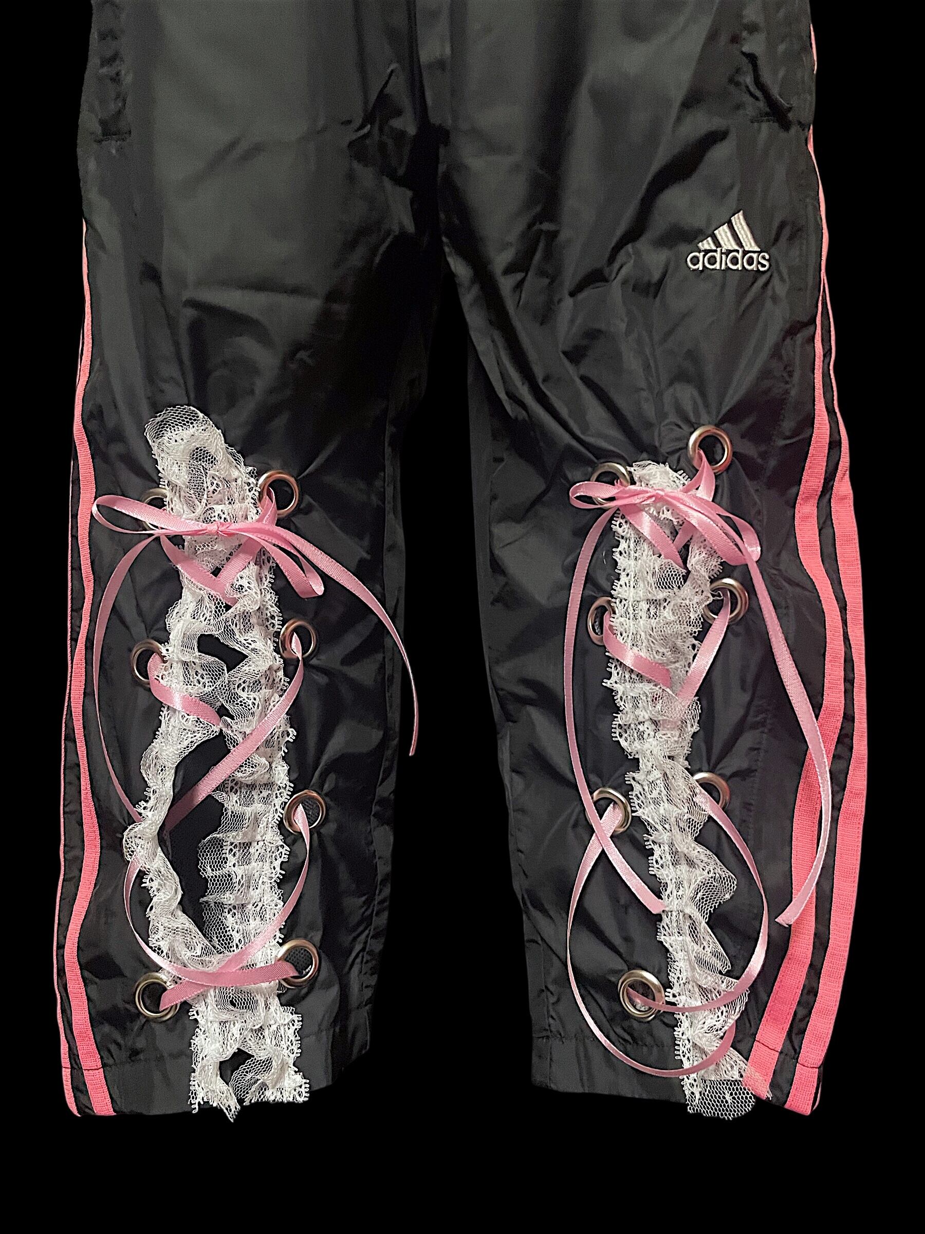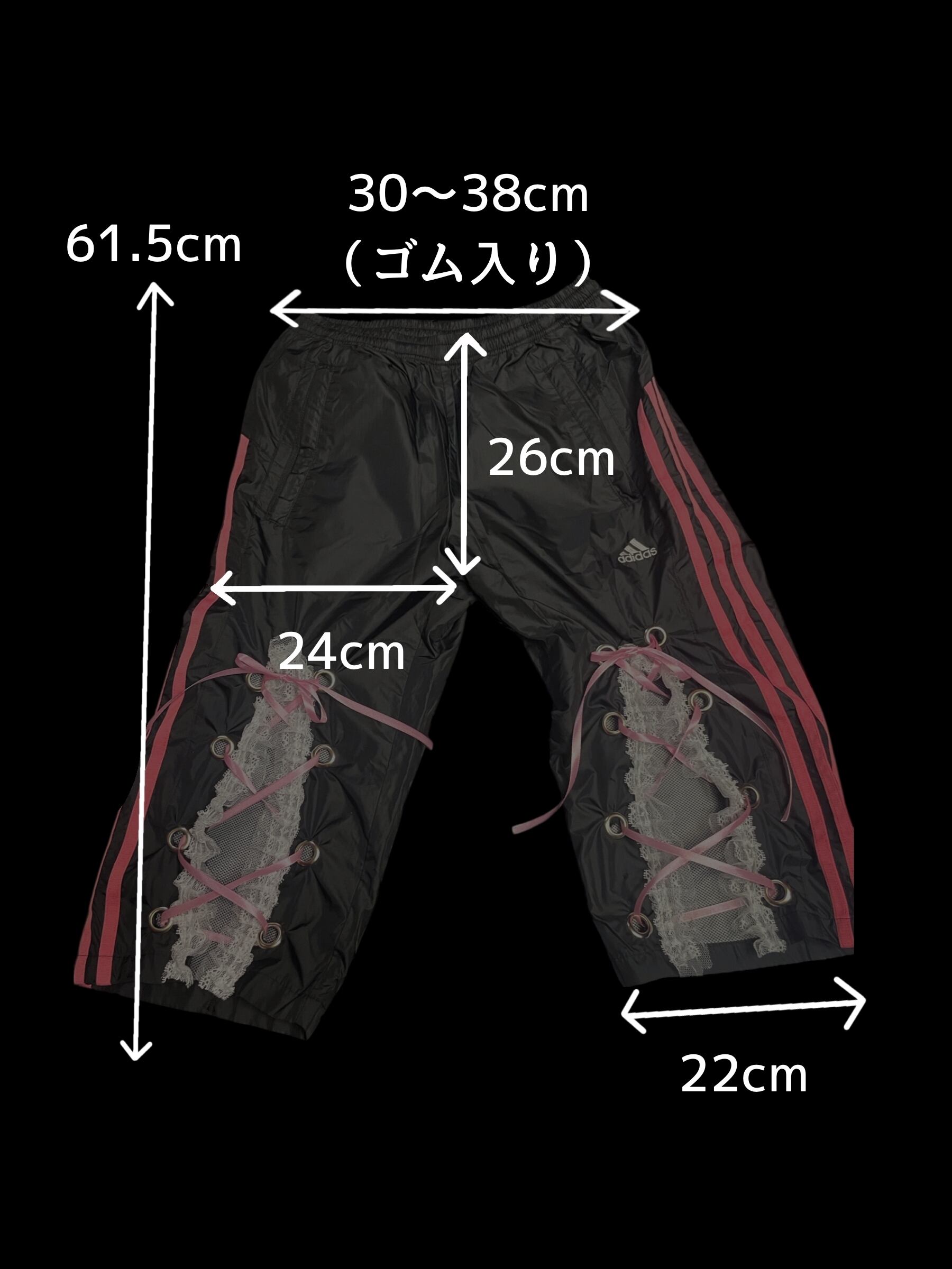 adidasのヴィンテージジャージをベースに、白レースとピンクリボンで大胆に再構築。ストリート×ガーリーの絶妙バランスが目を引くデザイン。スポーティなのにロマンティック、ギャップを楽しめる一点物です。