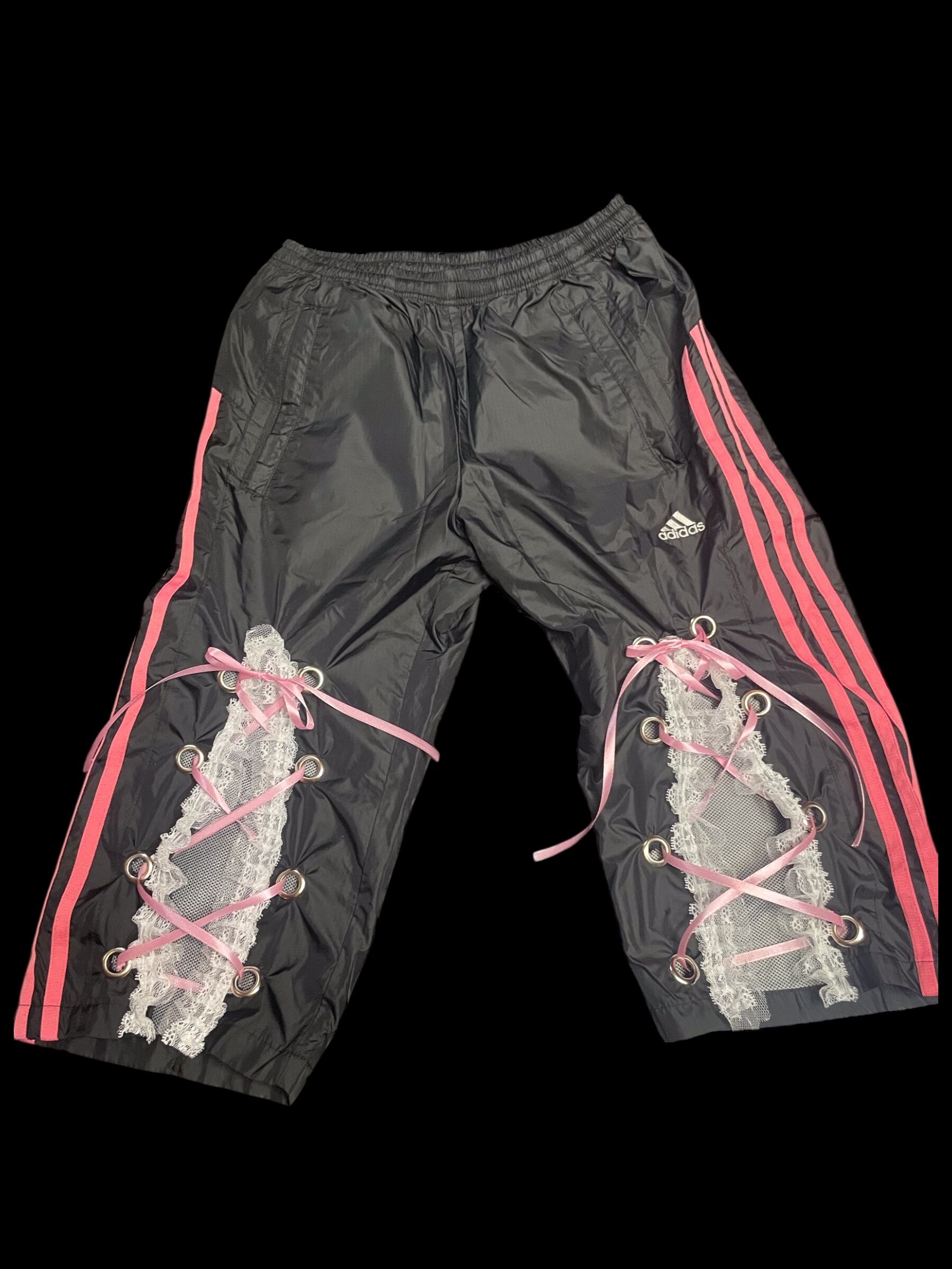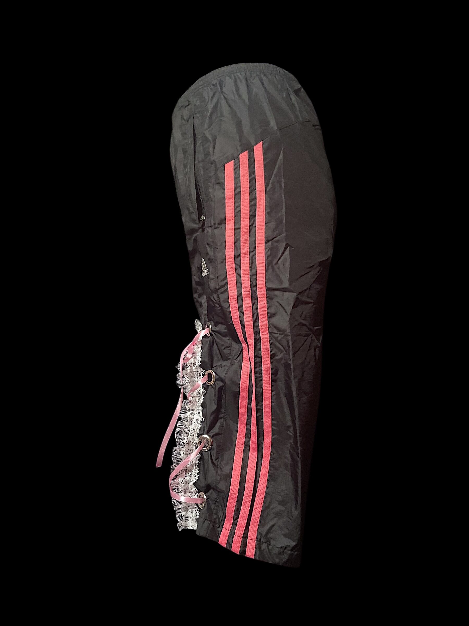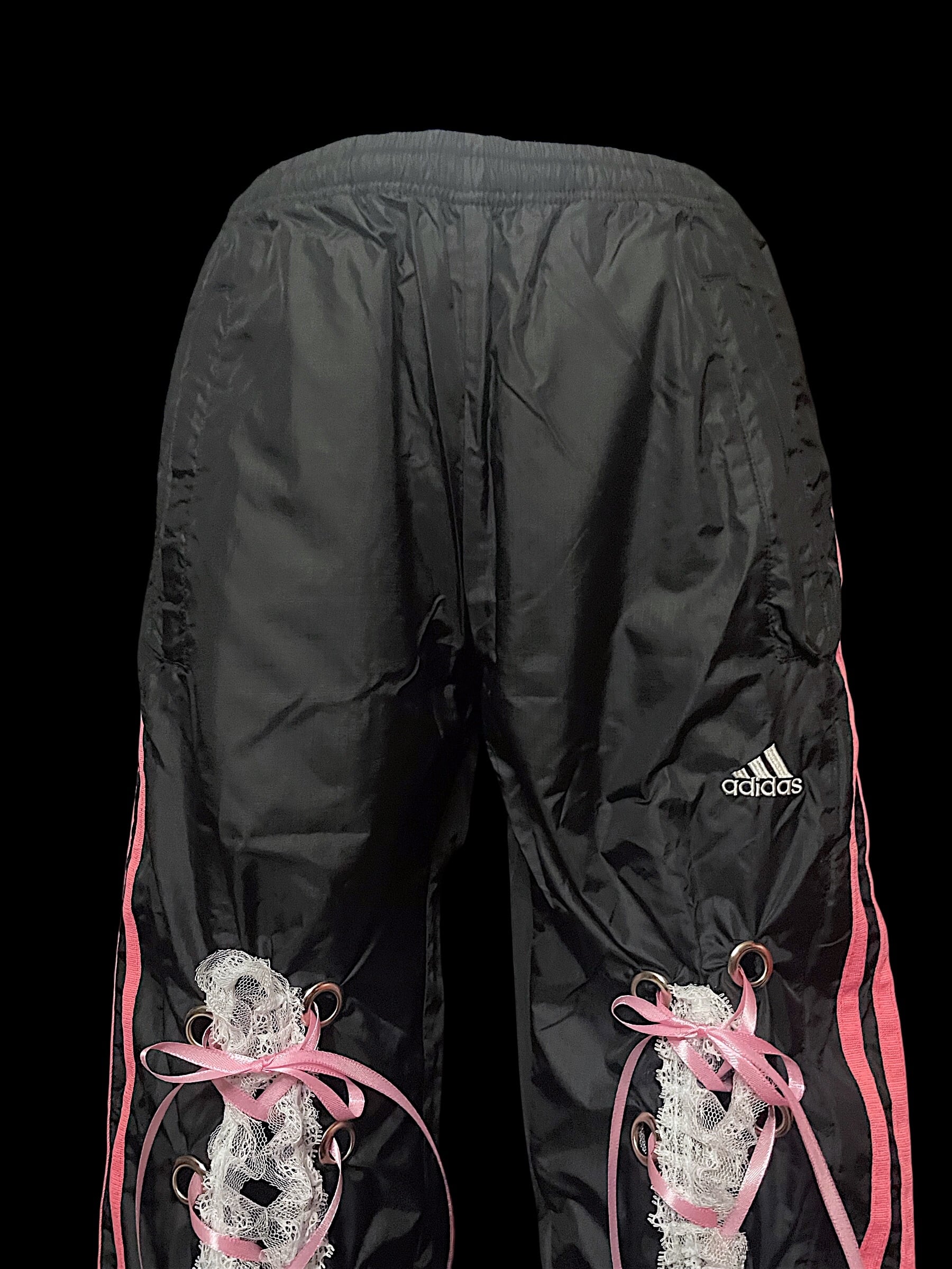 adidasのヴィンテージジャージをベースに、白レースとピンクリボンで大胆に再構築。ストリート×ガーリーの絶妙バランスが目を引くデザイン。スポーティなのにロマンティック、ギャップを楽しめる一点物です。
