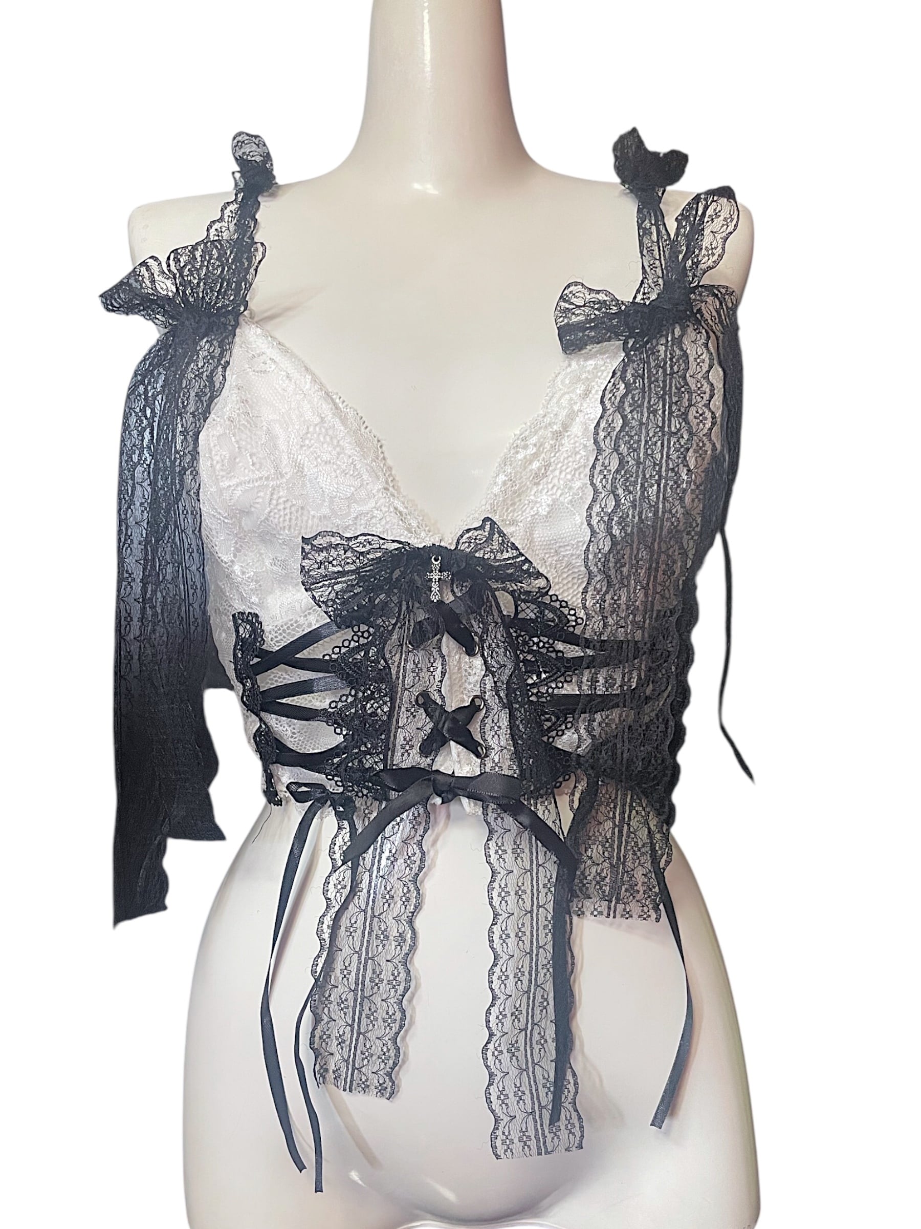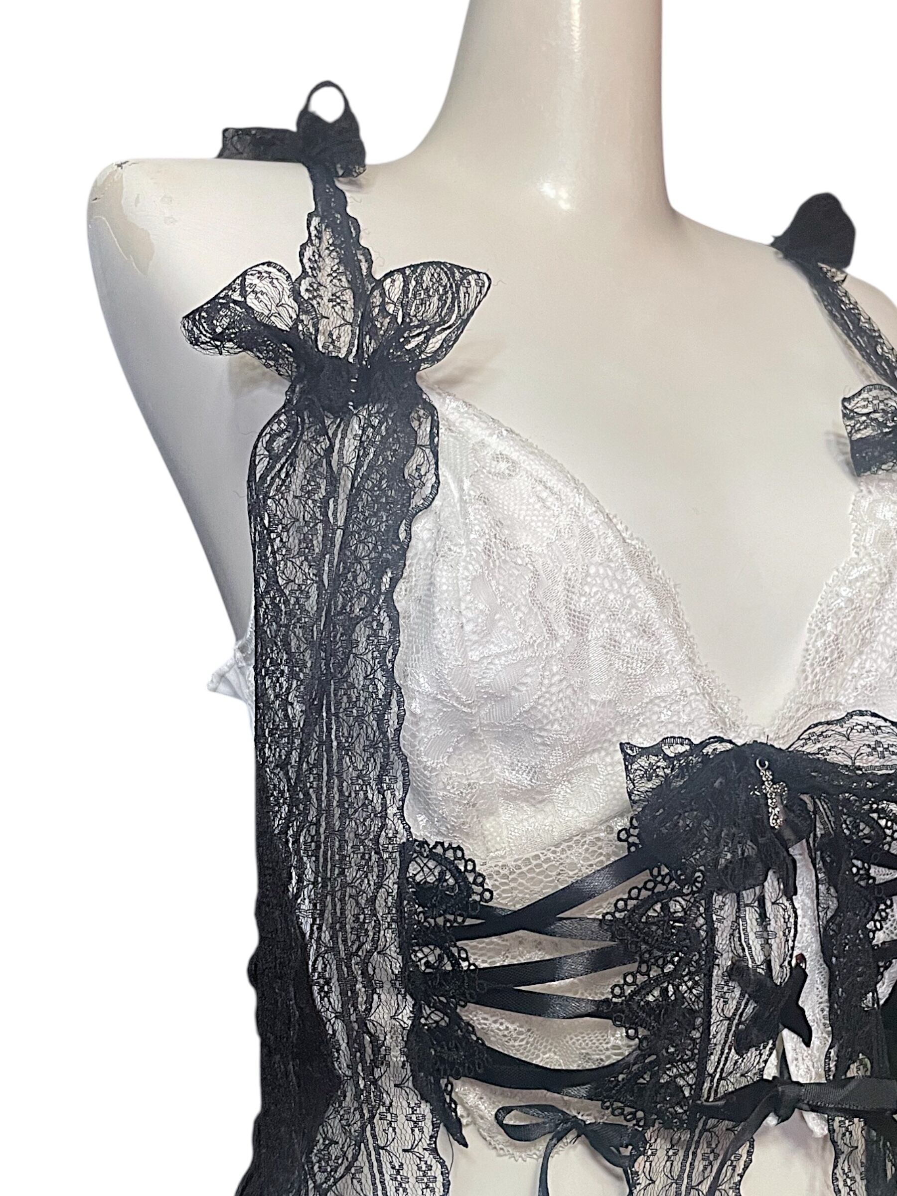 繊細なレースとリボンをたっぷりとあしらった、ゴシックな雰囲気漂うキャミソール。