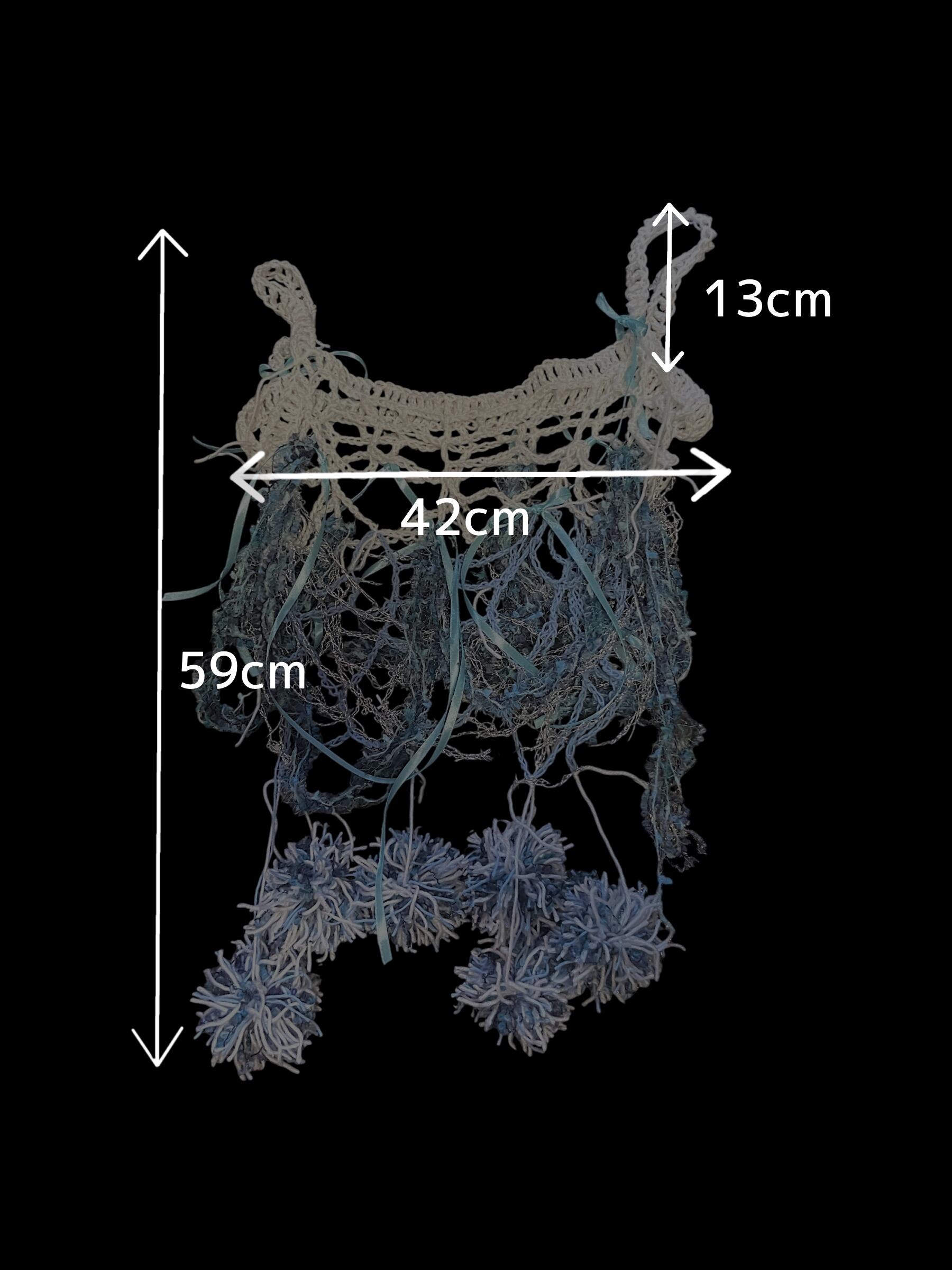 ドレープ感のあるシルエットと、ランダムに垂れる糸、リボン、十字架のチャームがポイントです。