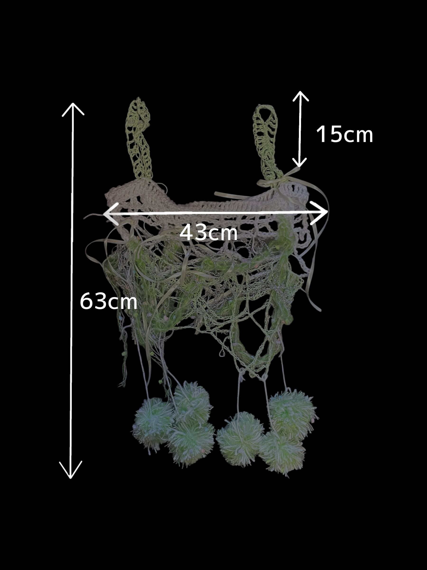 ドレープ感のあるシルエットと、ランダムに垂れる糸、リボン、十字架のチャームがポイントです。