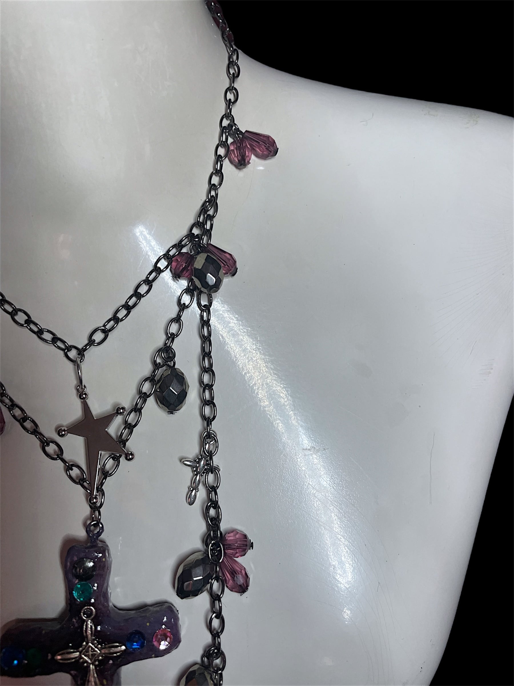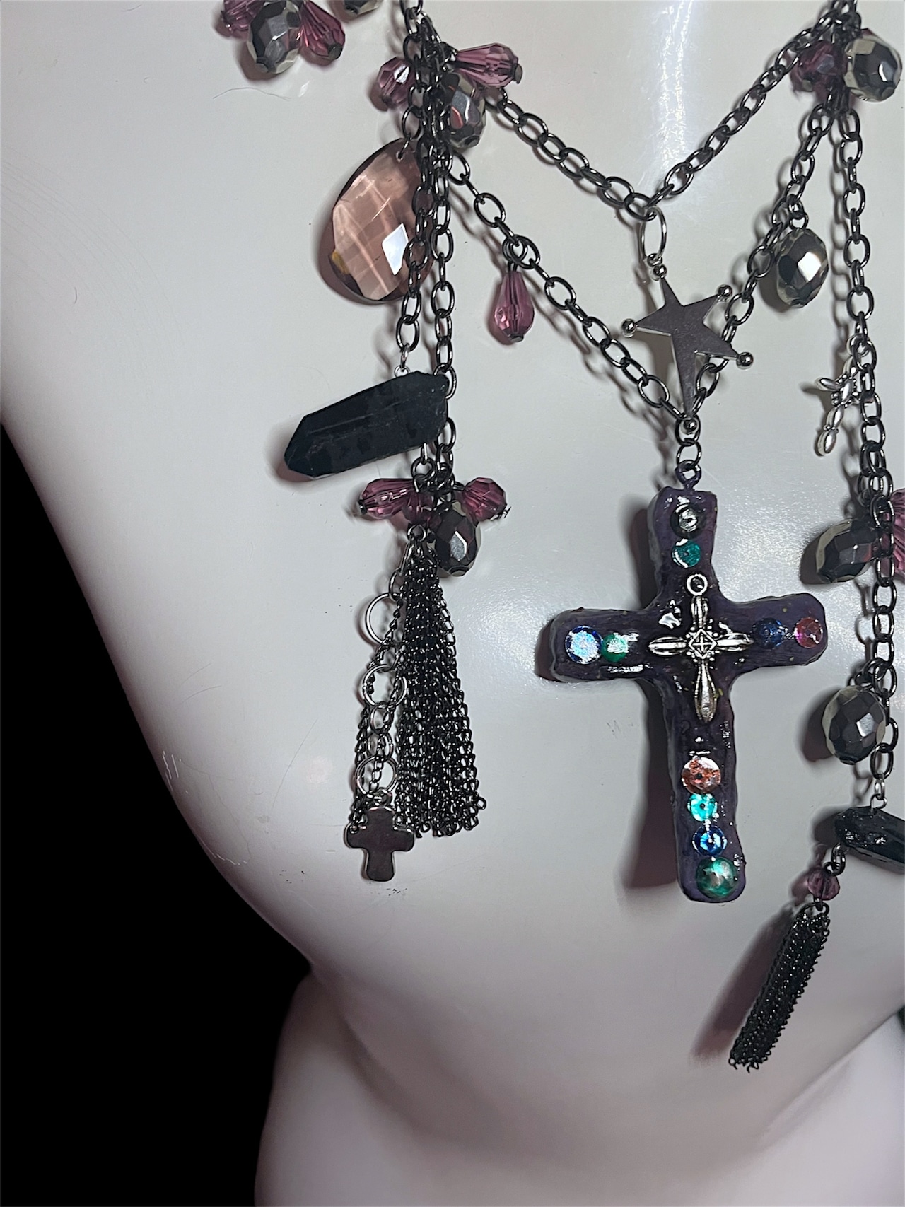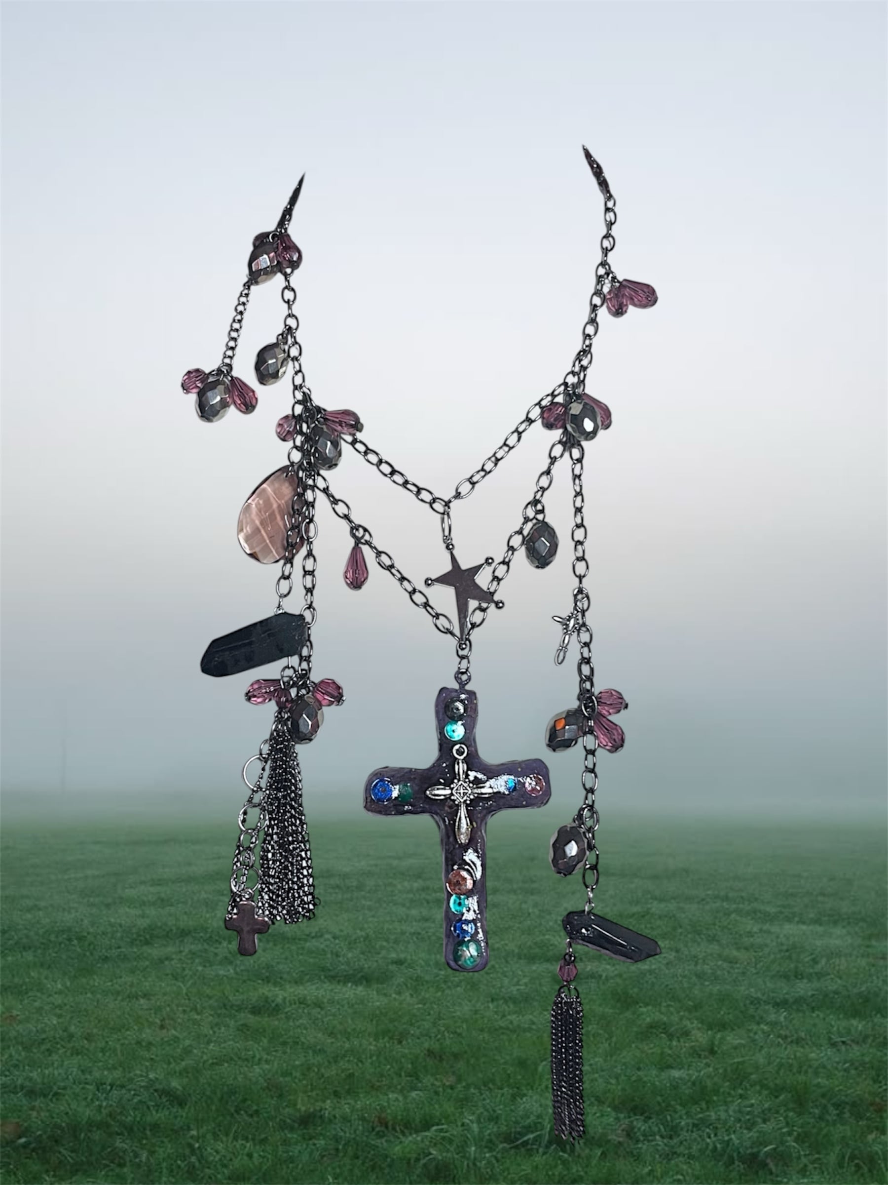 ヴィンテージネックレスを一点一点丁寧に解体し、新たな表情を持たせて再構築しました。クロスは手作業で制作したオリジナルパーツを使っています。