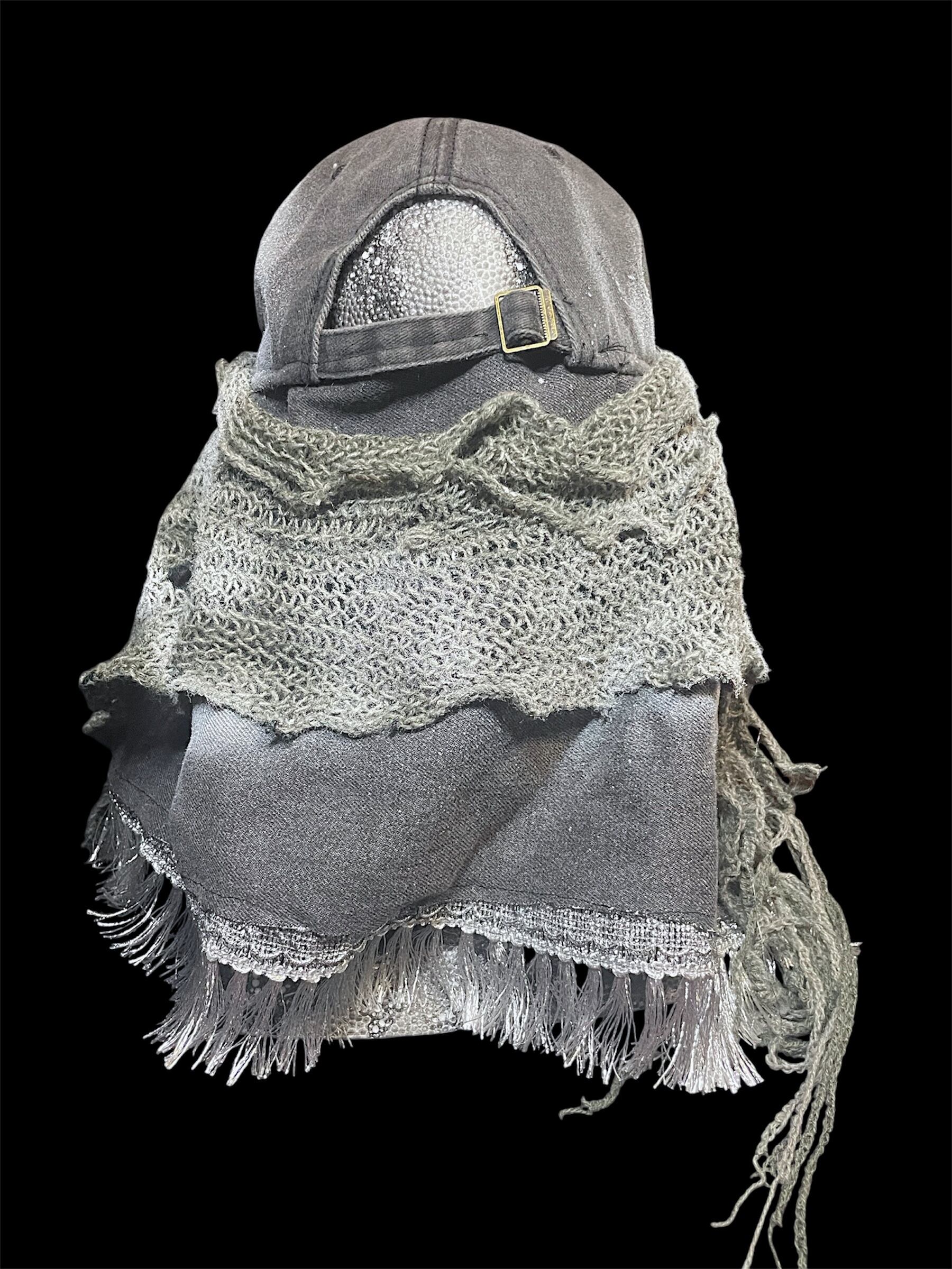 サイドには布やニット素材の装飾が施され、独特の雰囲気を演出。モード系やストリート系のコーディネートのポイントになるアイテムです。