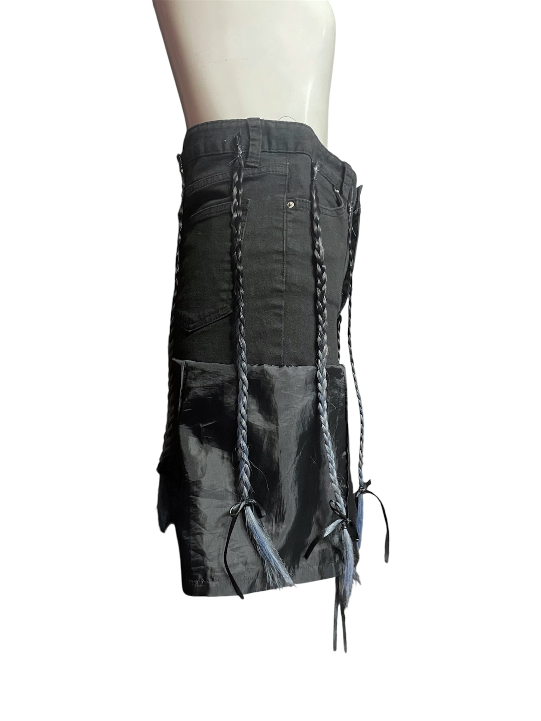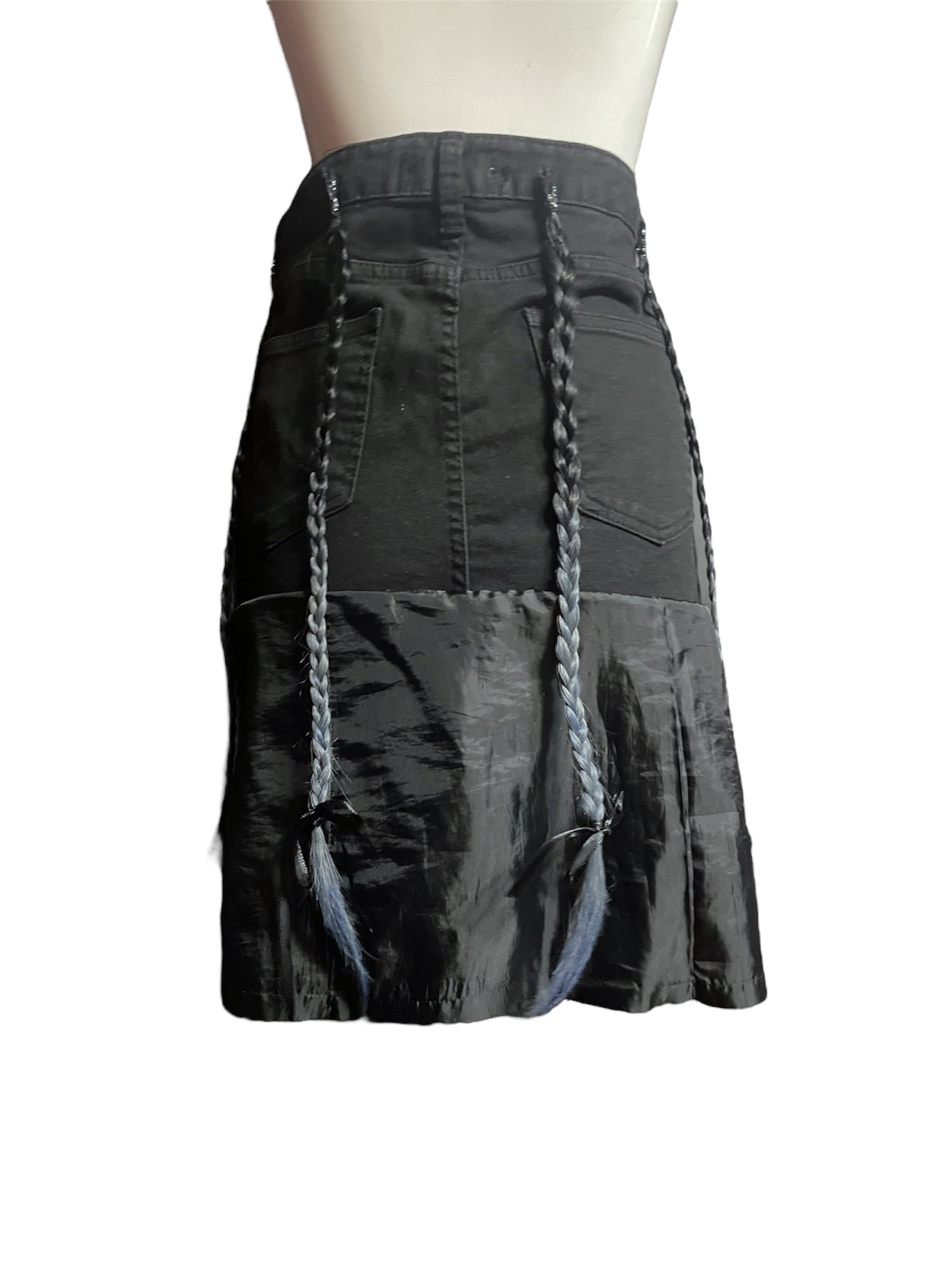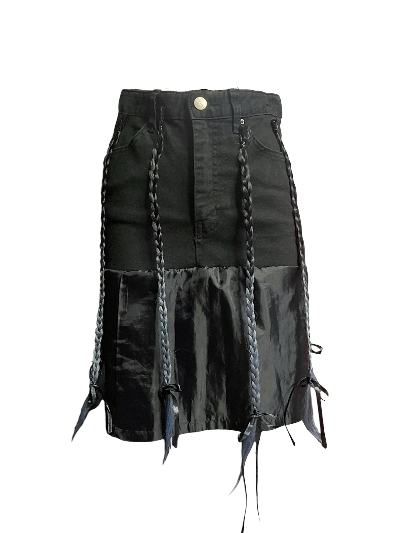 黒デニムにウィッグの毛先を編み込みにしたものを垂らしたインパクト抜群のデザイン。