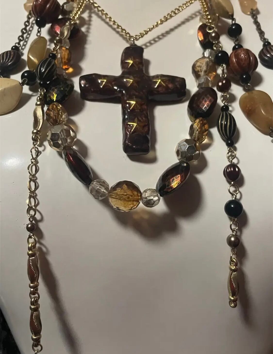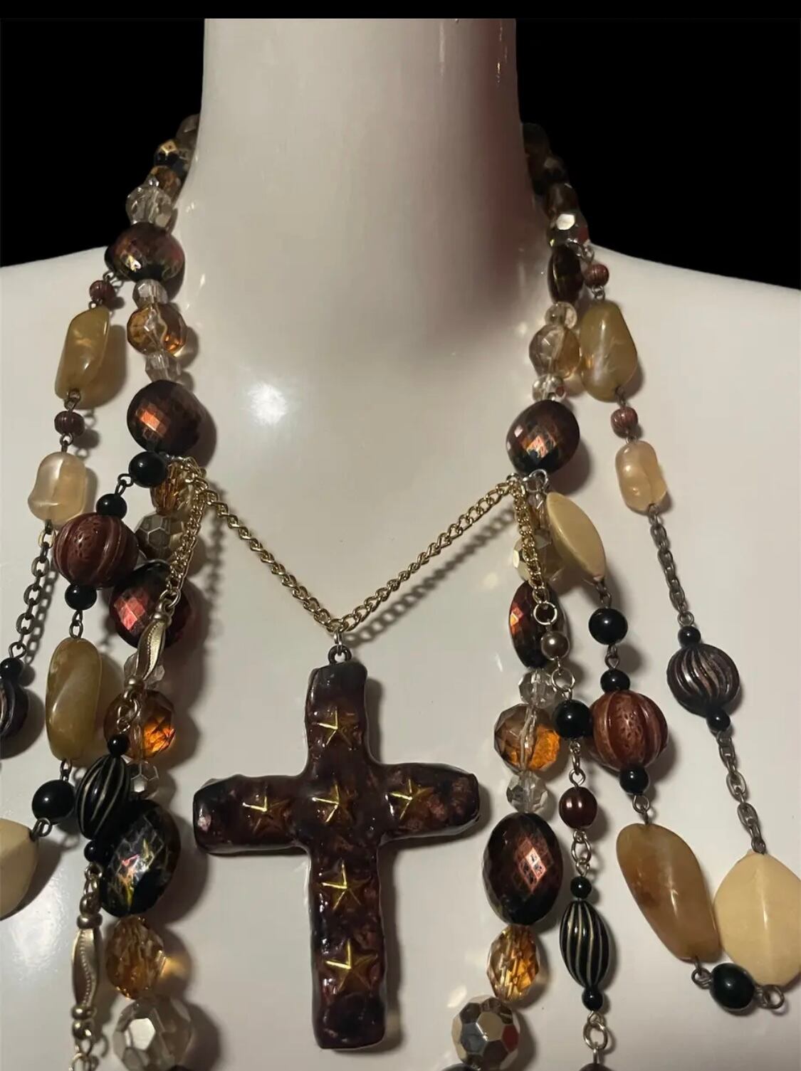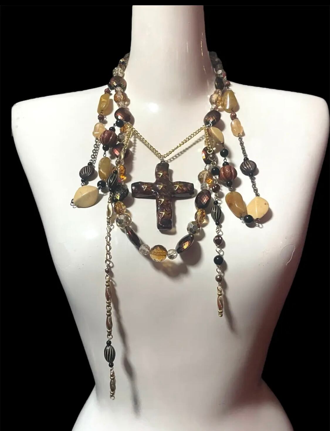 ヴィンテージネックレスを一点一点丁寧に解体し、新たな表情を持たせて再構築しました。十字架は手作業で制作したオリジナルパーツを使っています。