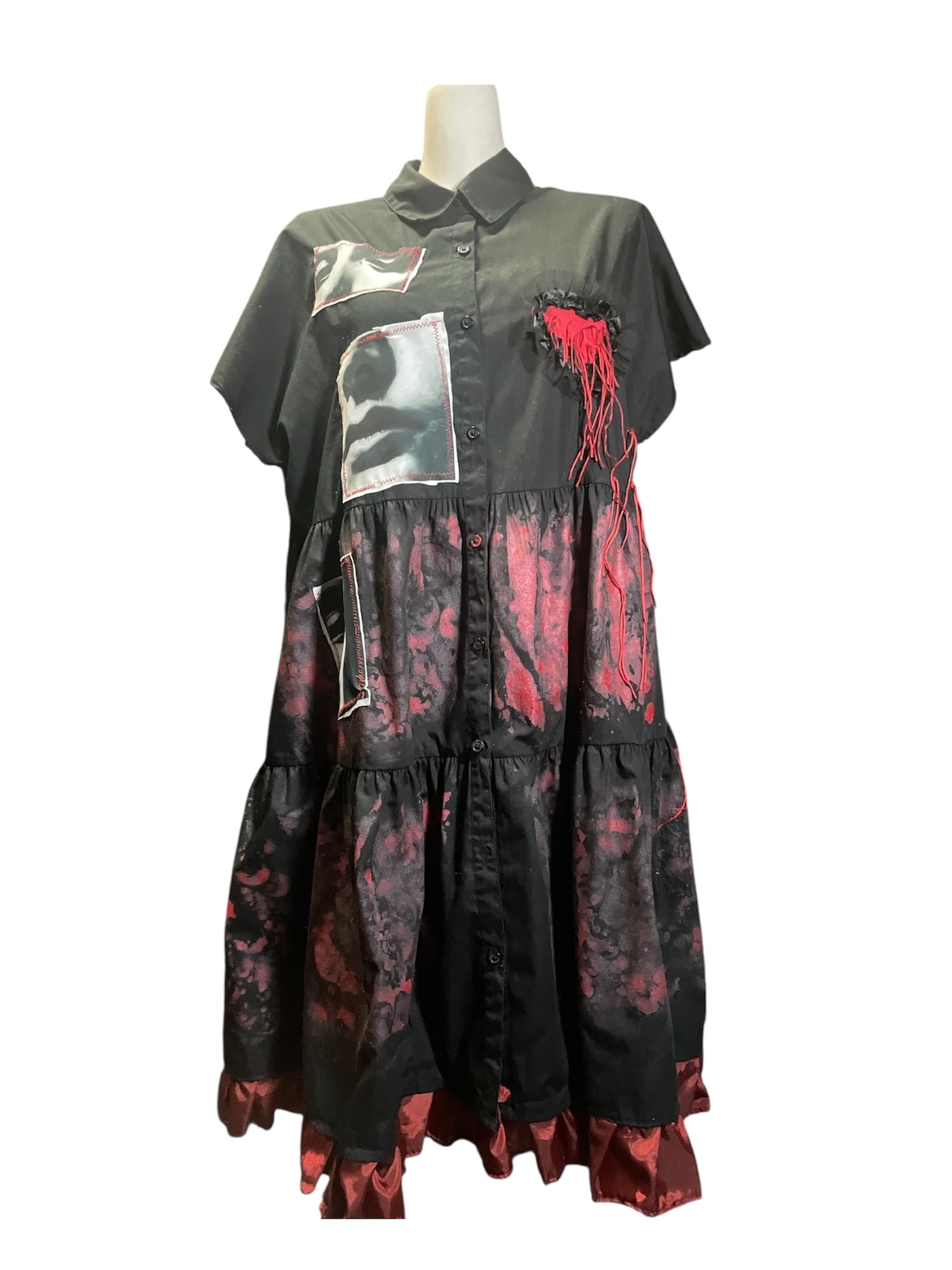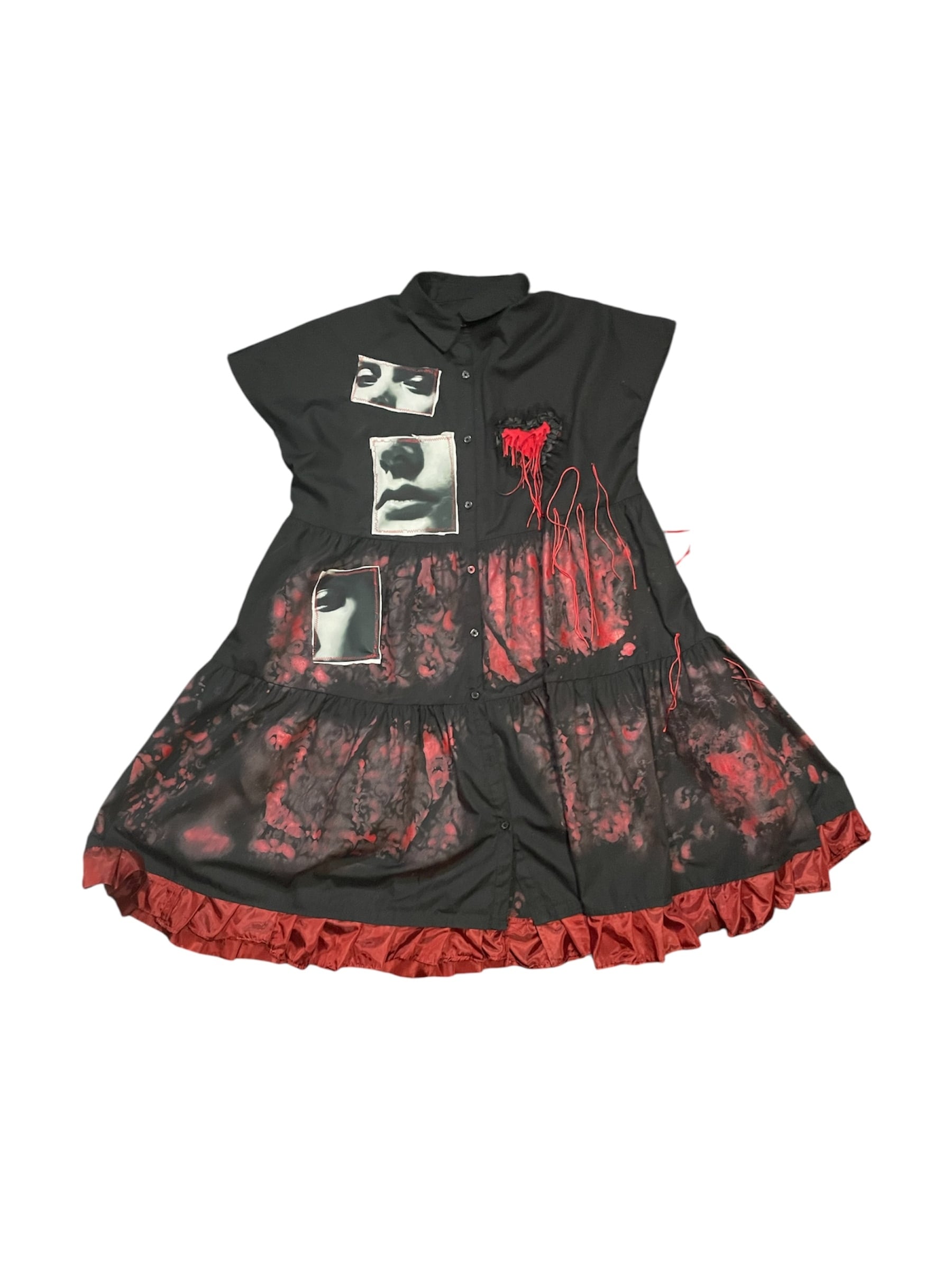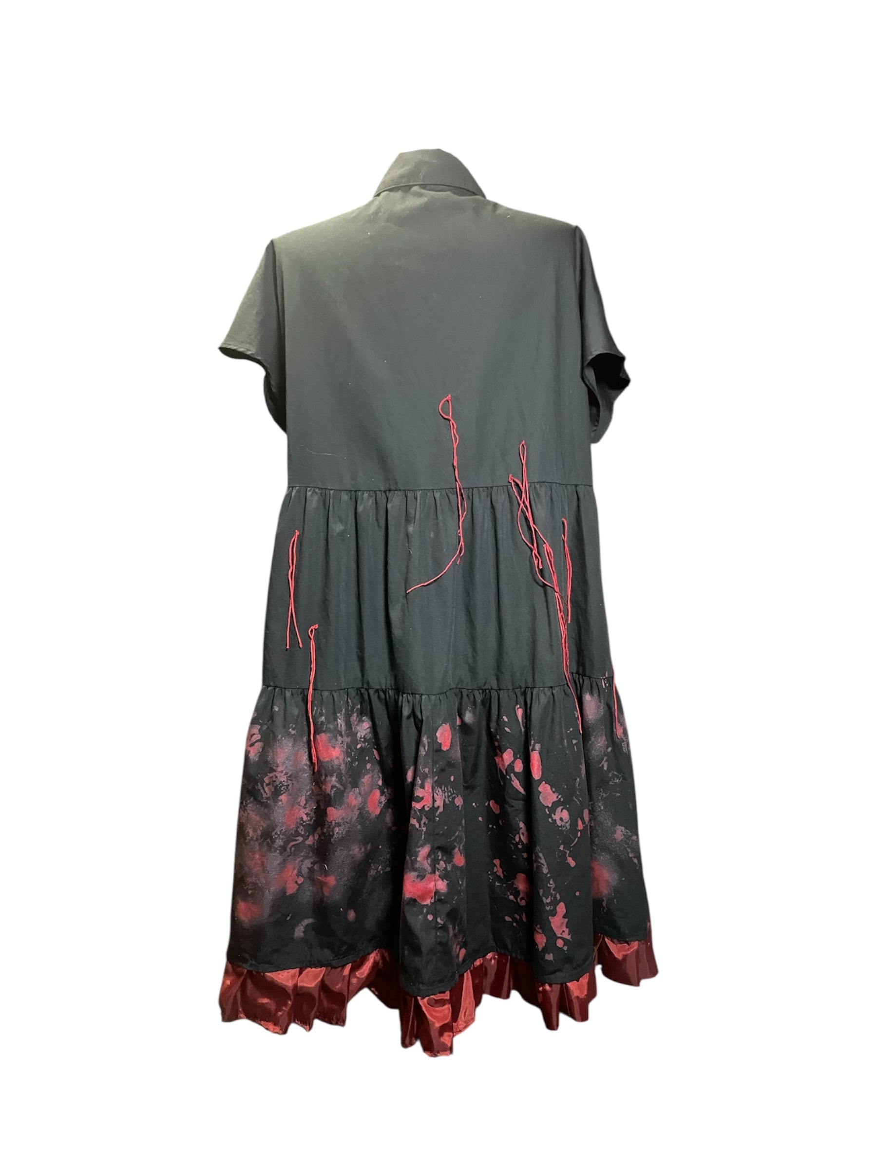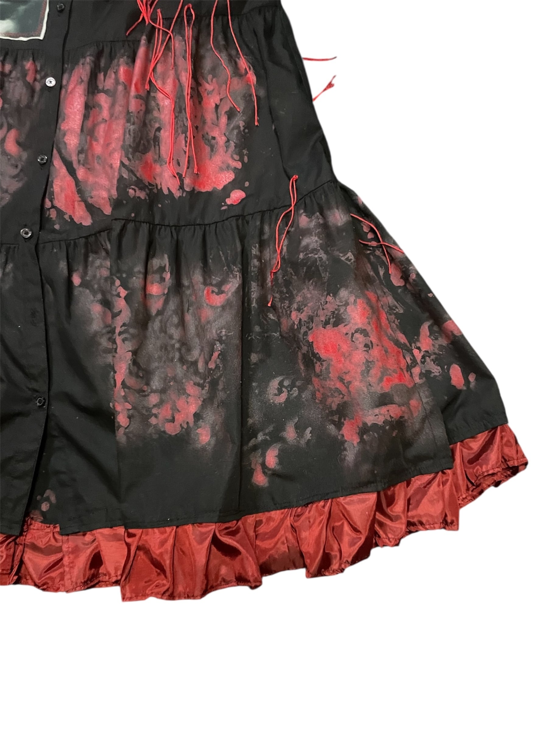 黒のワンピースに赤のスプレーアートや刺繍、コラージュ、フリルなどを組み合わせ、ダークでアートな一着に仕立てました。