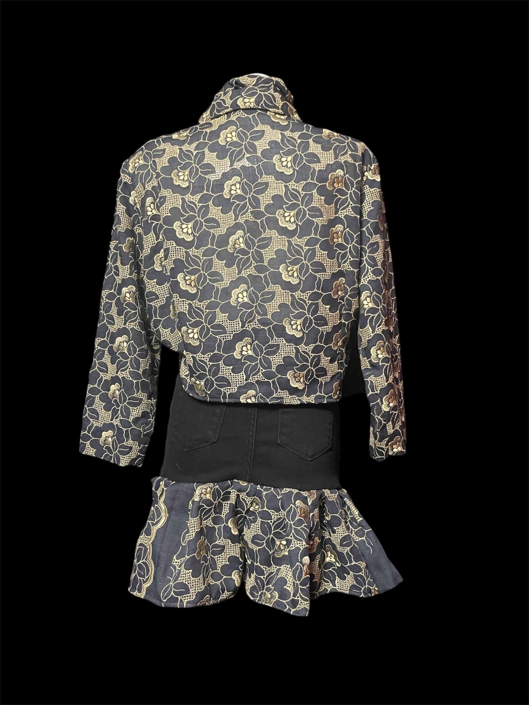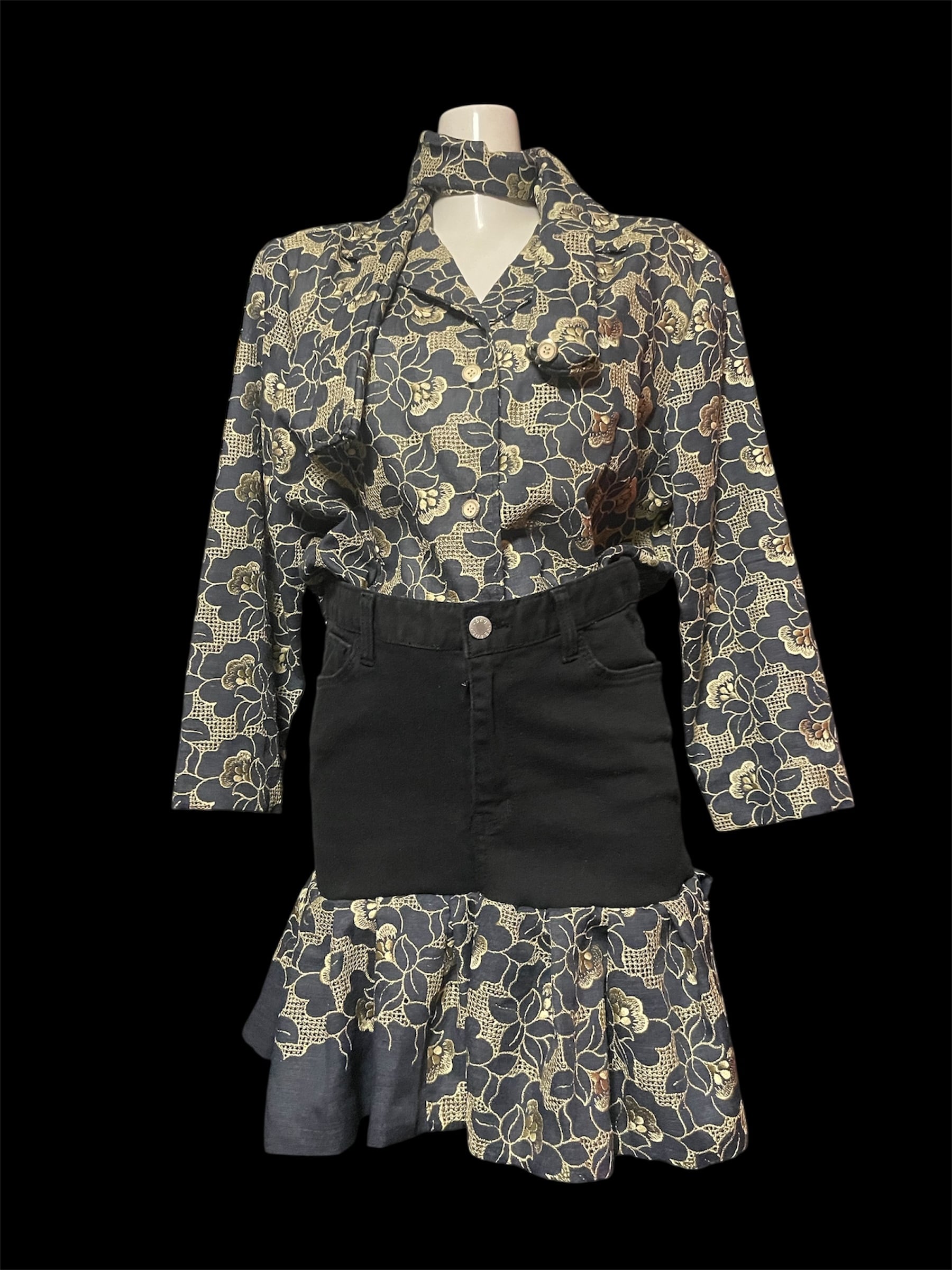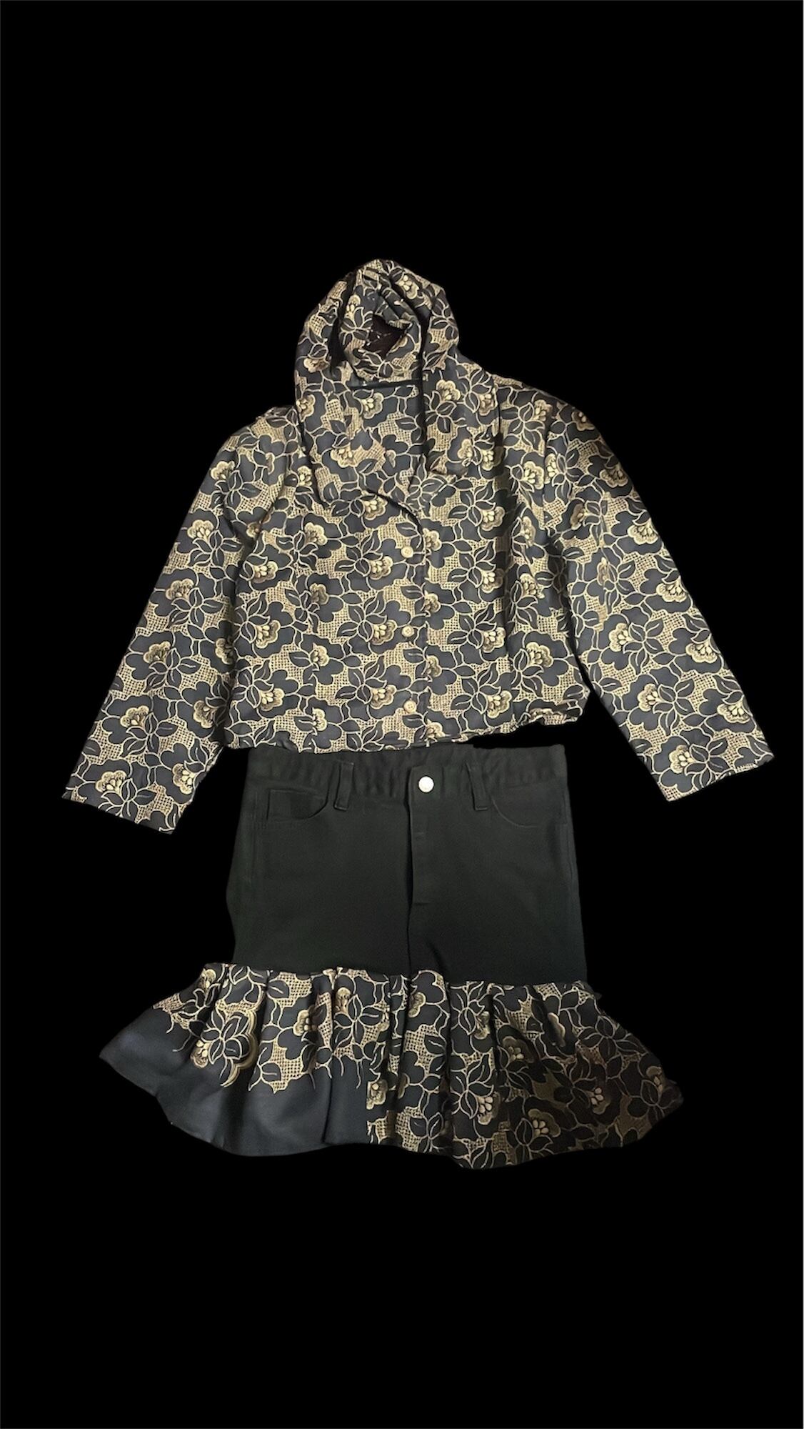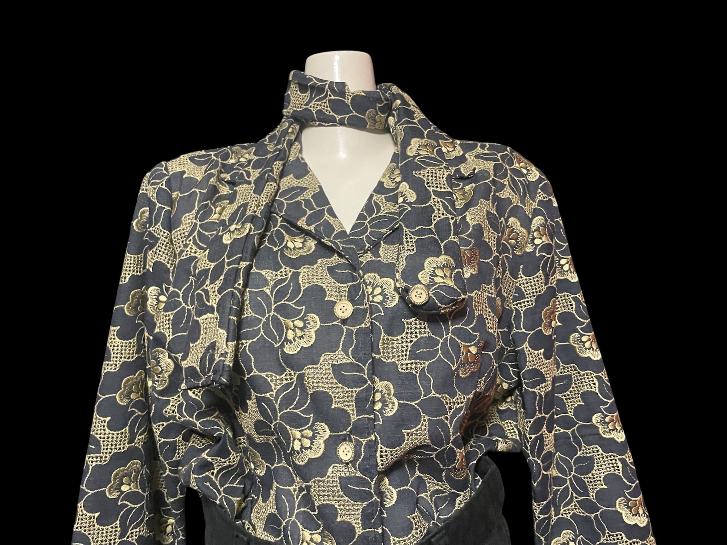 ジャケット・スカート・スカーフの3点が揃ったエレガントなセットアップ。