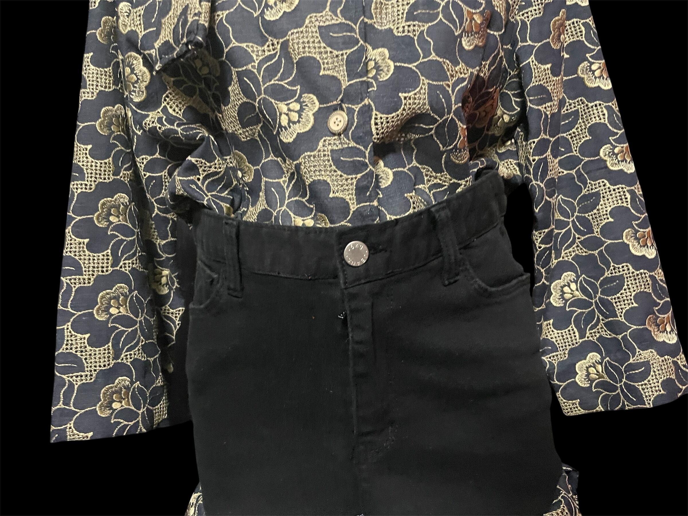 黒地にゴールド系の花柄が映える華やかなデザインで、クラシカルながらモード感も漂います。スカーフは首元に巻いたり、ヘアアクセやバッグにアレンジしたりと、多様なスタイリングが可能です。
