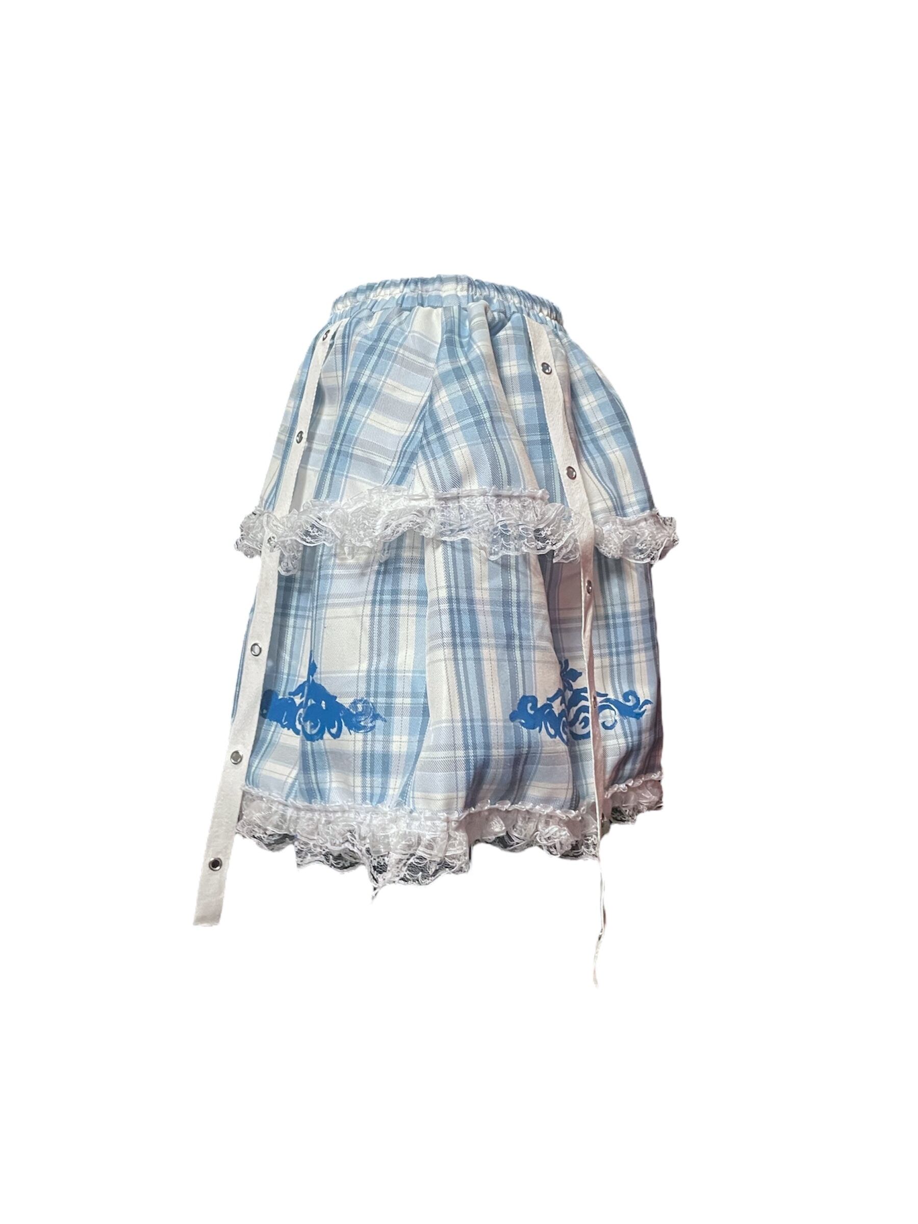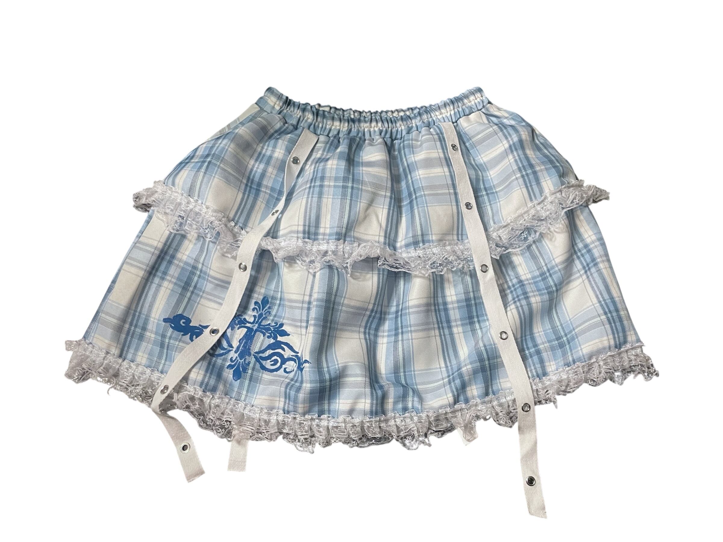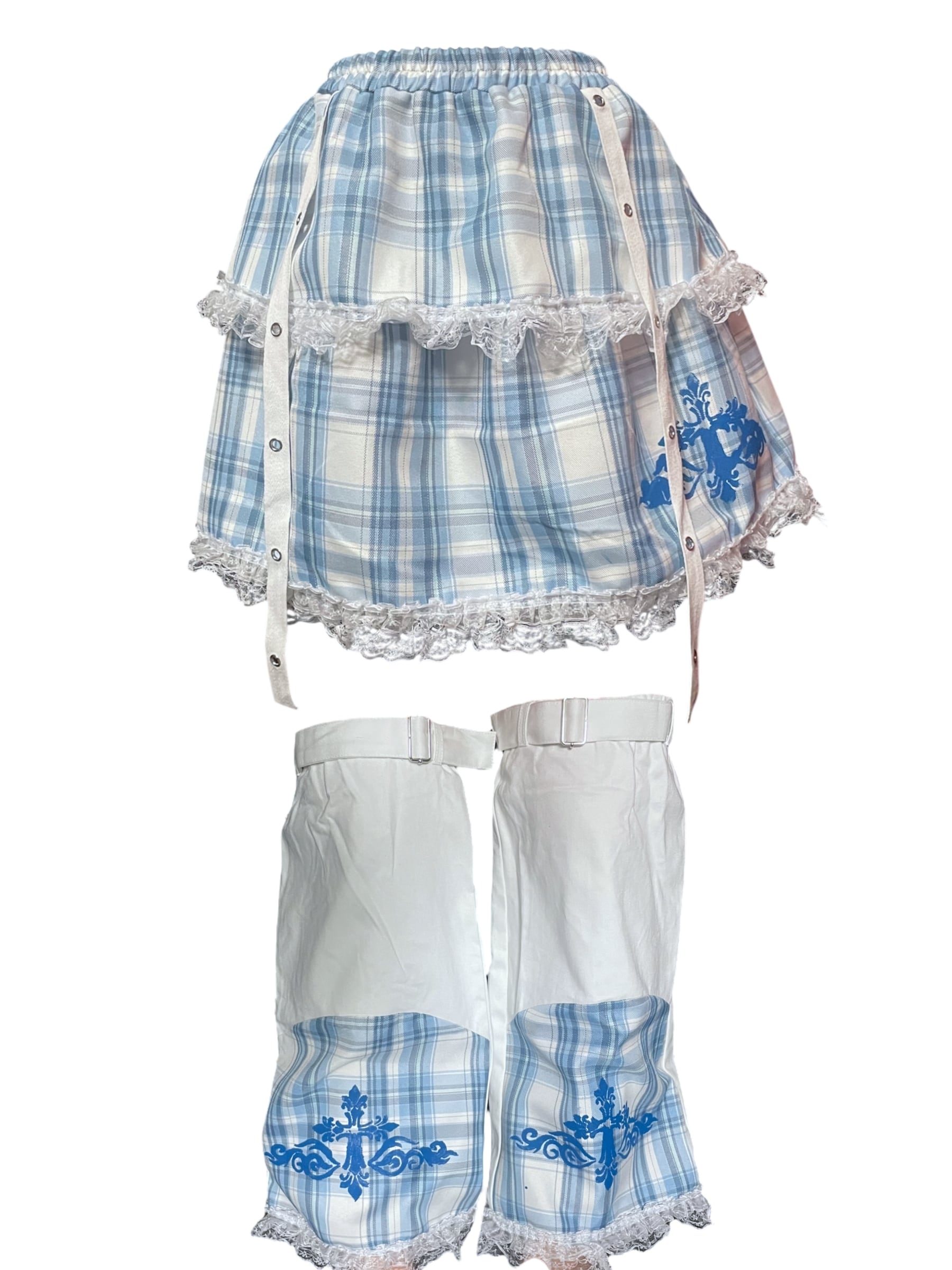 ブルーチェック柄のスカートと、レッグウォーマーのセットアップ。レースやリボンの装飾が可愛らしさを引き立てつつ、クロスがアクセントとなり、甘さの中にクールな雰囲気をプラスしています。