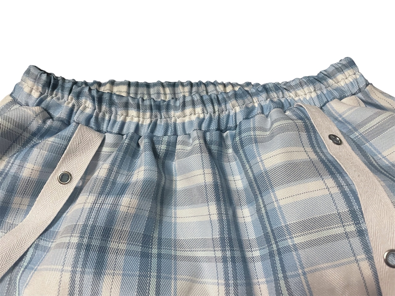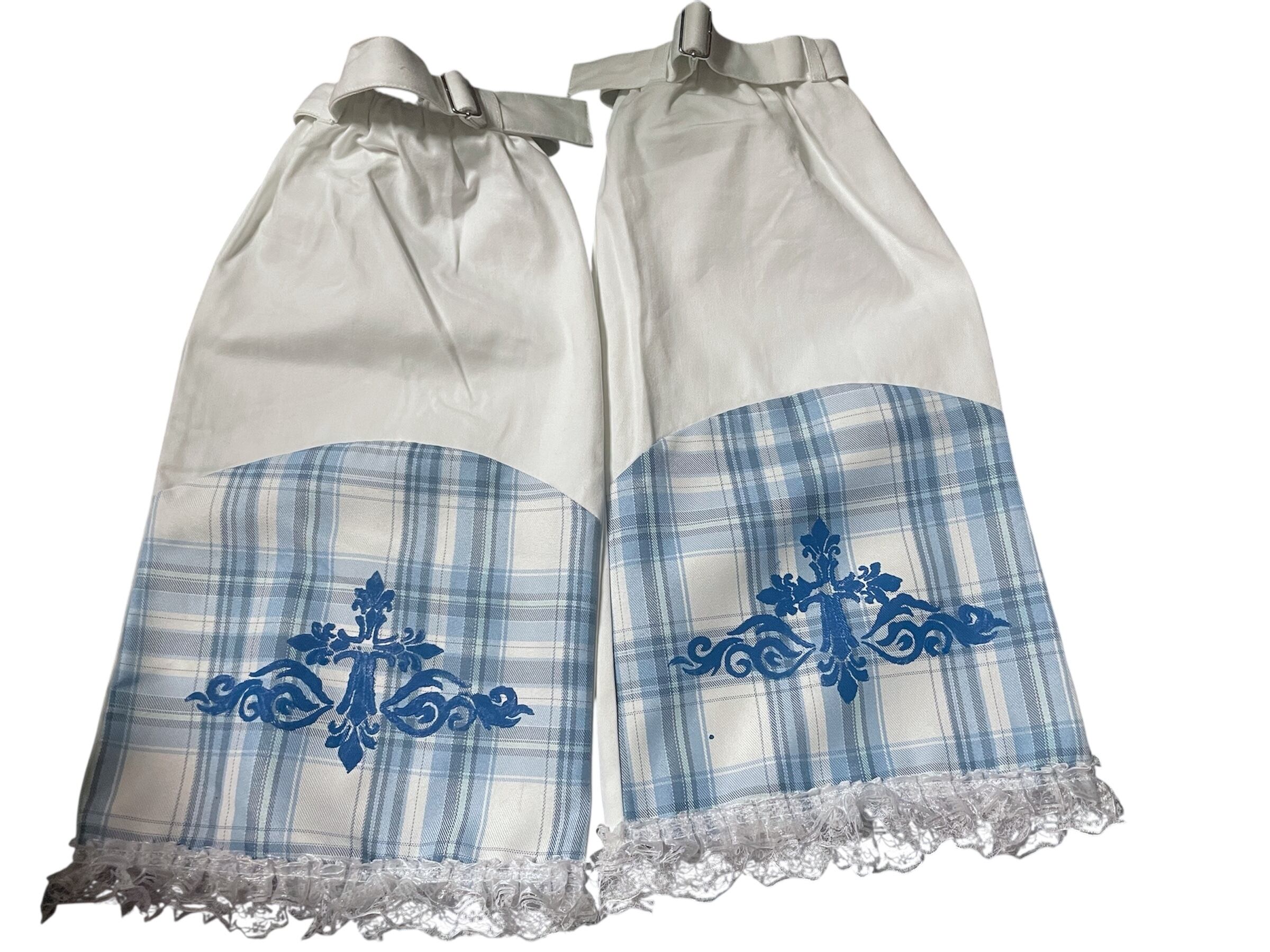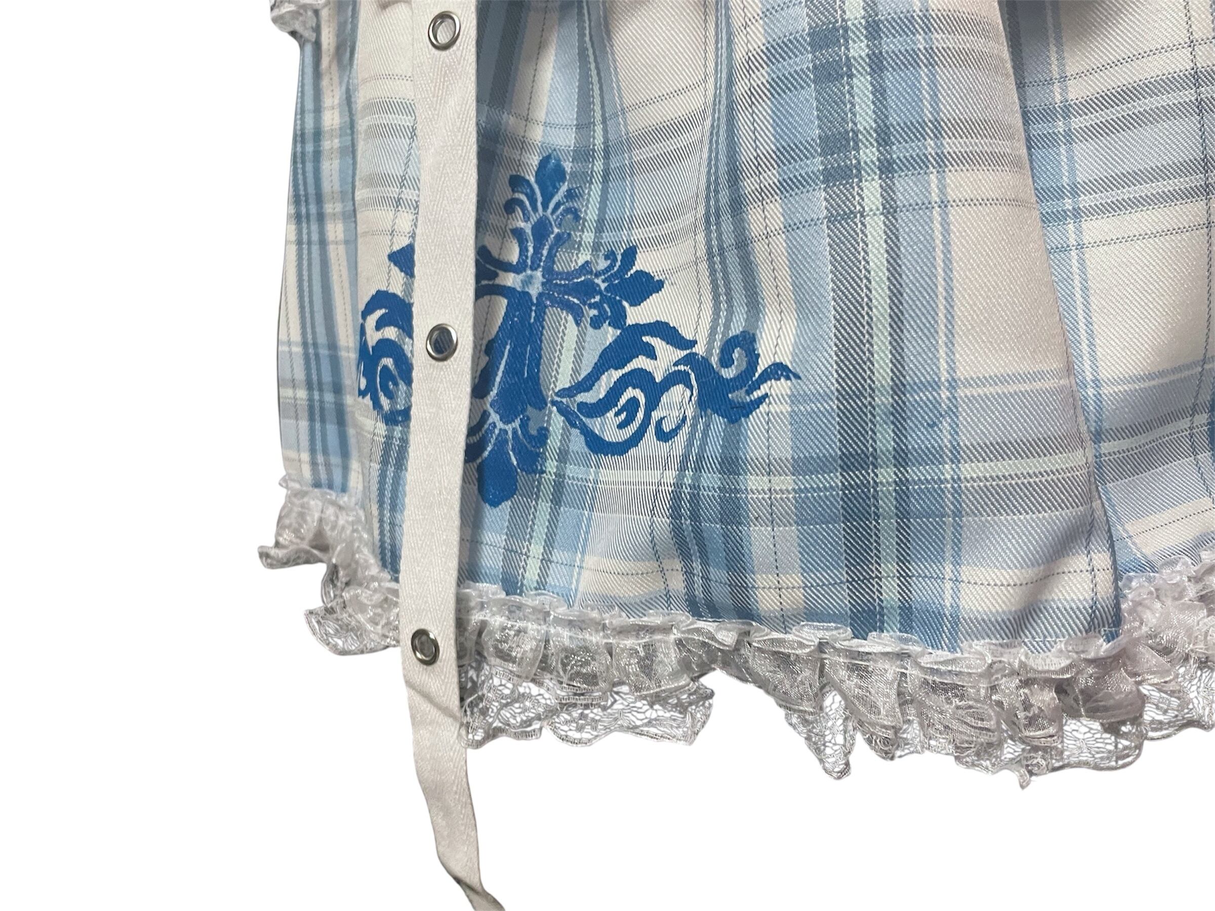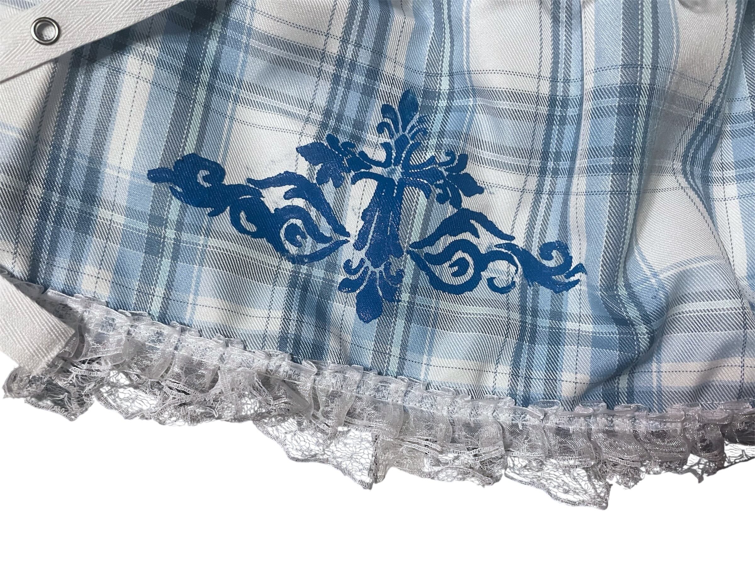 ブルーチェック柄のスカートと、レッグウォーマーのセットアップ。レースやリボンの装飾が可愛らしさを引き立てつつ、クロスがアクセントとなり、甘さの中にクールな雰囲気をプラスしています。