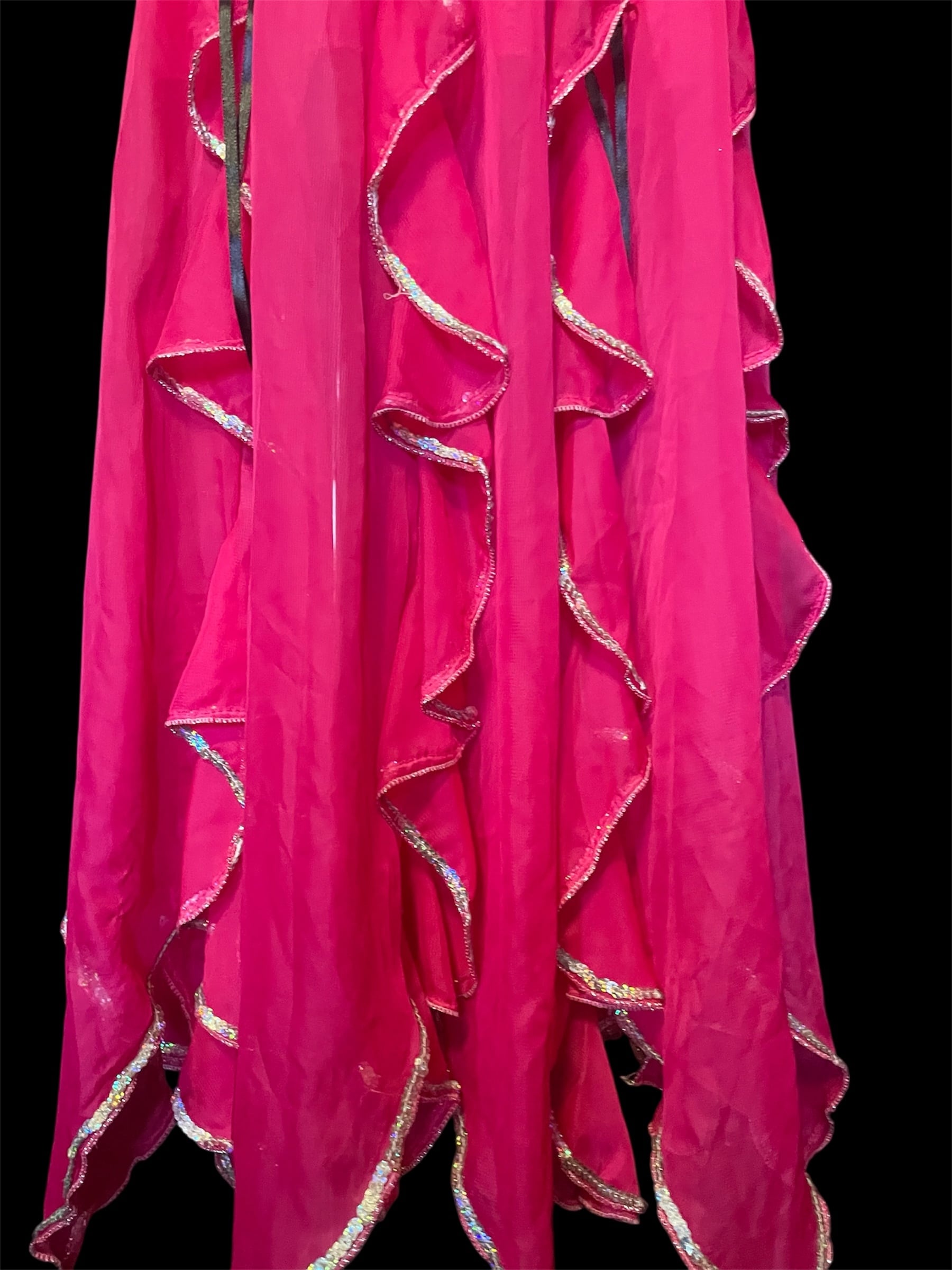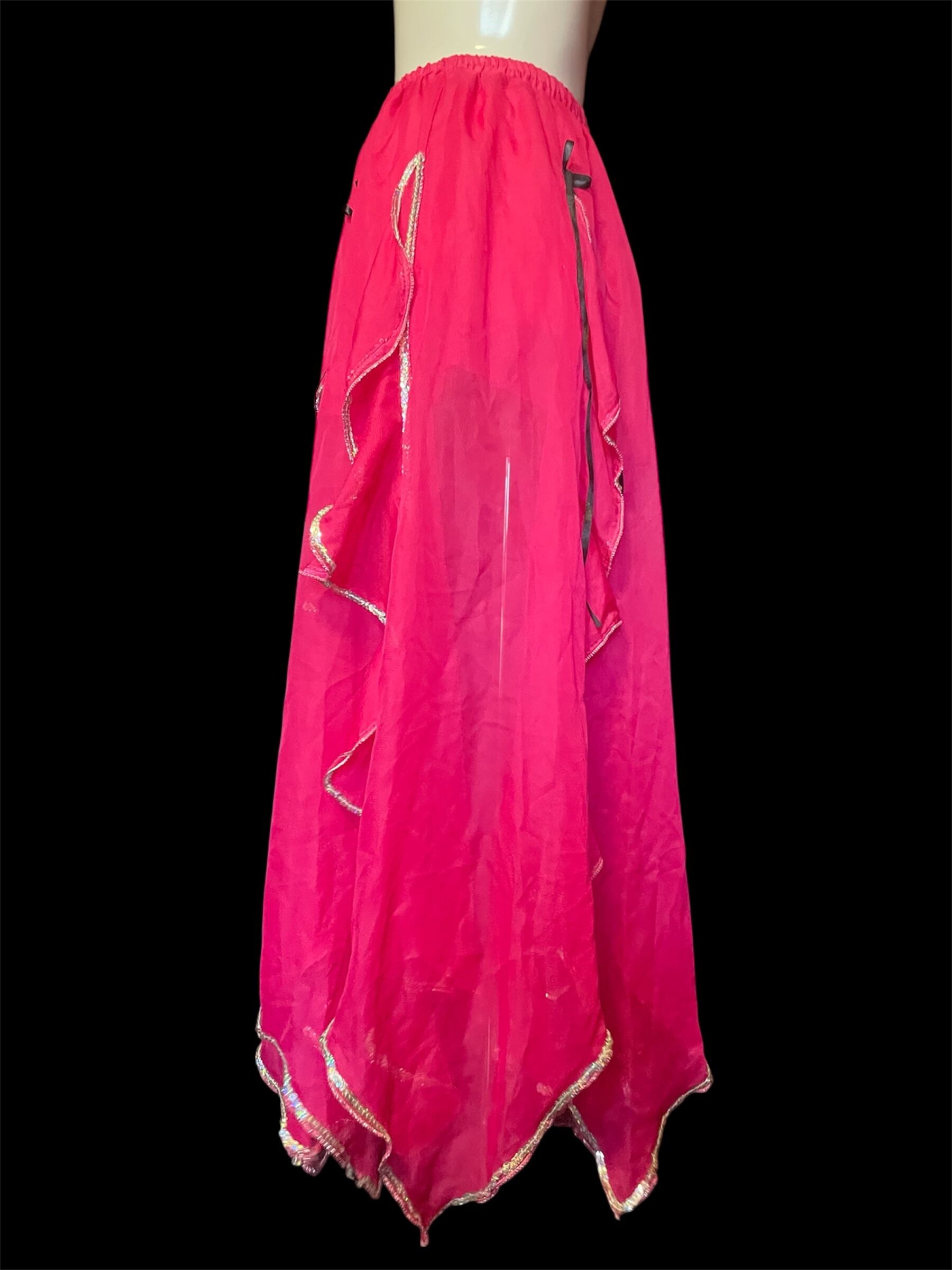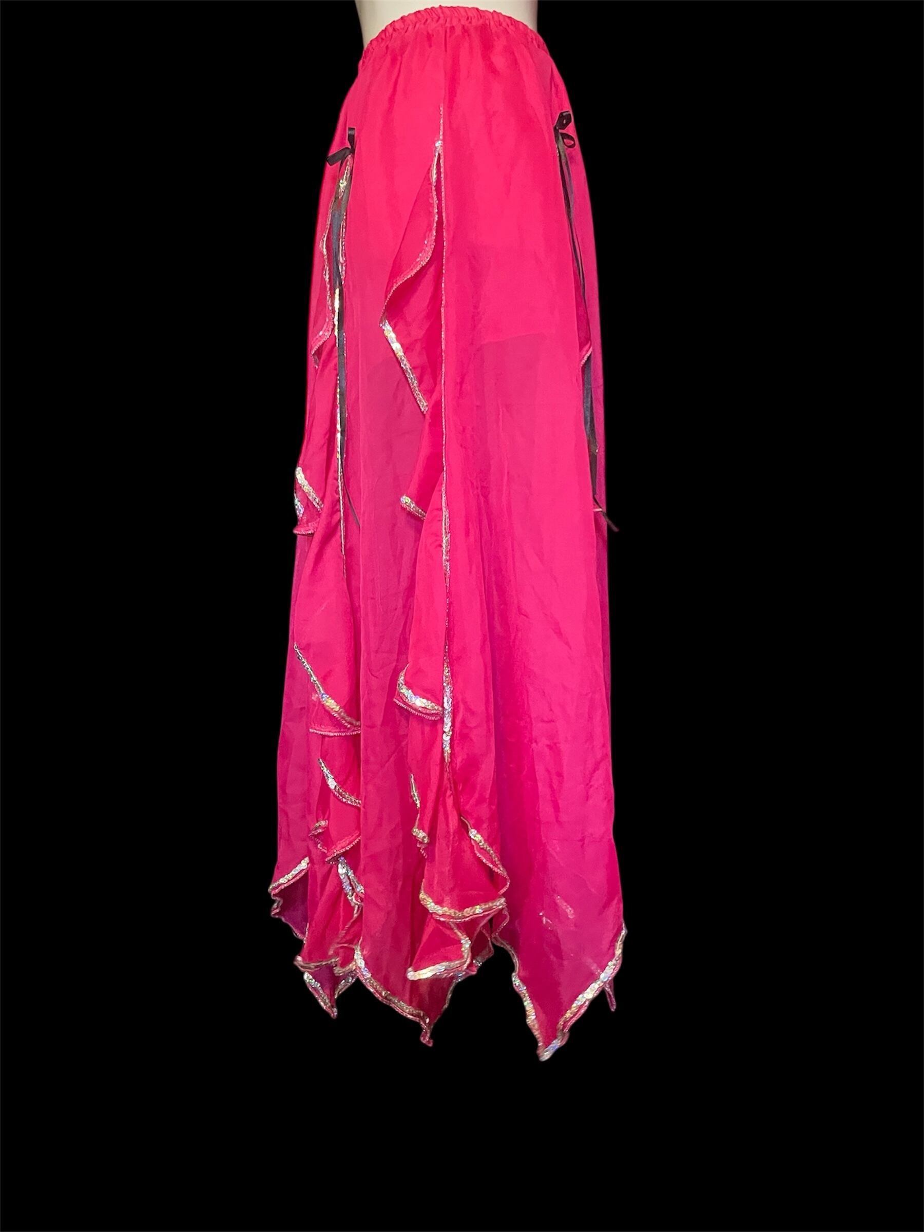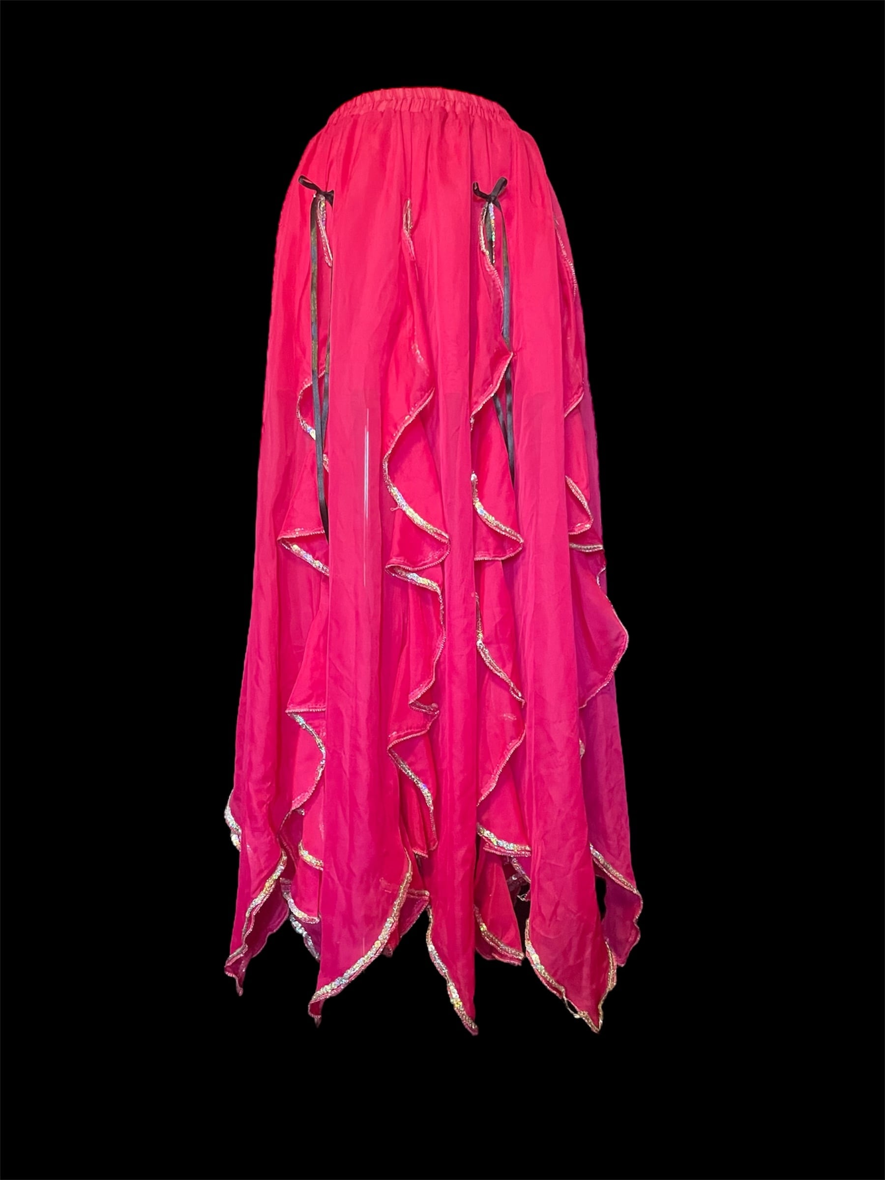 鮮やかなピンクにひらめくフリルや黒いリボンそ重ねた、幻想的なロングスカートです。裾にはきらめく縁取りをあしらい、動くたびに華やかさを演出します。