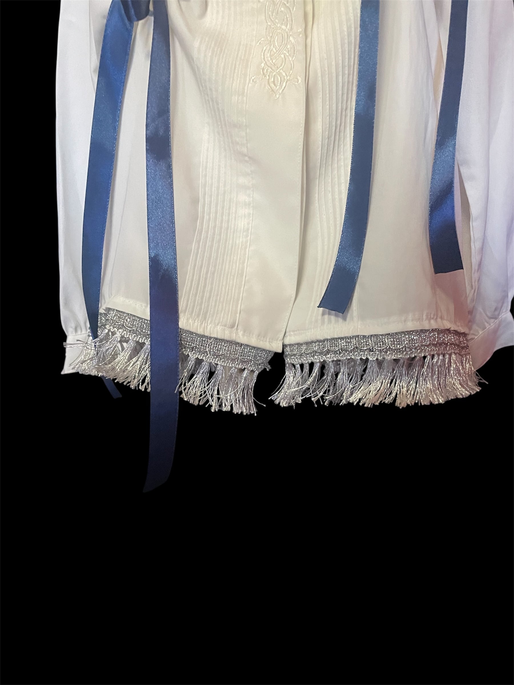 裾には特別なフリンジをあしらい、リボンは縦に配置する少しユニークなデザインに仕上げました。
