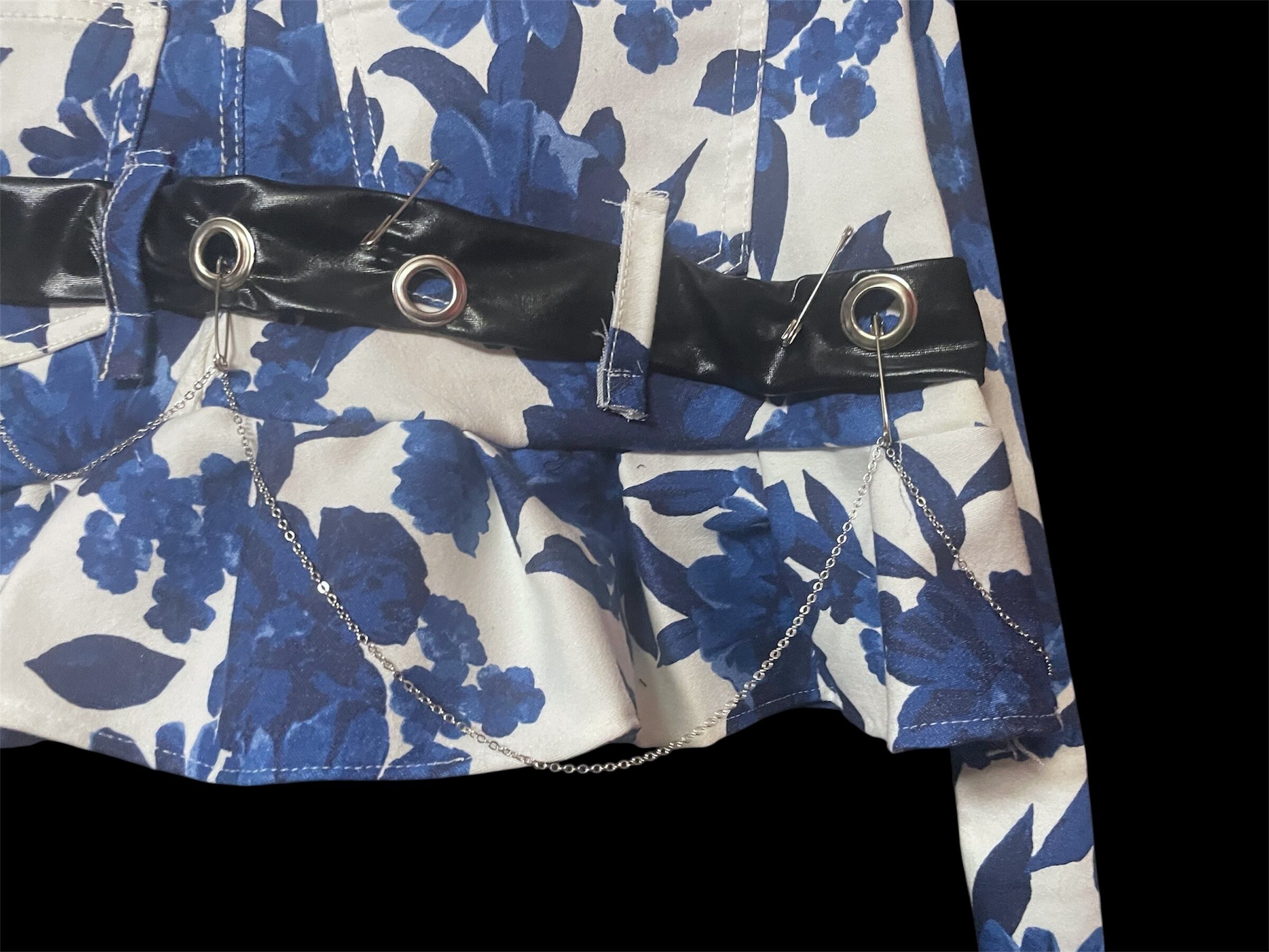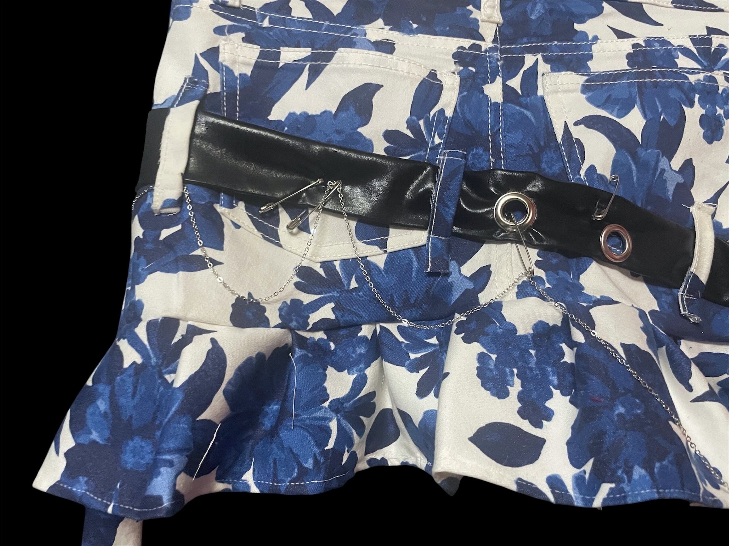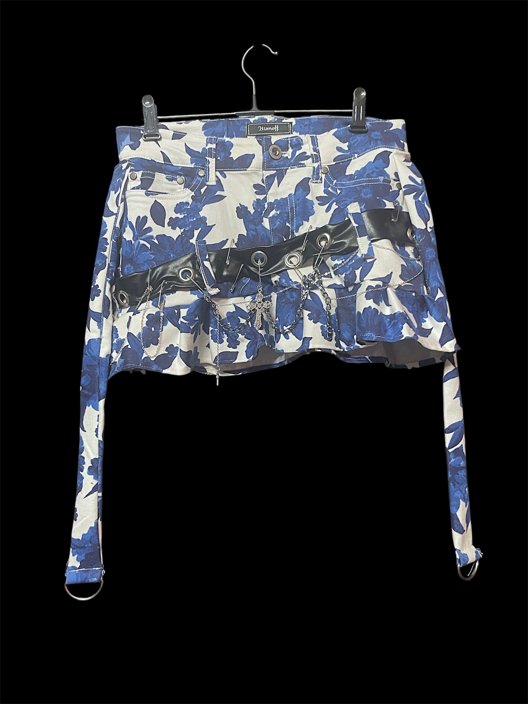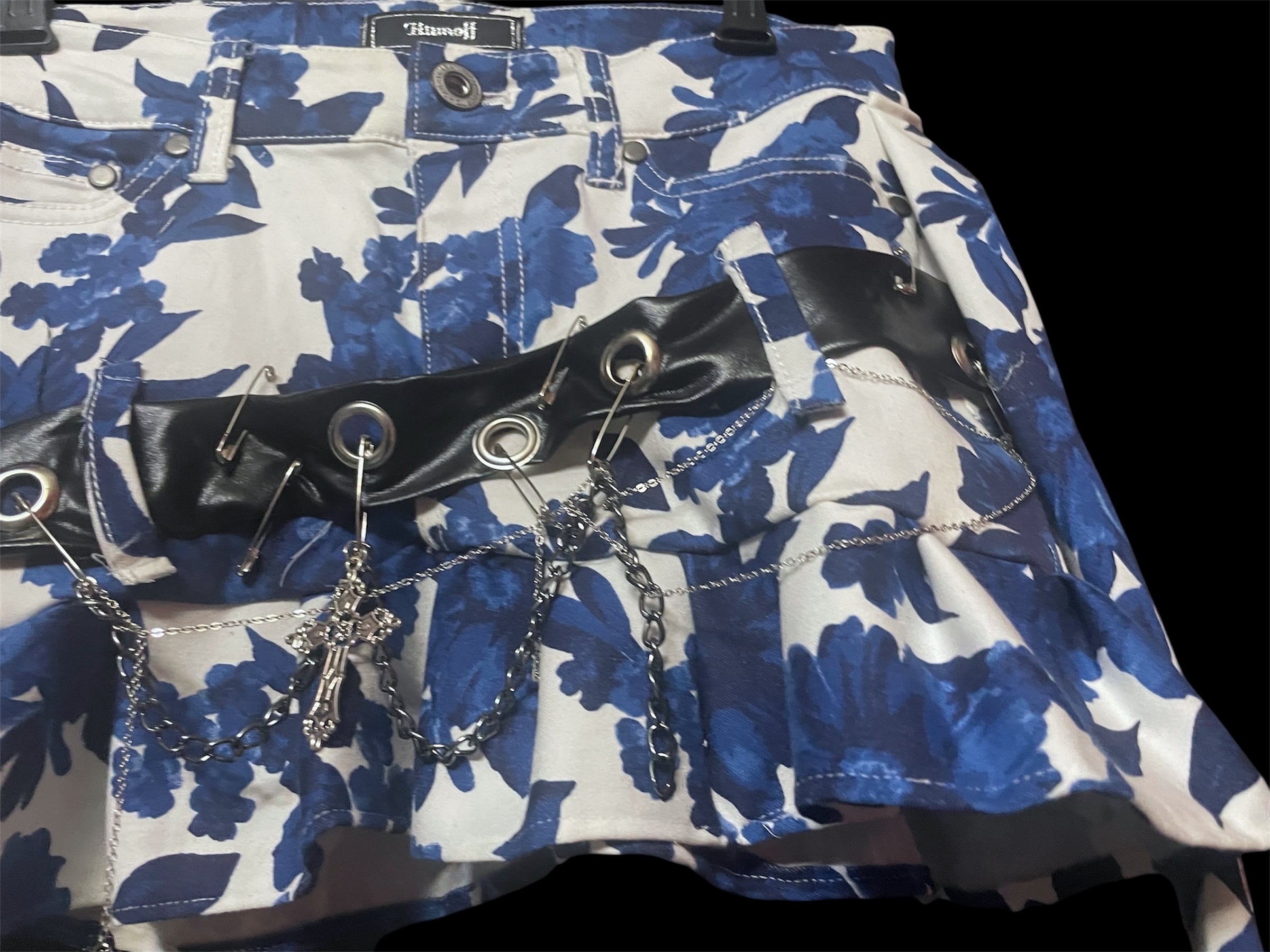 青い花柄に、レザー調ベルトやチェーンなどを組み合わせたスカートです。クラシカルな要素にパンクなアクセントを加え、存在感のある一枚に仕上げました。