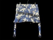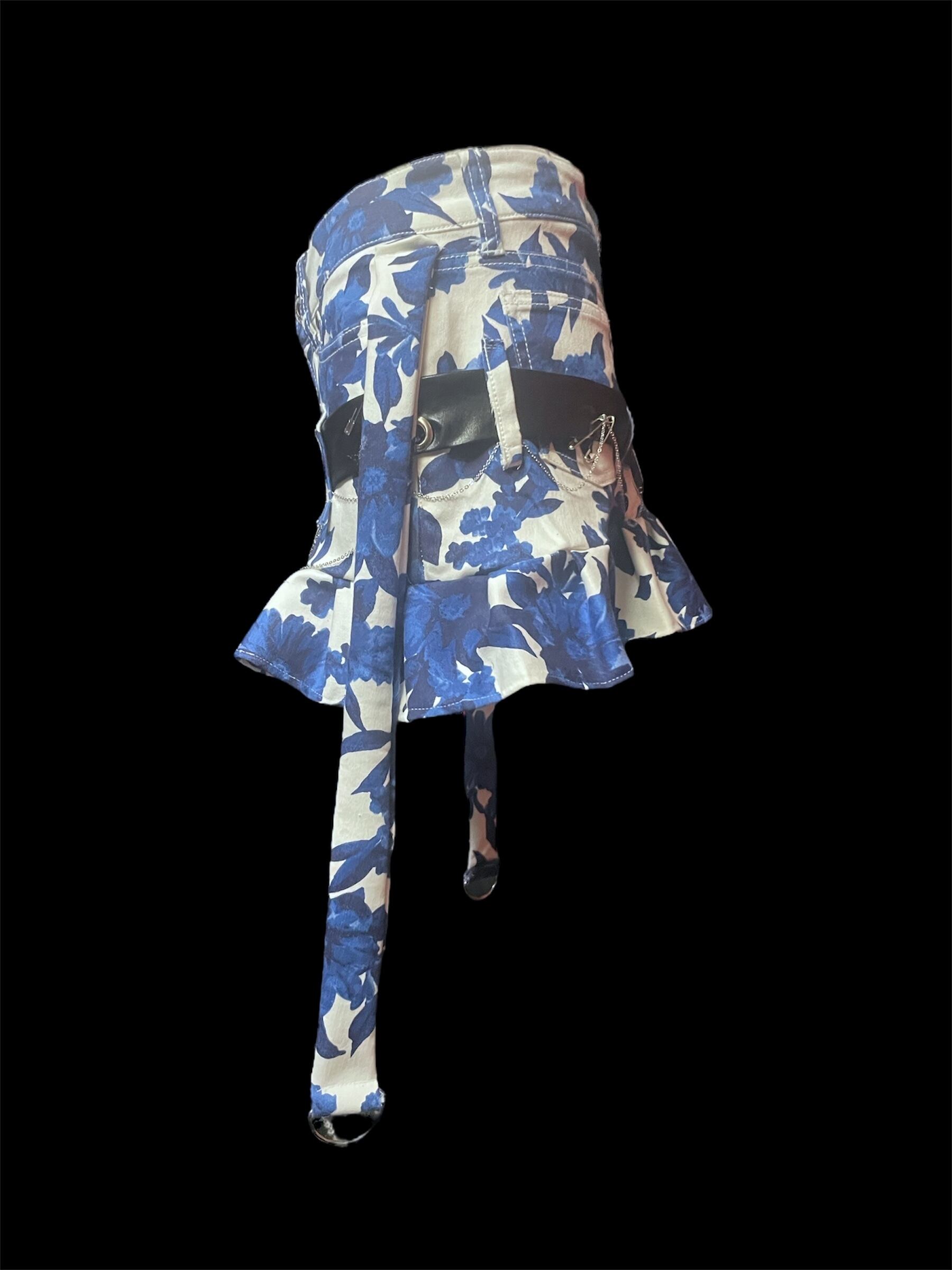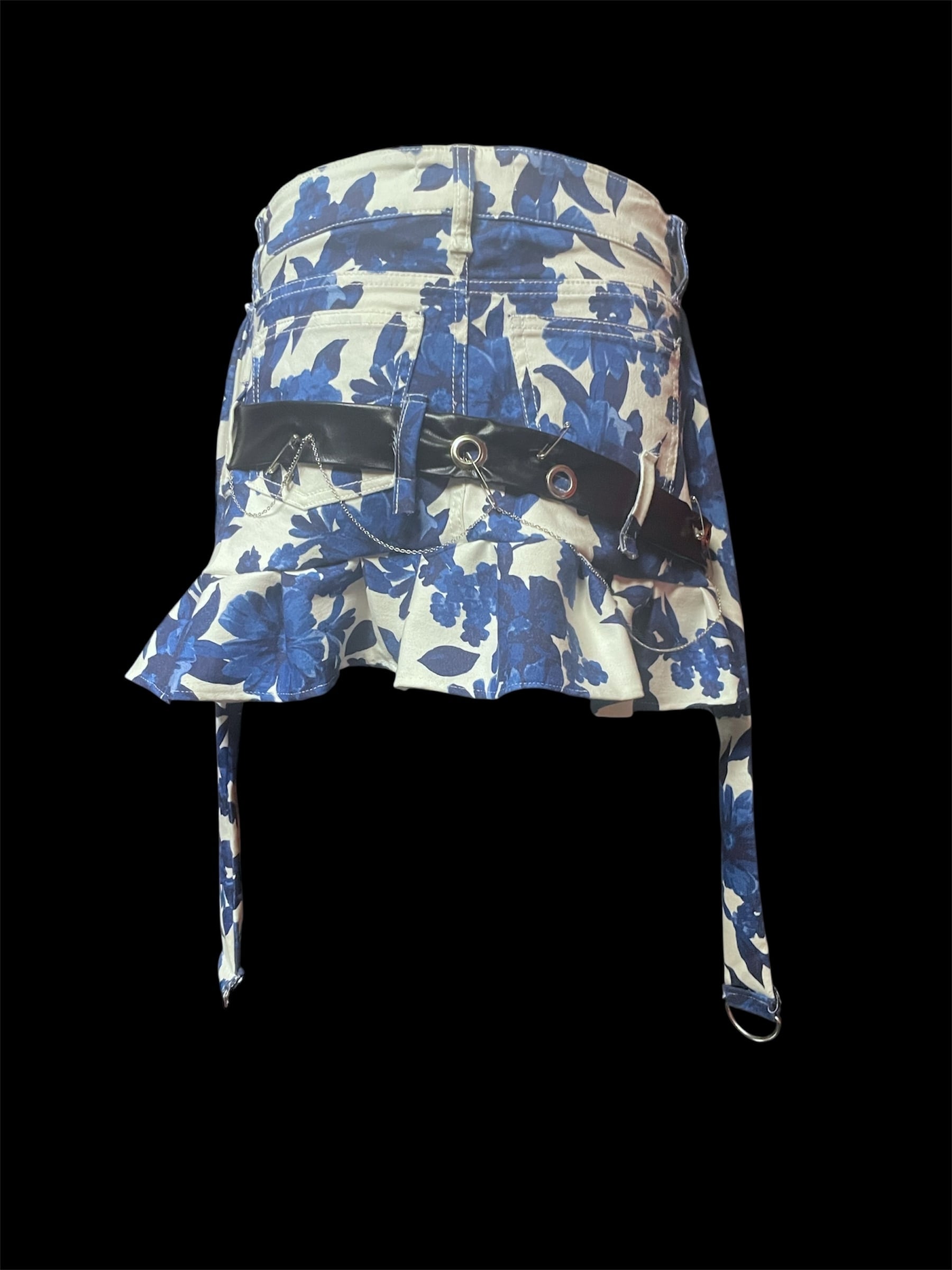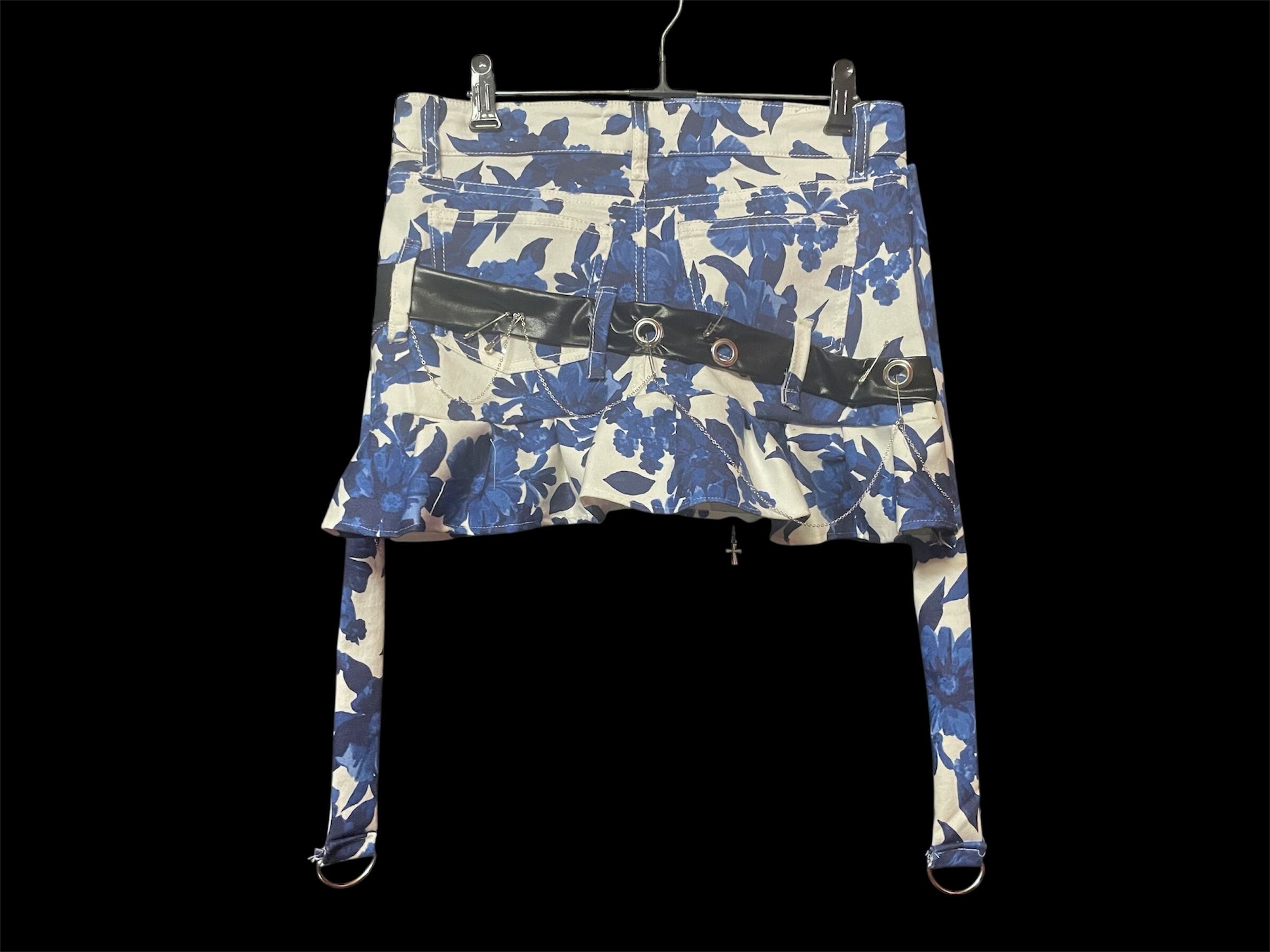 青い花柄に、レザー調ベルトやチェーンなどを組み合わせたスカートです。クラシカルな要素にパンクなアクセントを加え、存在感のある一枚に仕上げました。