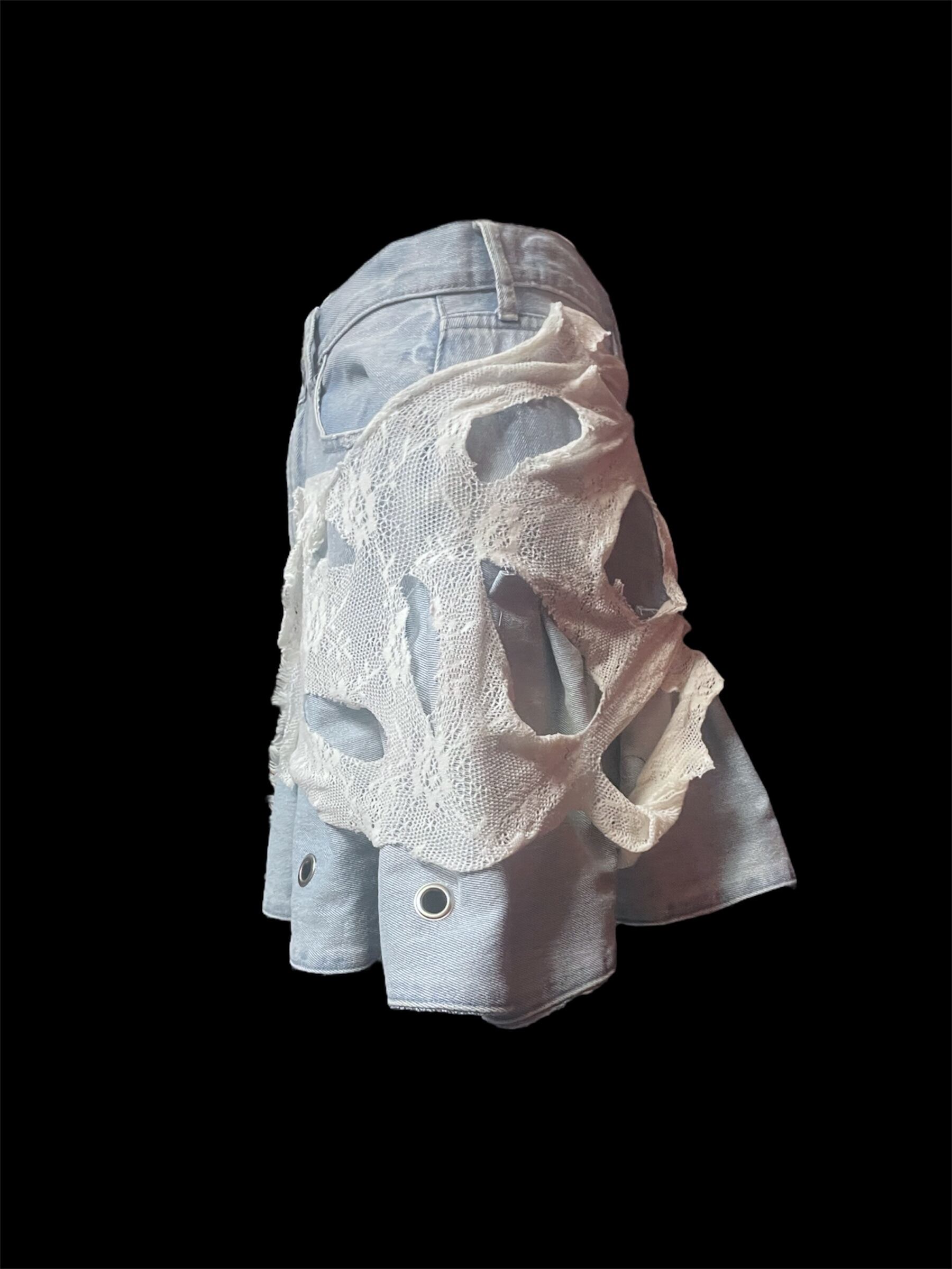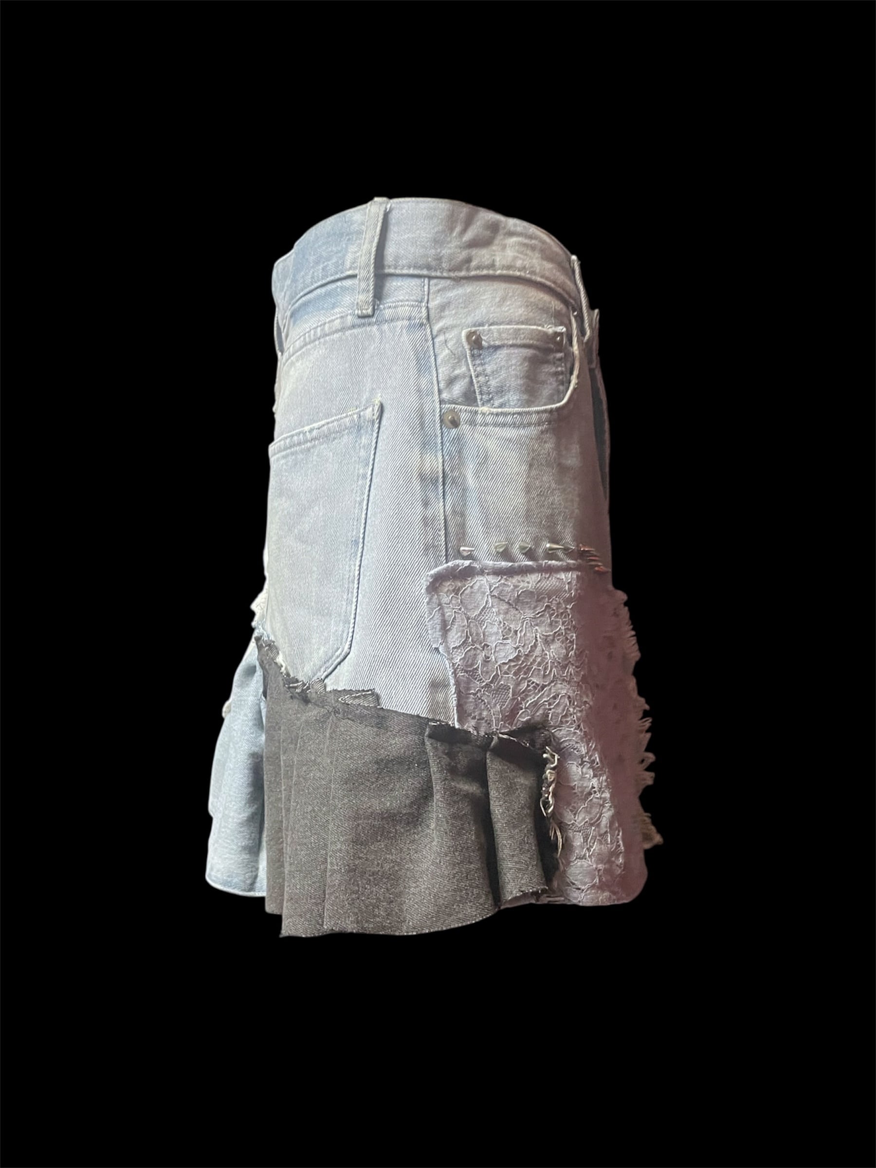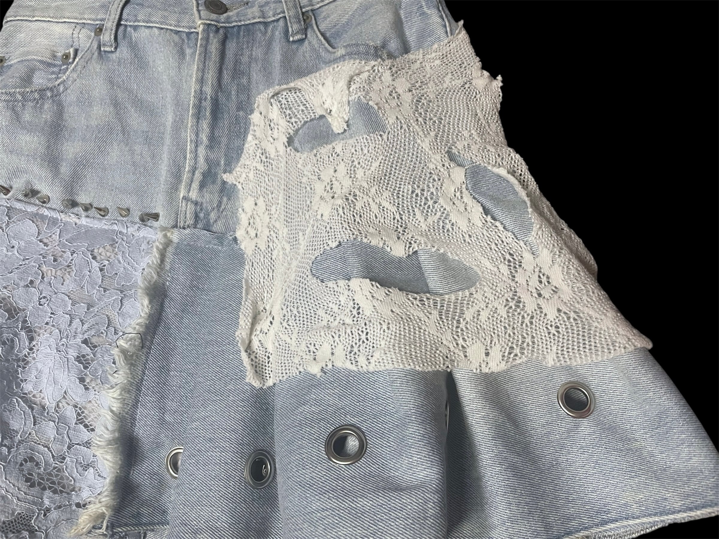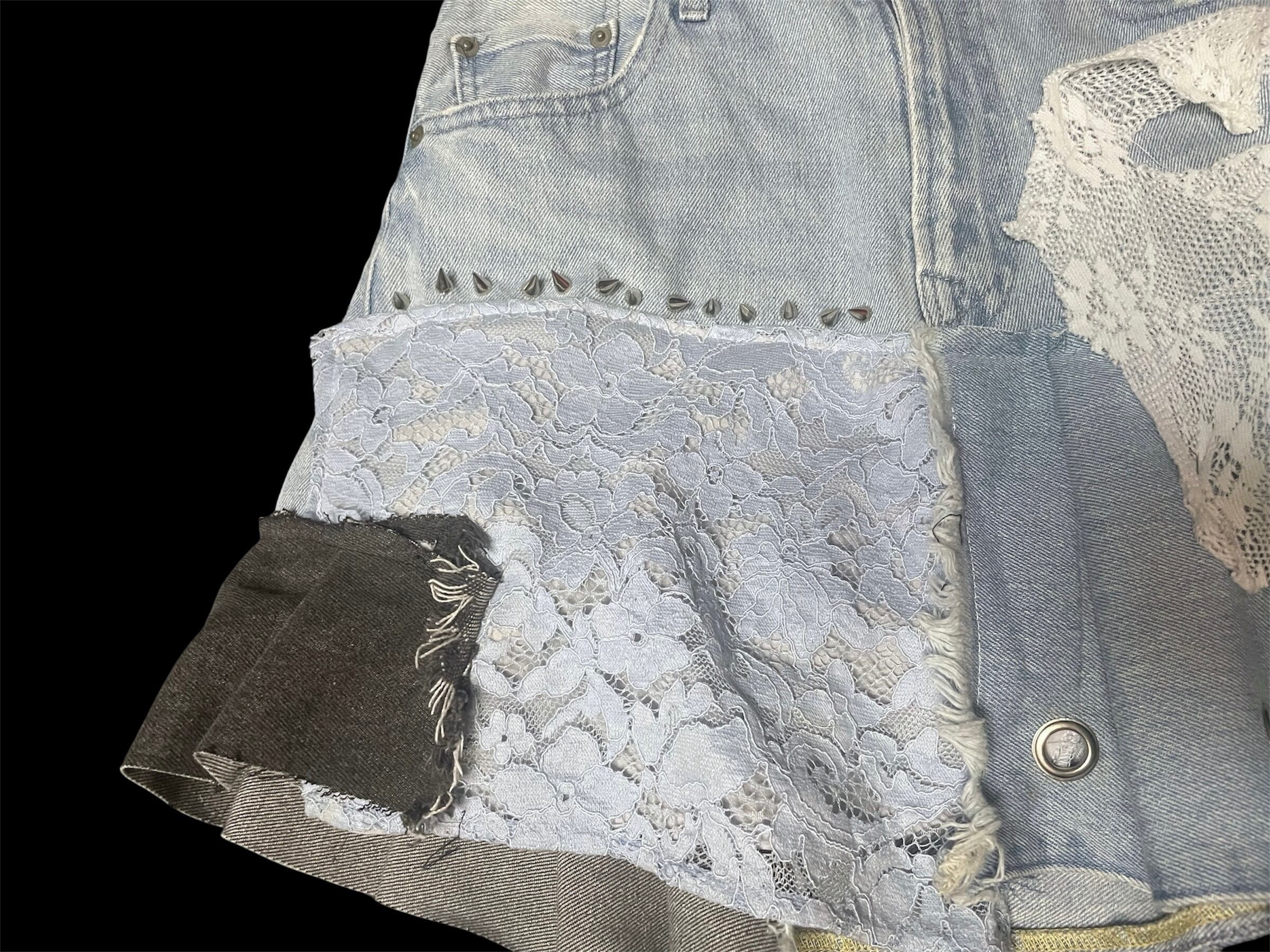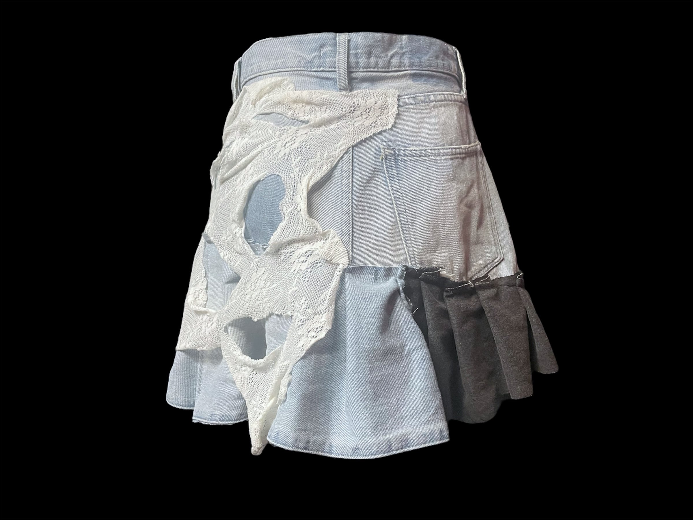デニムにホワイトレースやダメージニットを大胆に組み合わせたリメイクスカート。異素材ミックスが個性的で、唯一無二の存在感を放ちます。