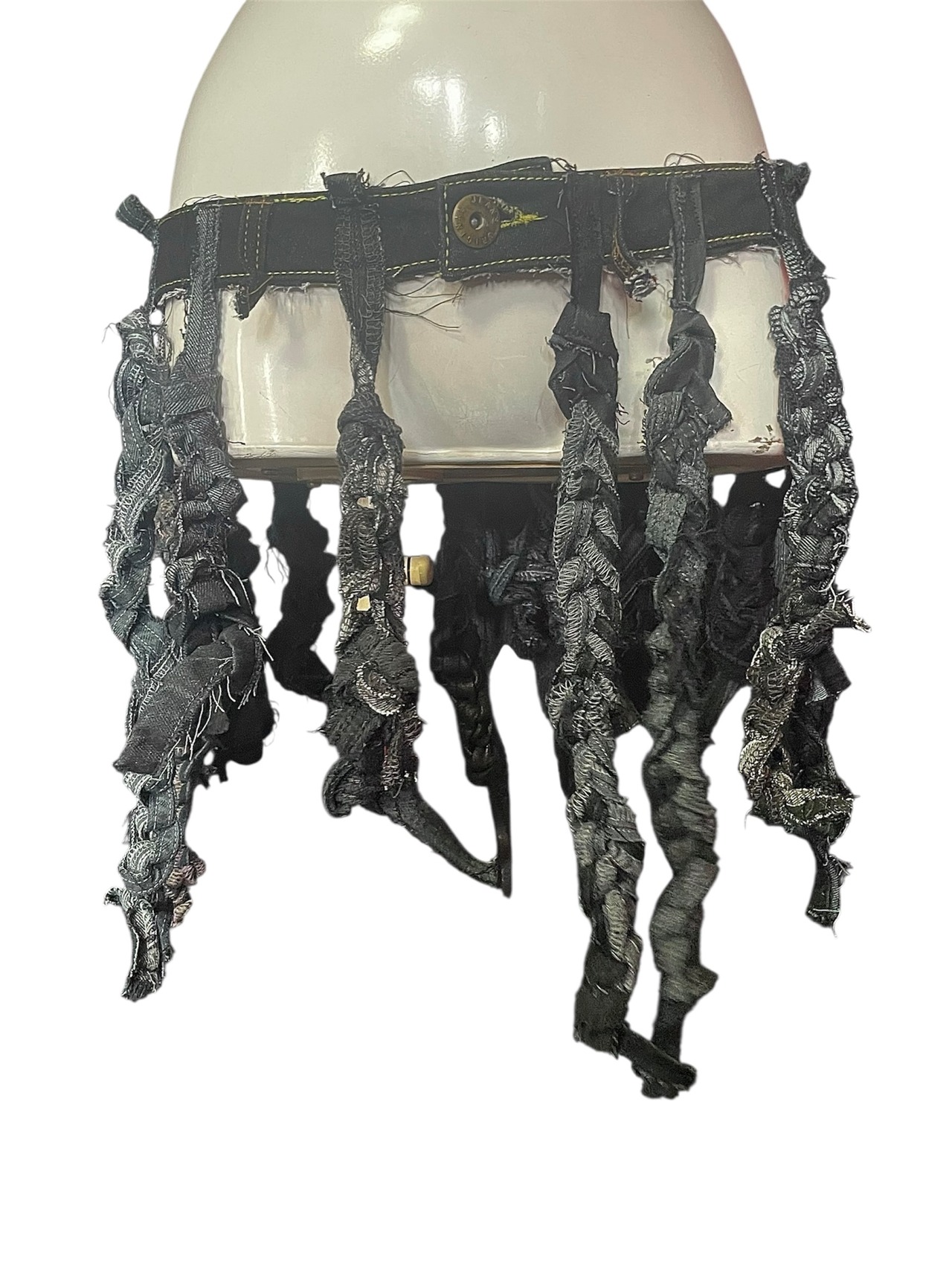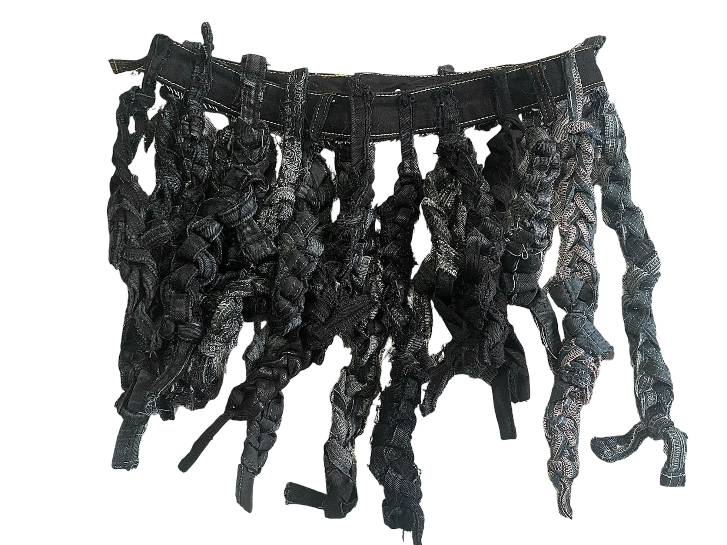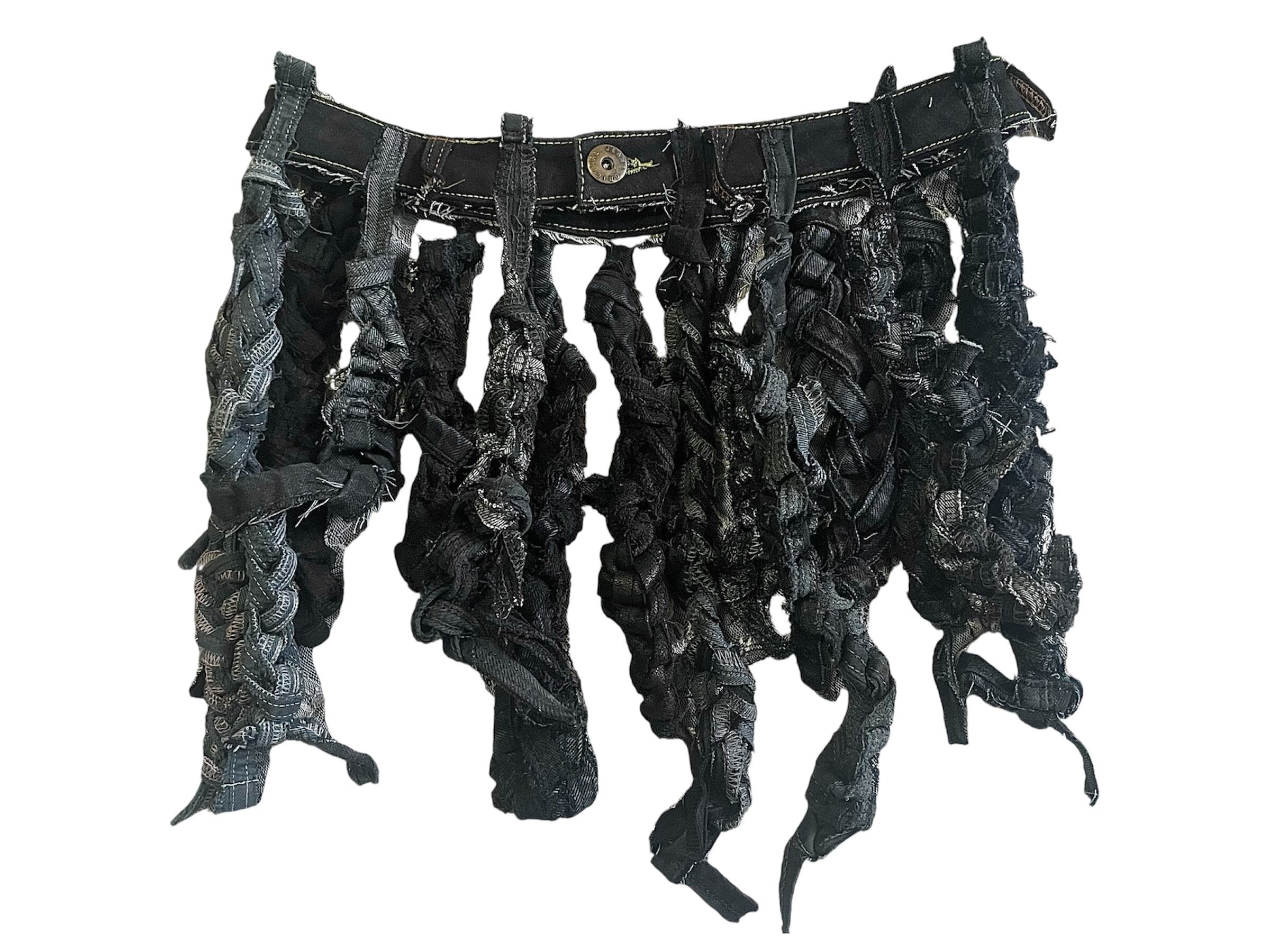 ヴィンテージデニムを解体し、一本ずつ制作したフリンジ状のストラップをベルトに再構築した一点もののリメイクアイテムです。