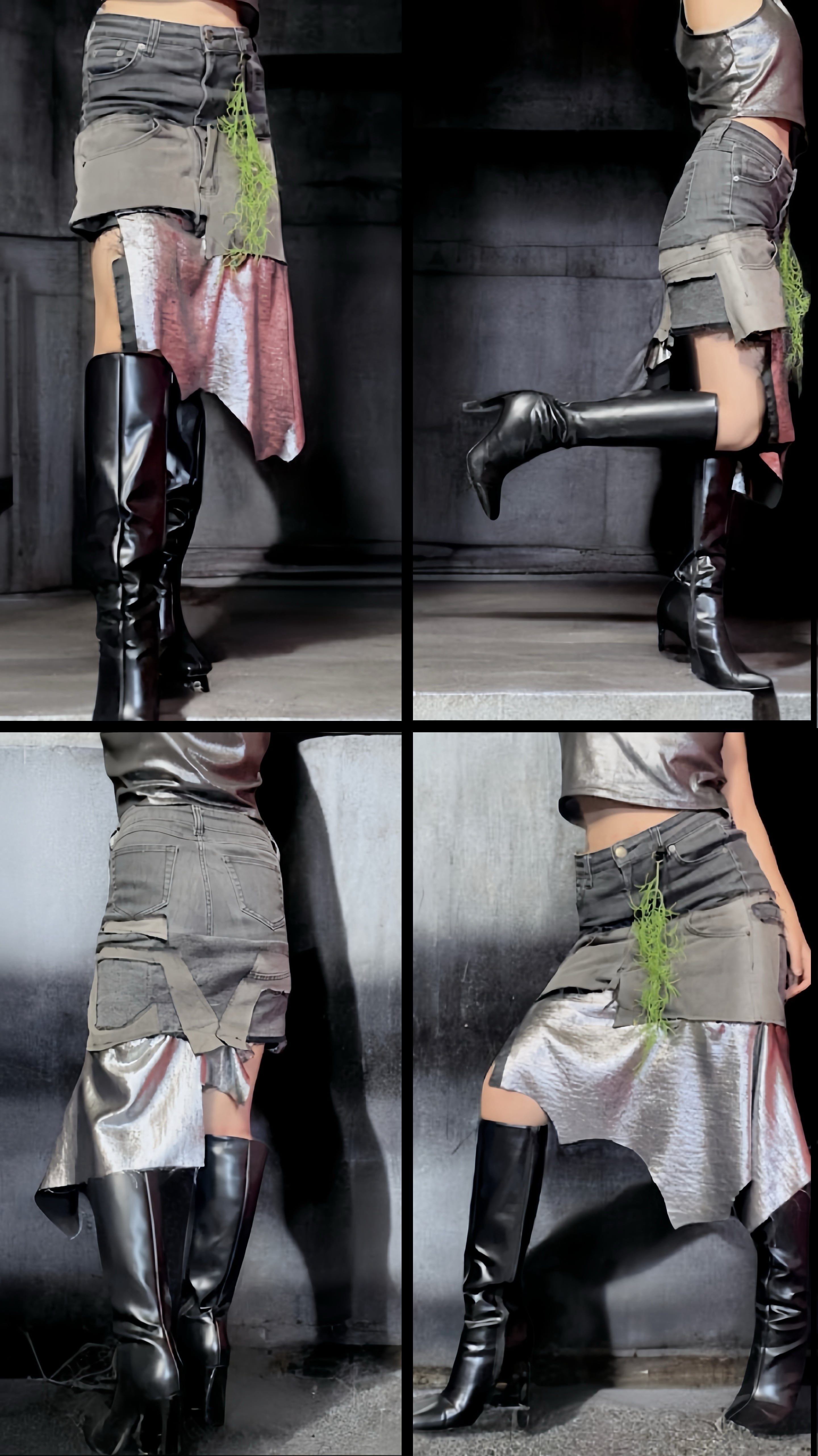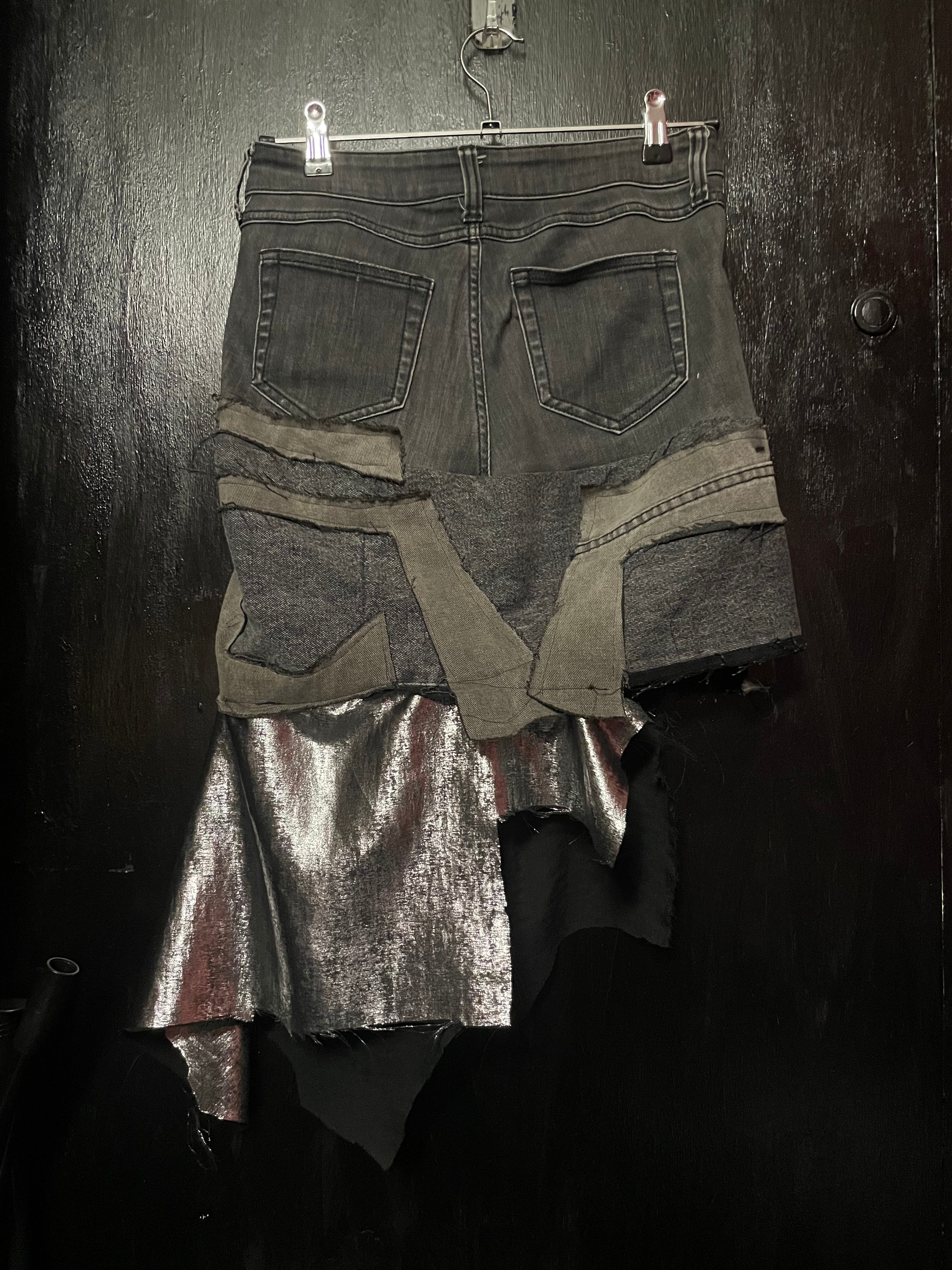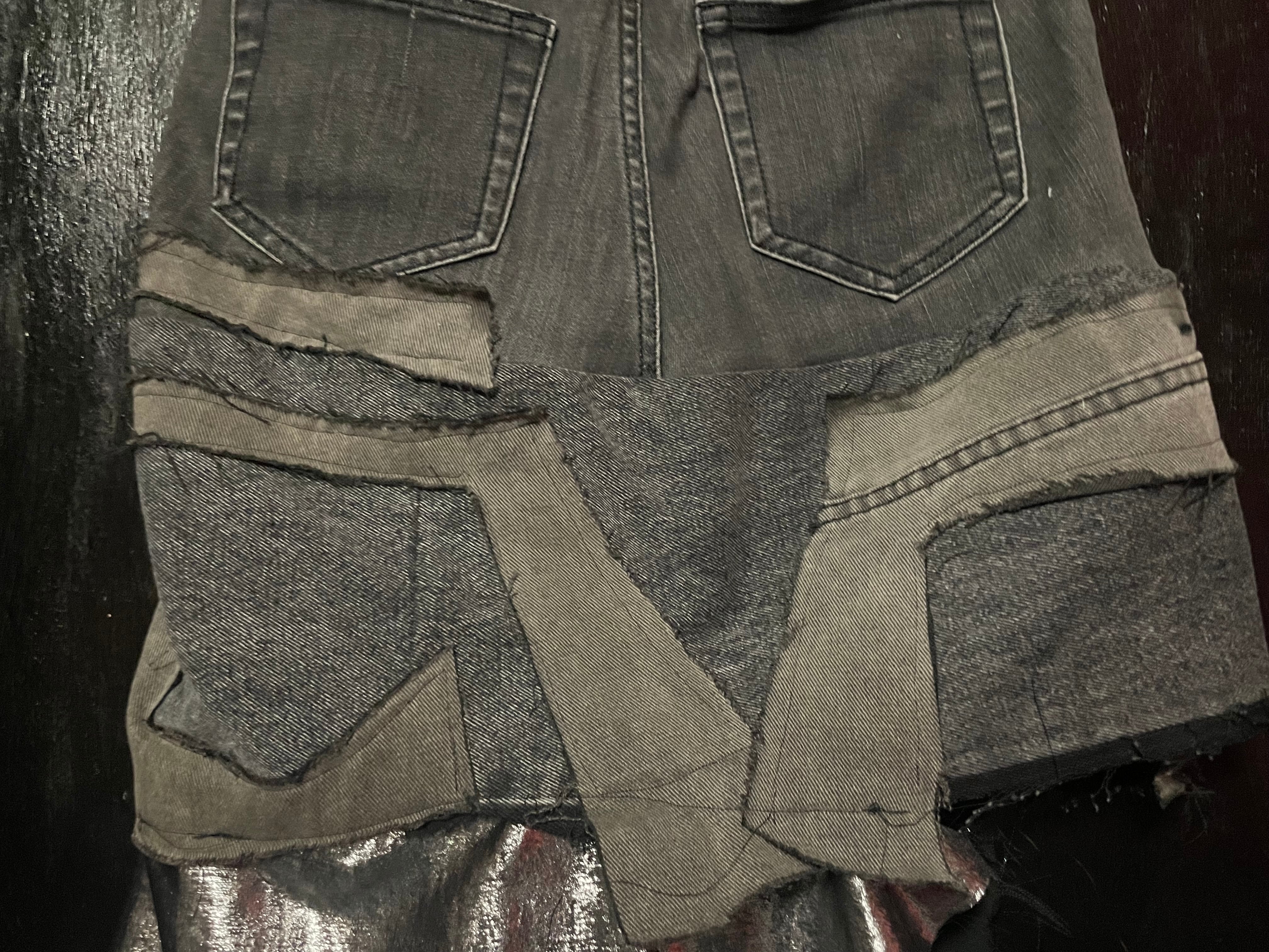 ヴィンテージデニムを解体し、光沢あるメタリック生地と組み合わせて再構築した一点物スカート。