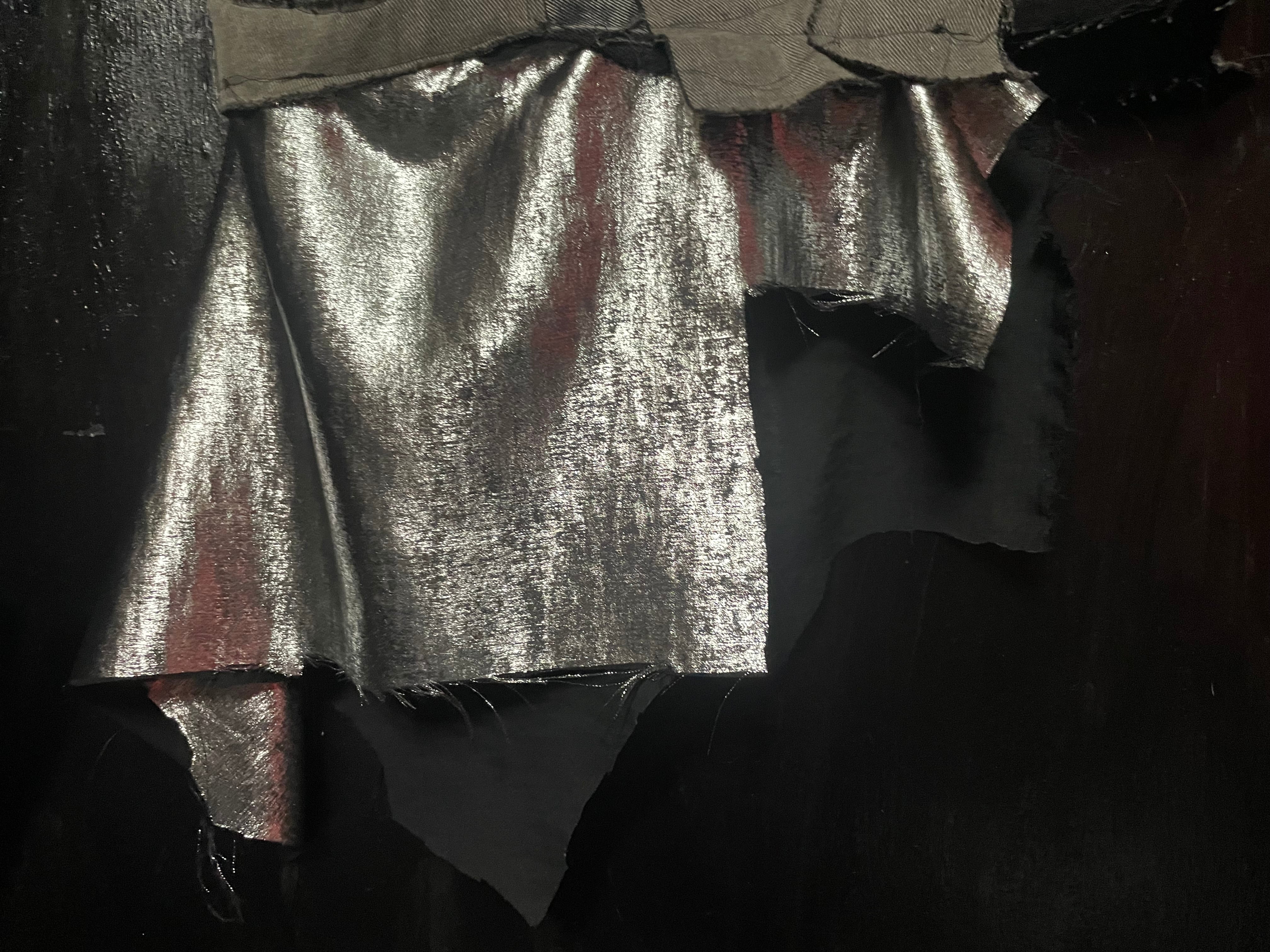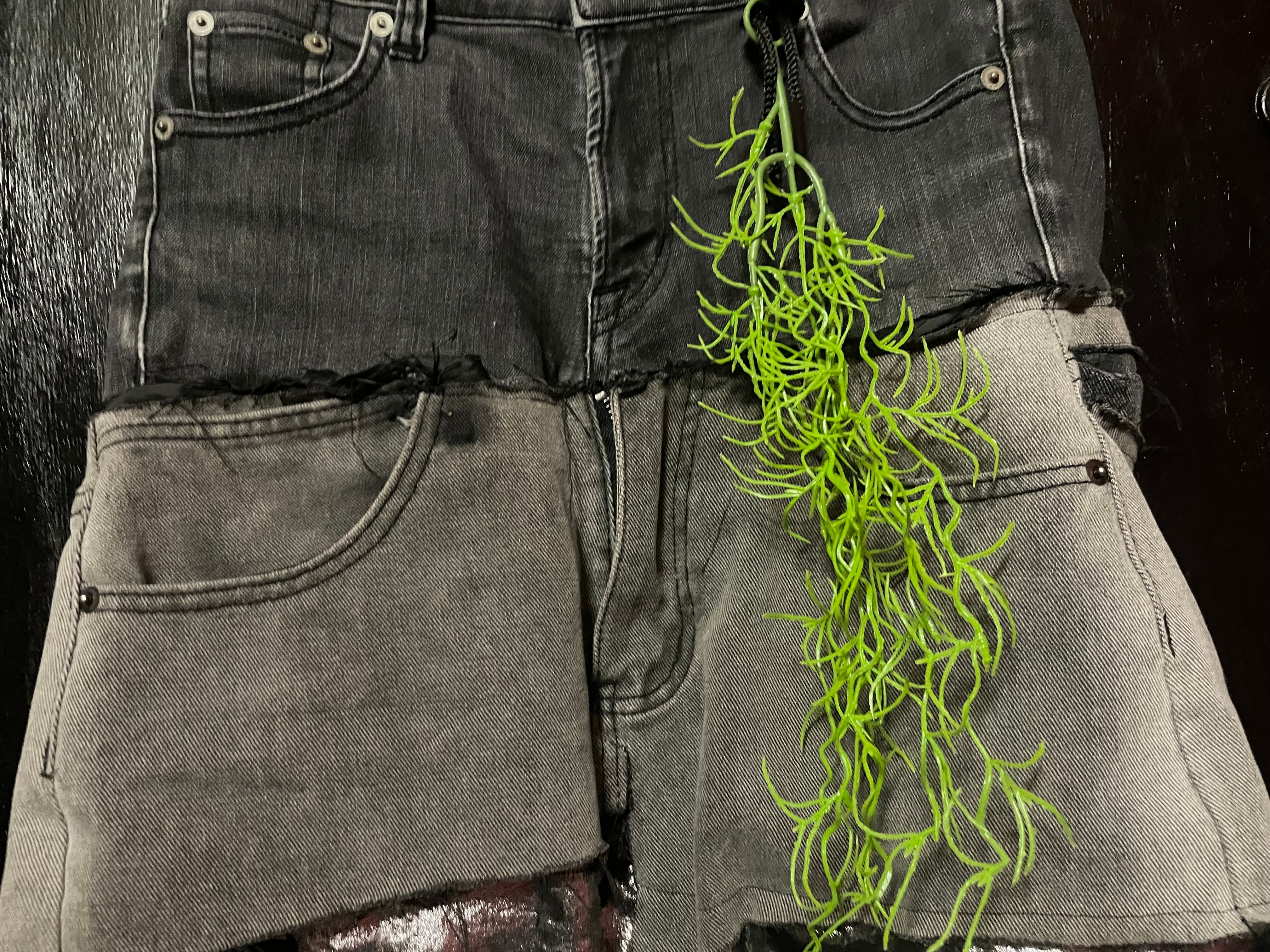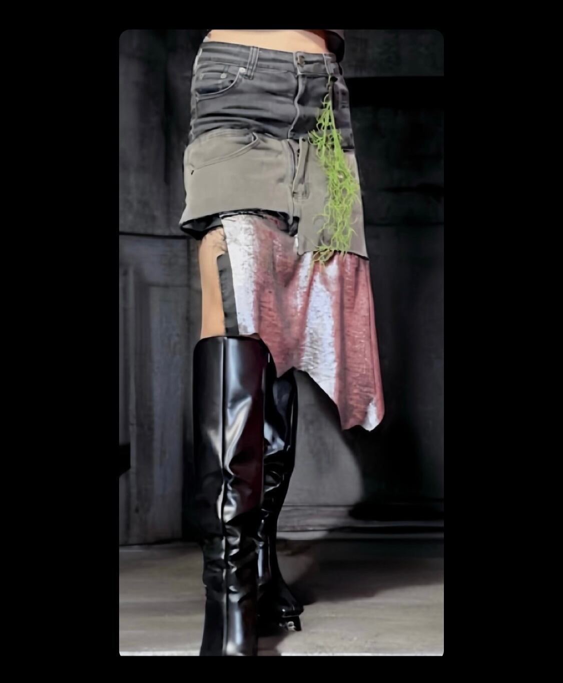 ヴィンテージデニムを解体し、光沢あるメタリック生地と組み合わせて再構築した一点物スカート。