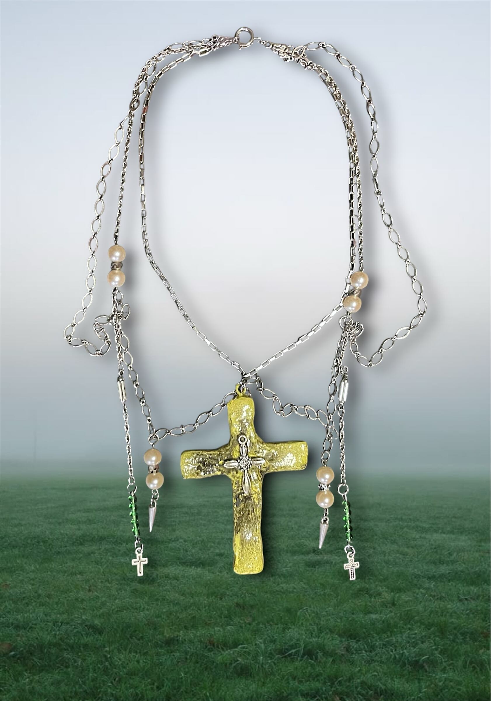 大きな黄色の十字架を中心に、パールやクロス、メタルパーツを組み合わせたネックレスです。