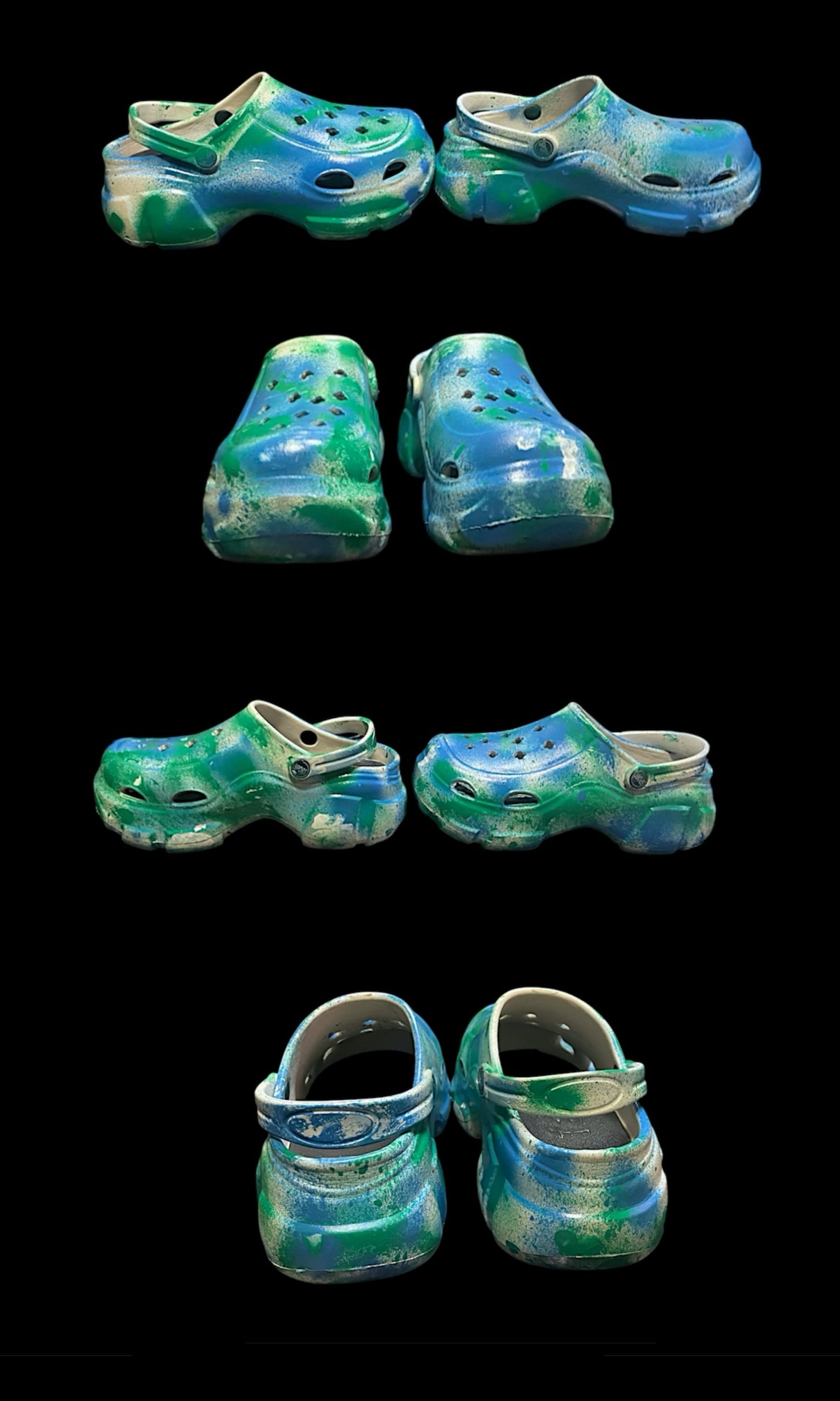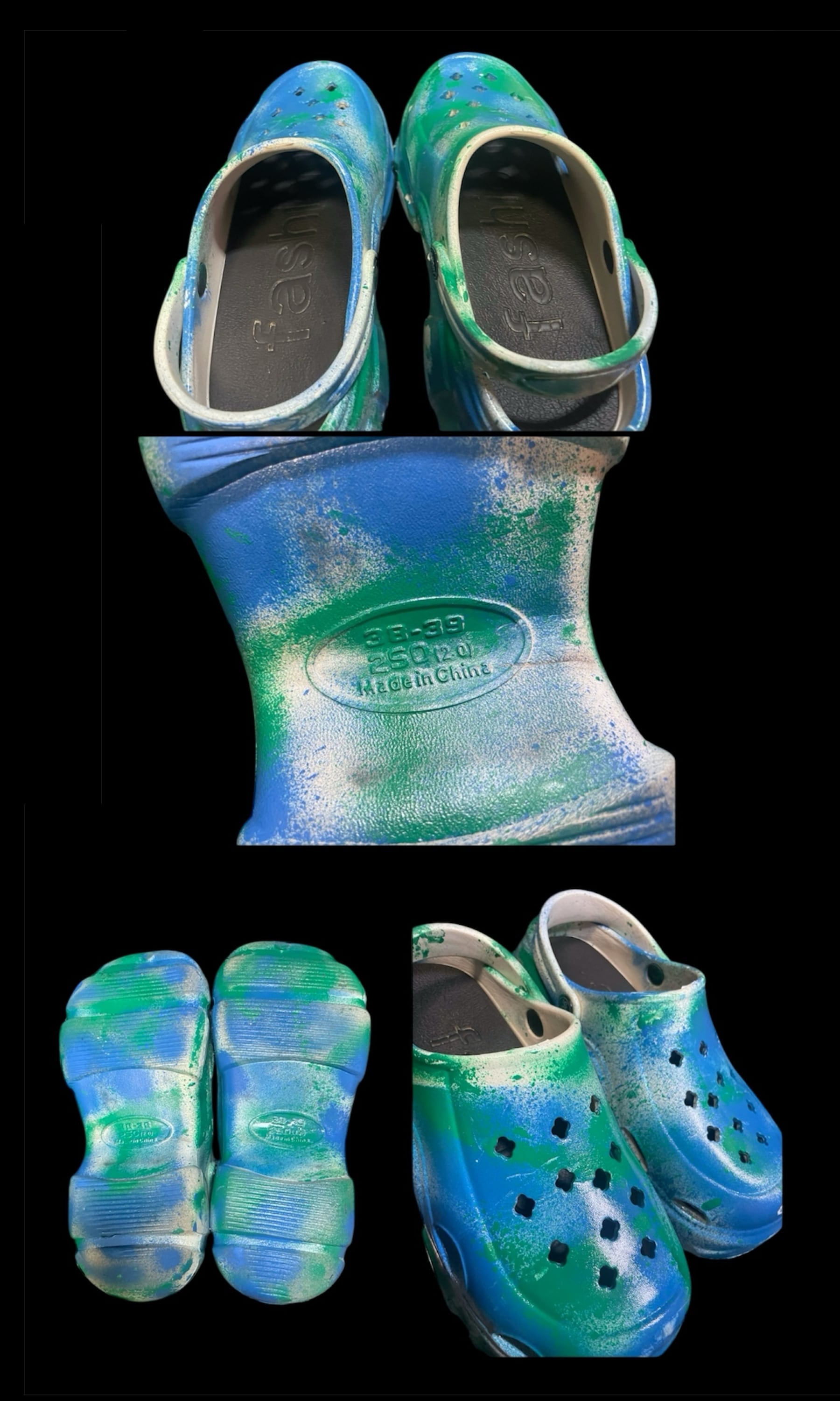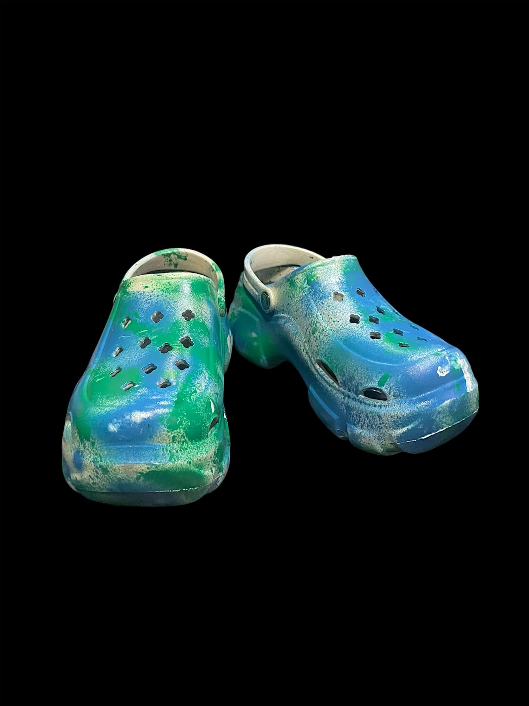 グリーンとブルーのスプレーアートを大胆に施したリメイクサンダル。