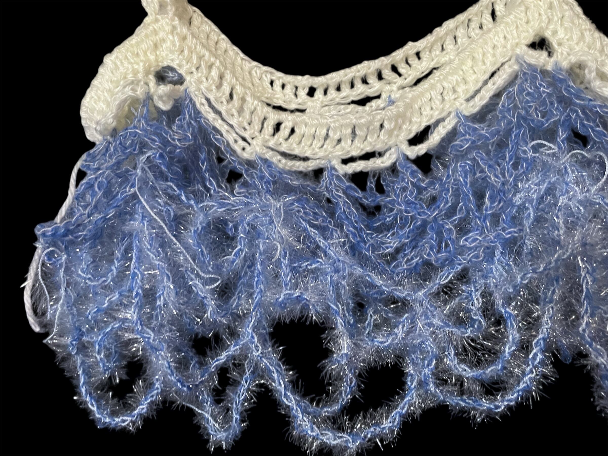 クリーム色 青 薄いグレーを基調に編んだハンドメイドキャミソールです。