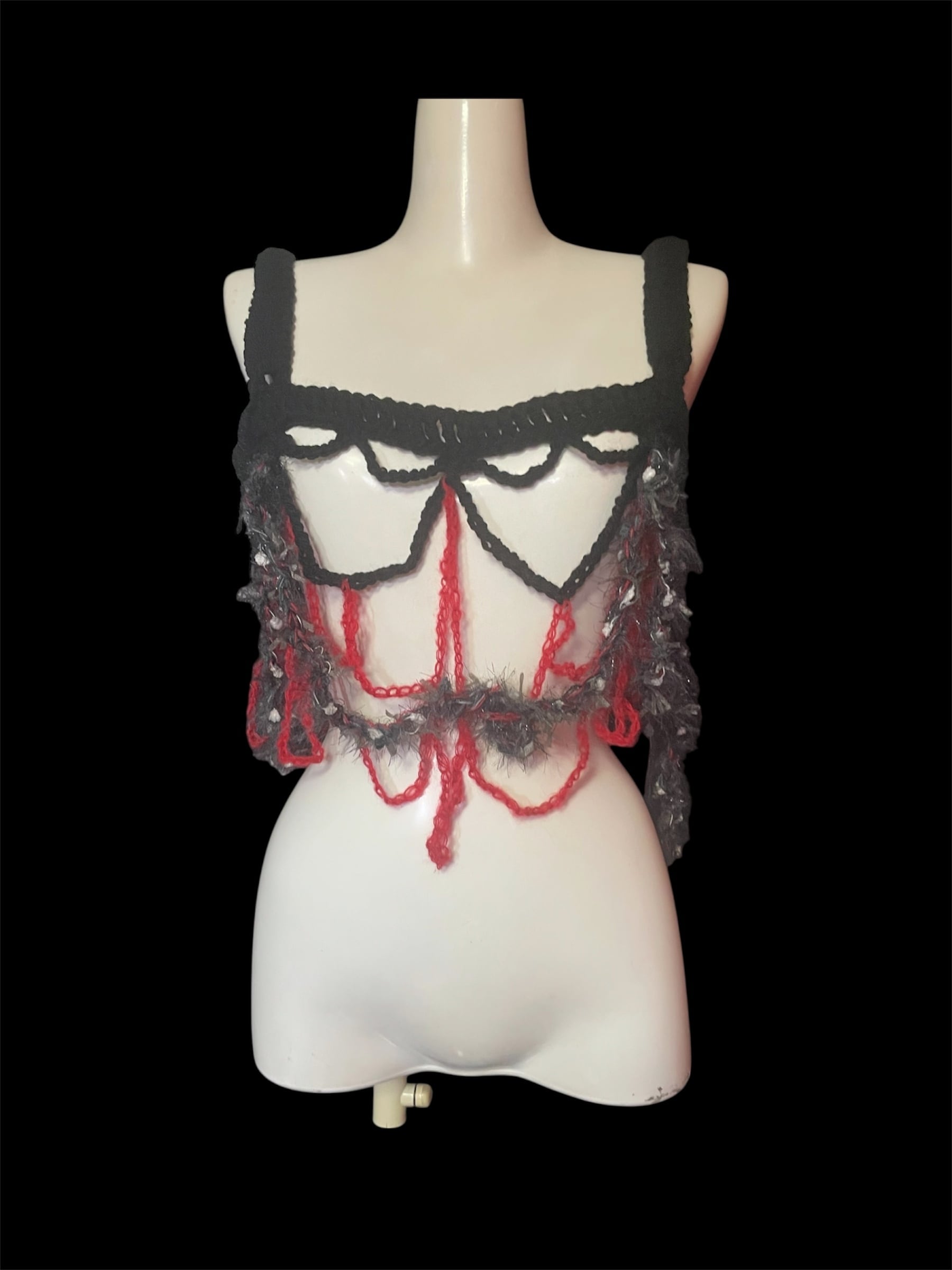 黒 赤 灰色を基調に編んだハンドメイドキャミソールです。