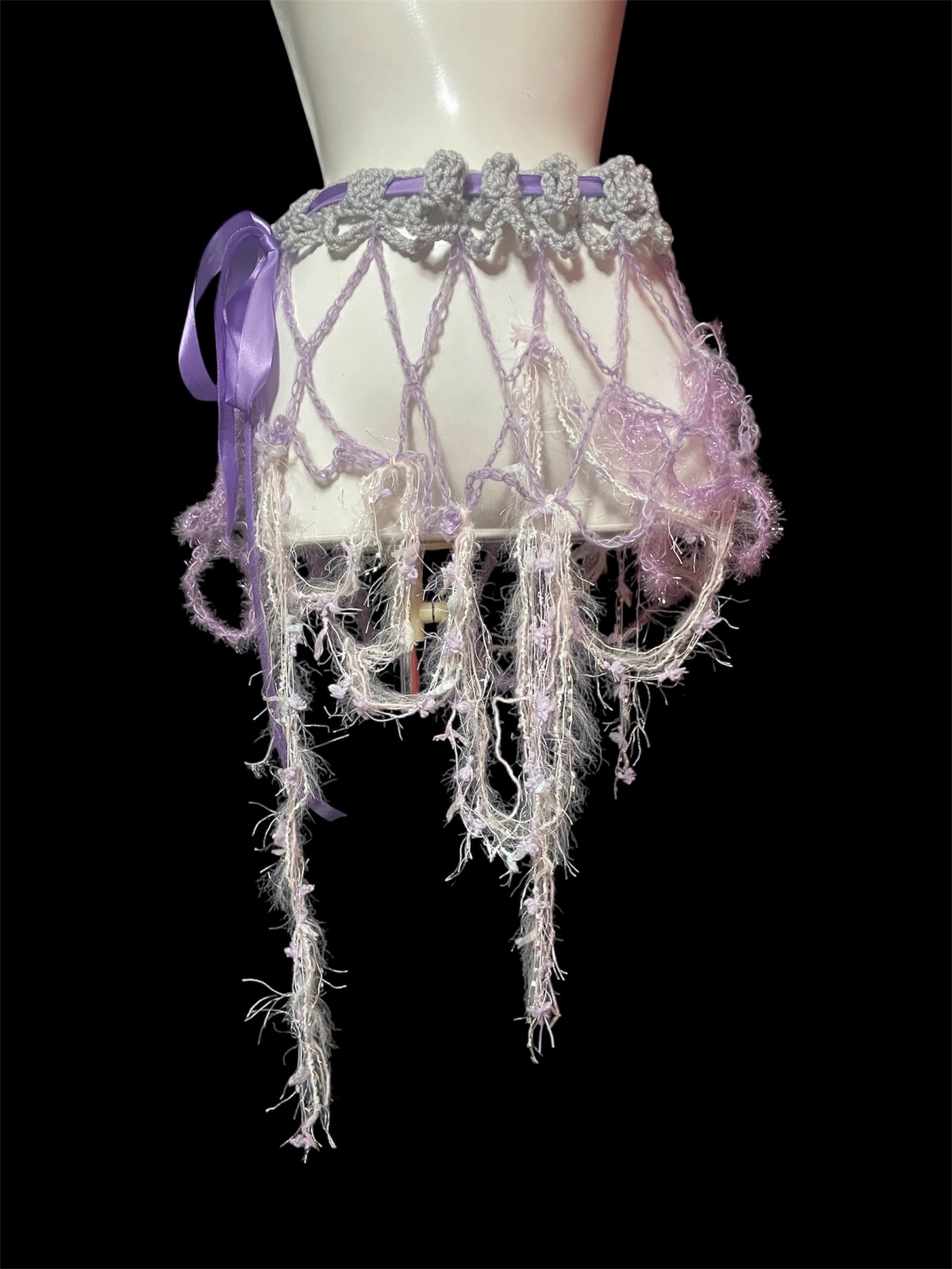 繊細なネット編みが特徴のハンドメイドミニスカートです。