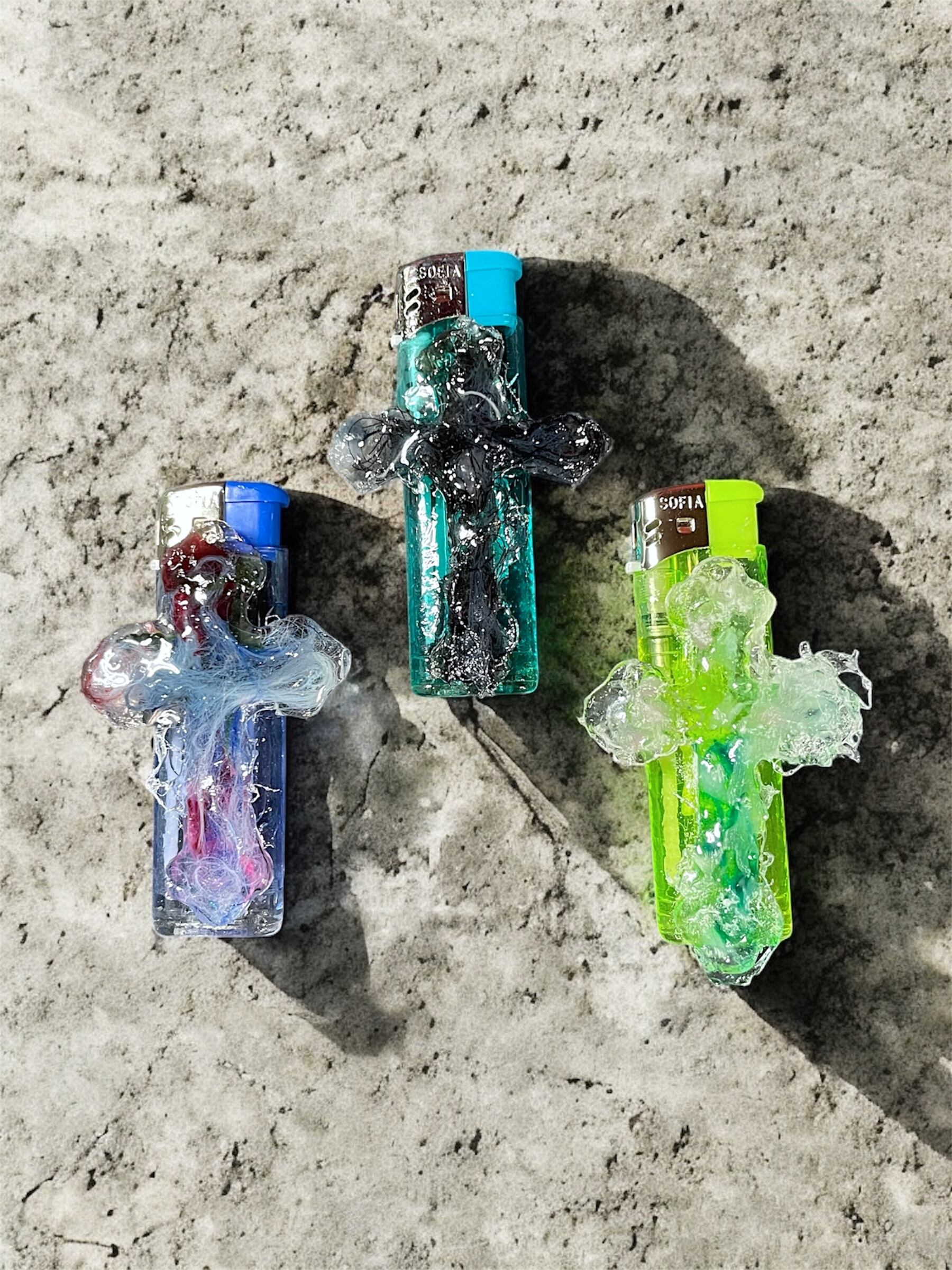 樹脂の流れや気泡、焼け跡が一点ずつ異なり、偶然が生み出す造形の美しさを感じられます。