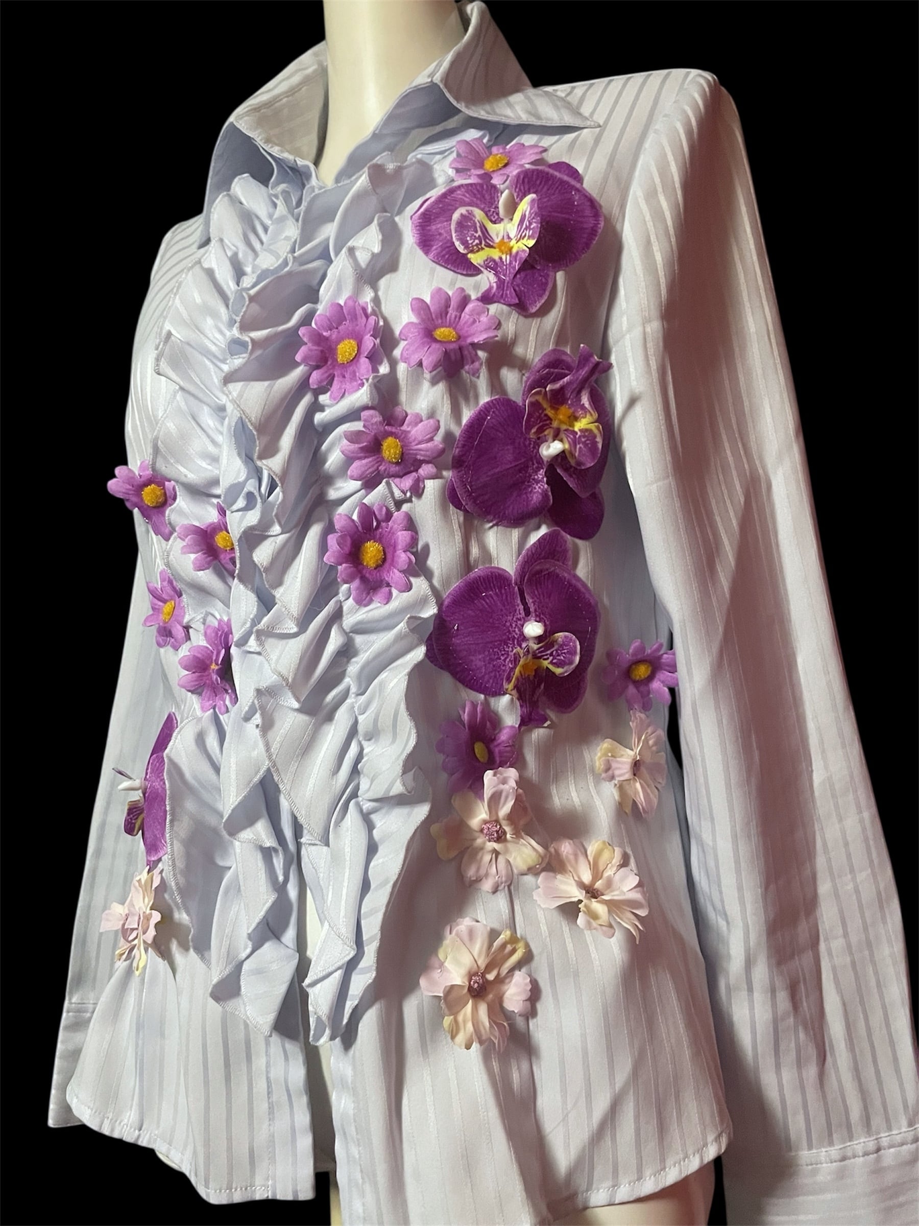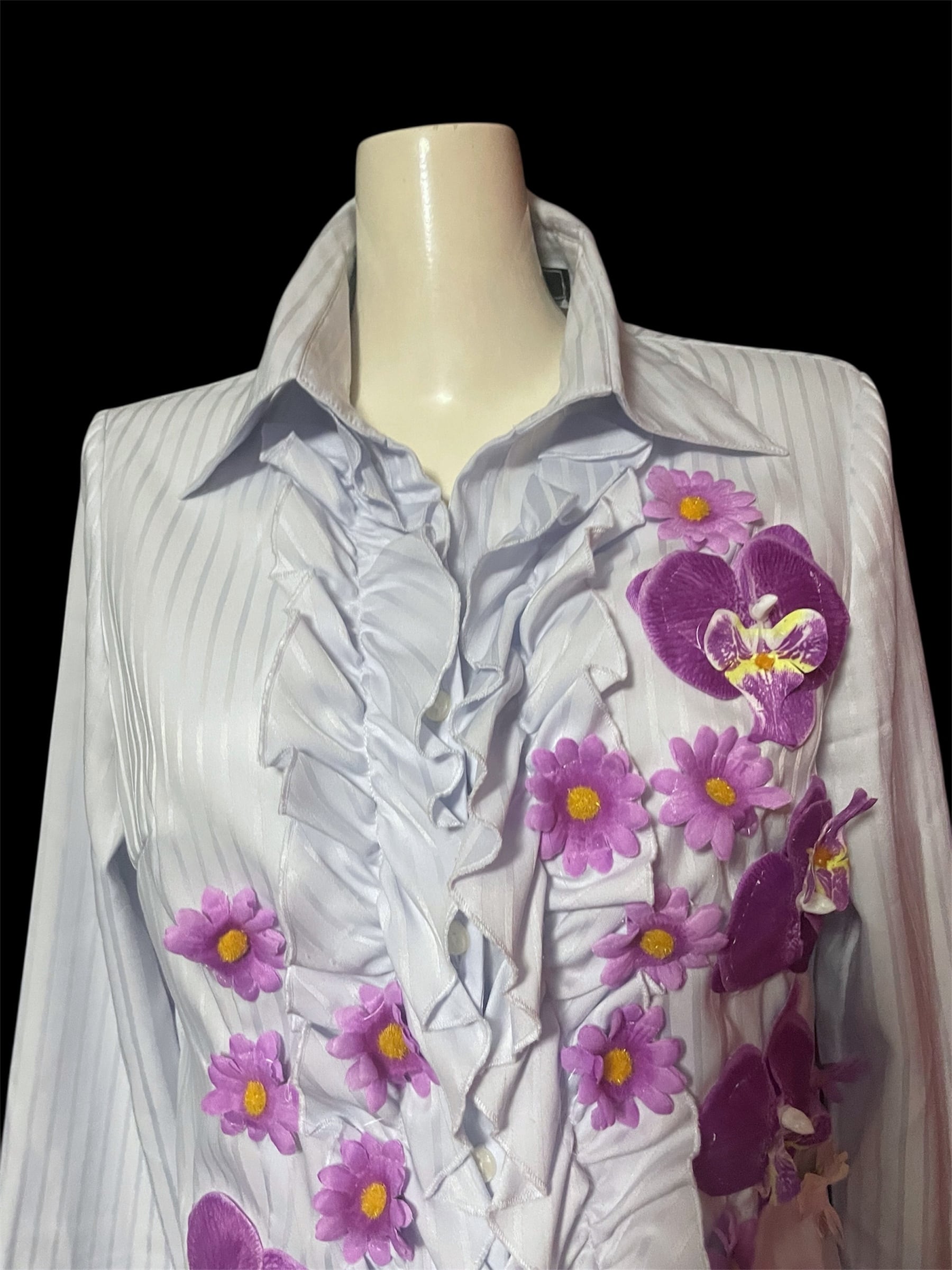 紫の造花をあしらったデザインシャツ。