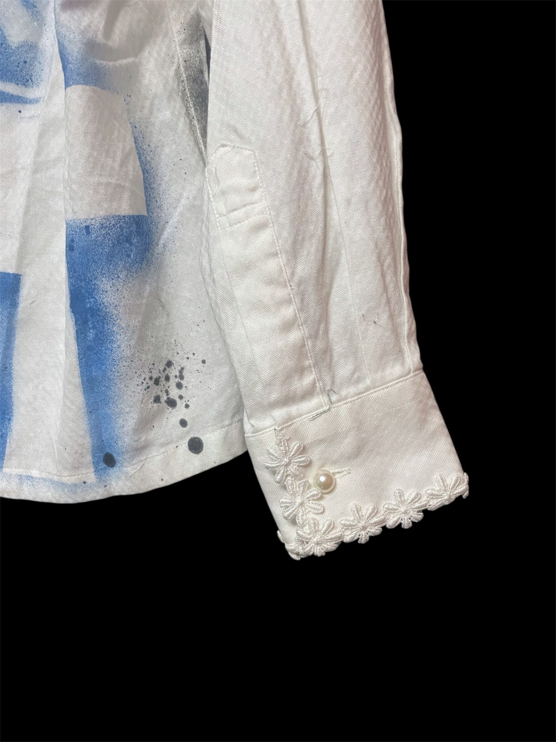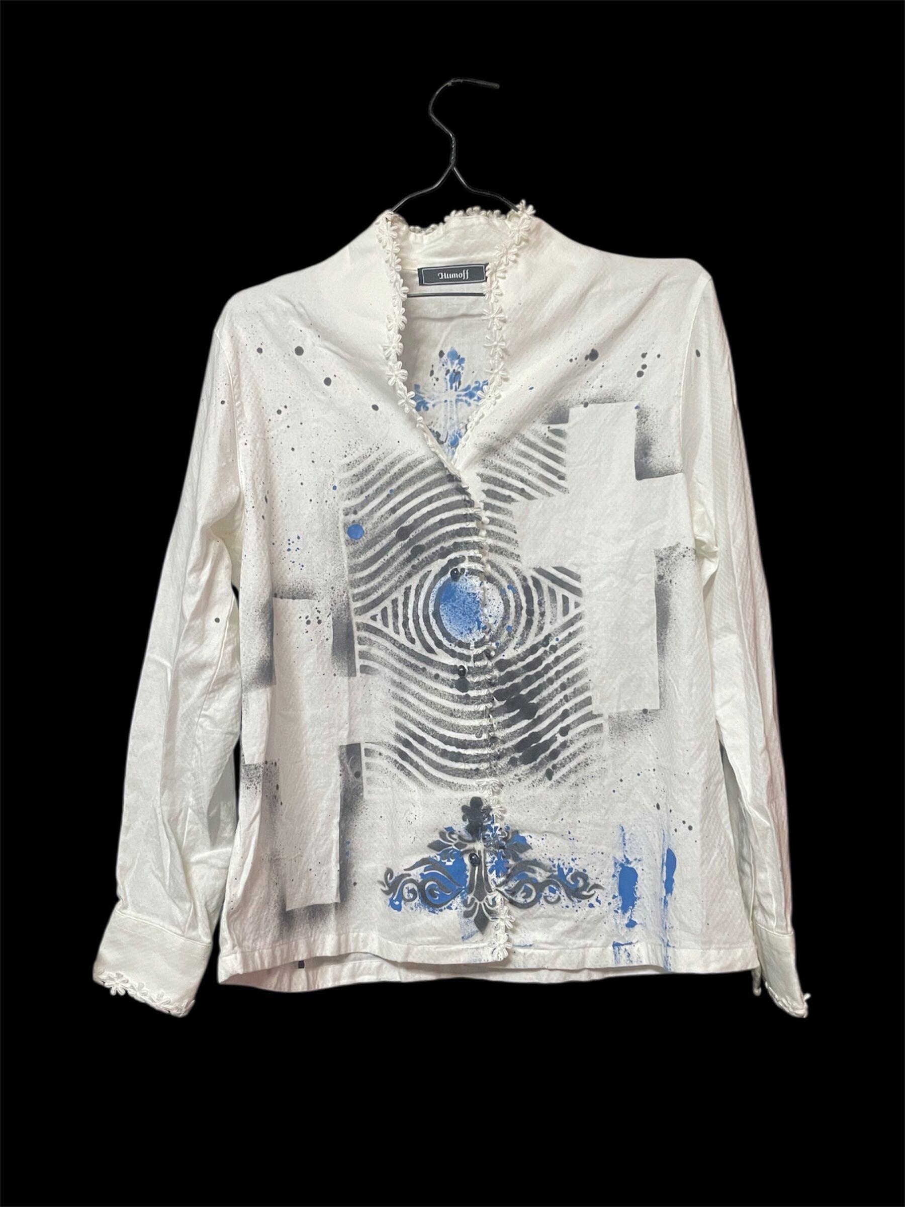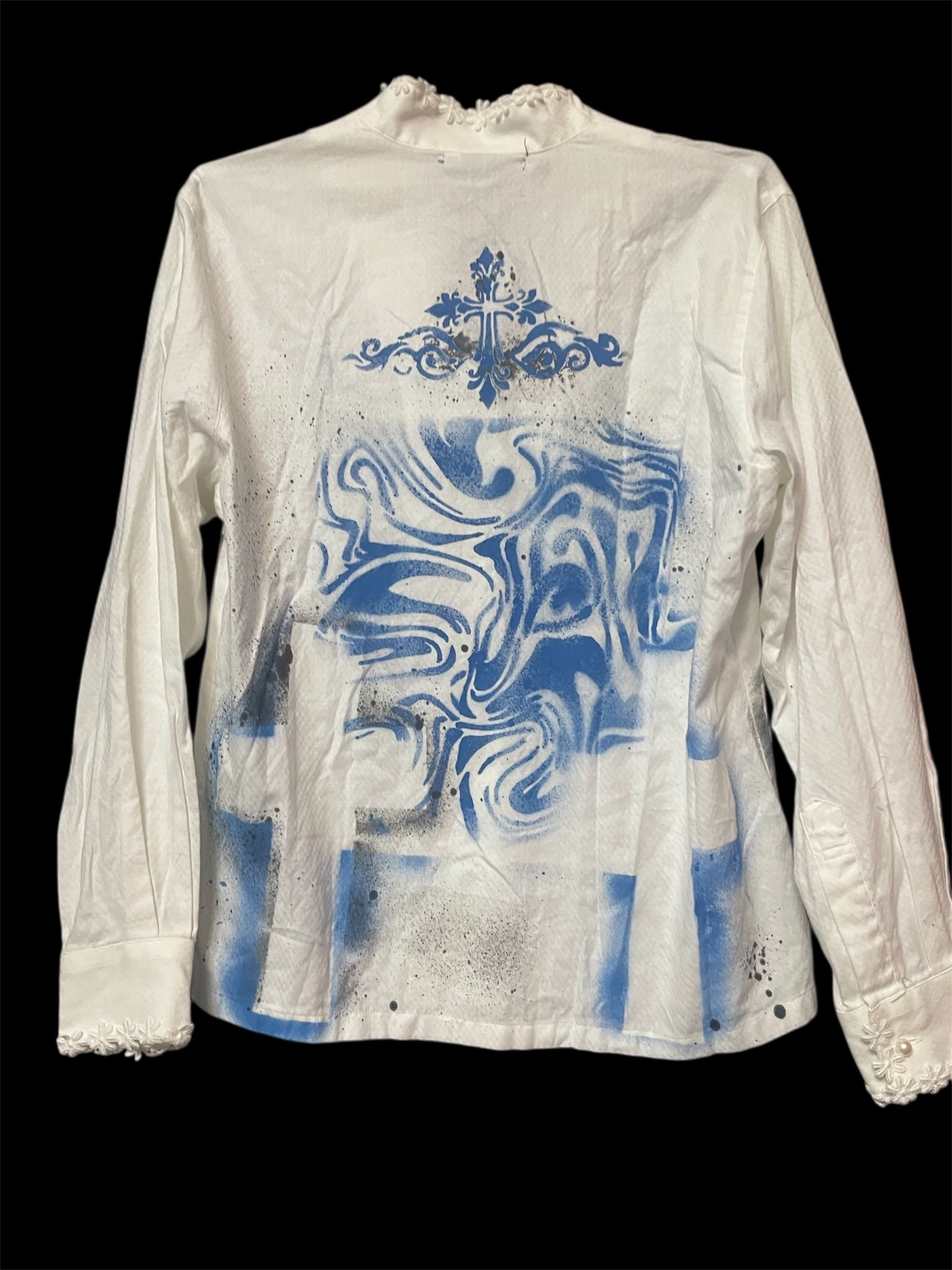 青と黒のペイントで構成された十字と瞳のモチーフが特徴のリメイクシャツ。