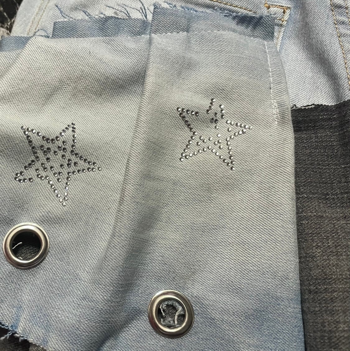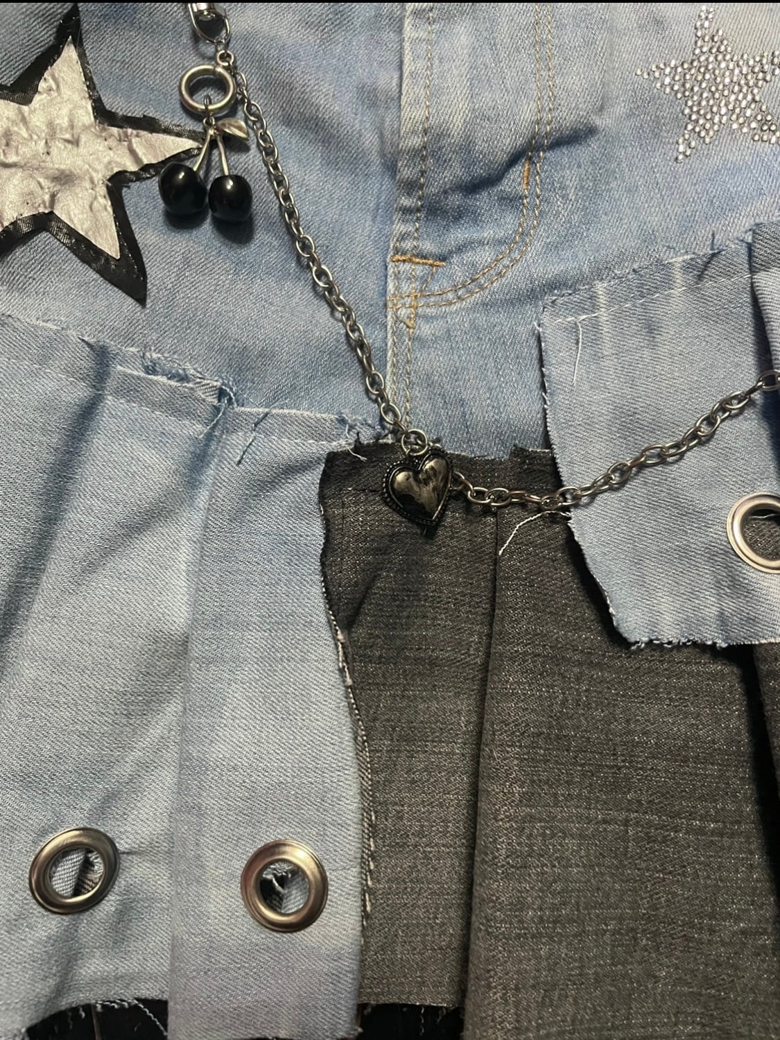 星のワッペンやラインストーン、チェーンなどを加え、ロックで個性的な雰囲気に仕上げています。