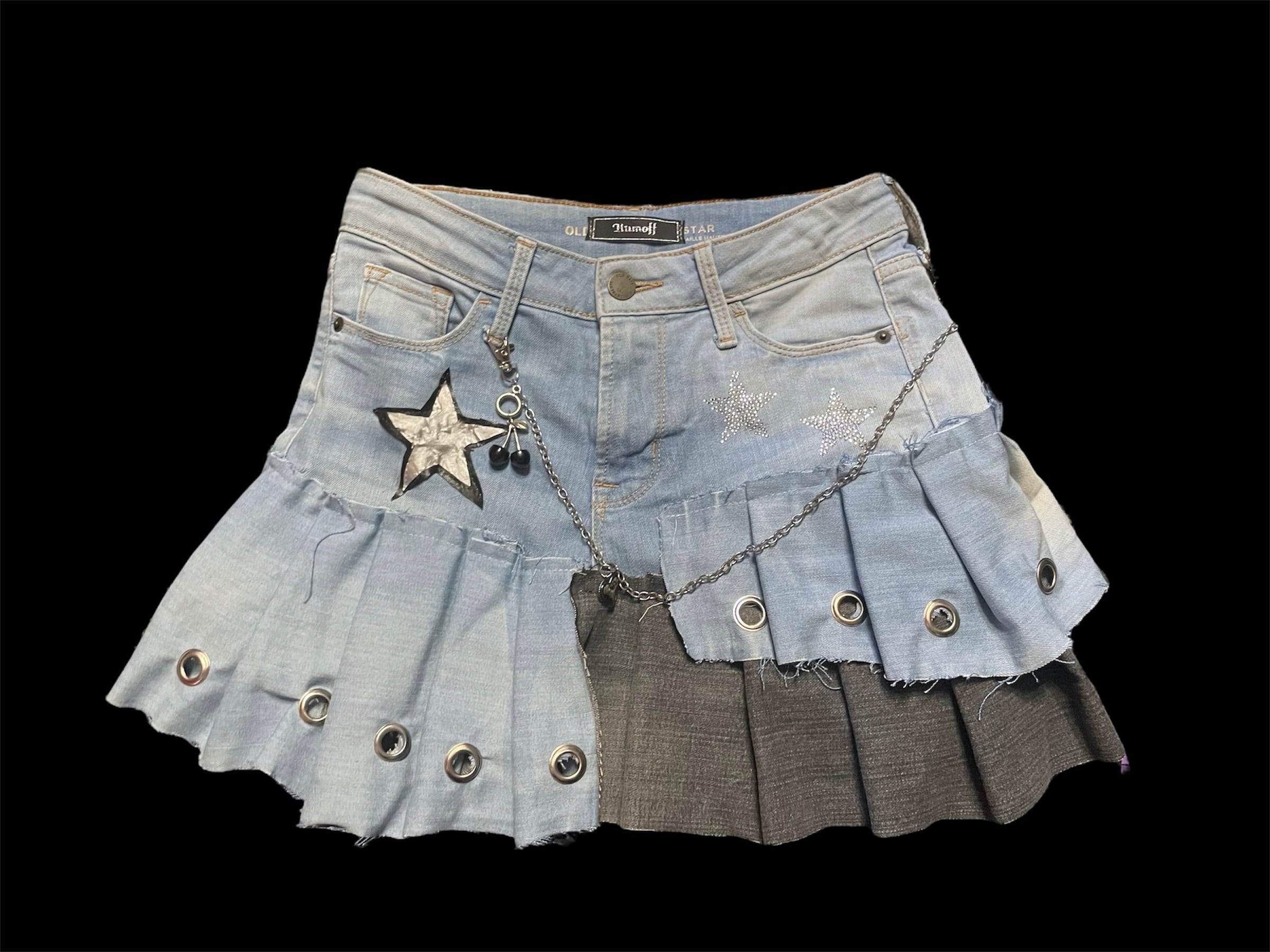 プリーツやハトメなどを組み合わせたリメイクデニムスカート。