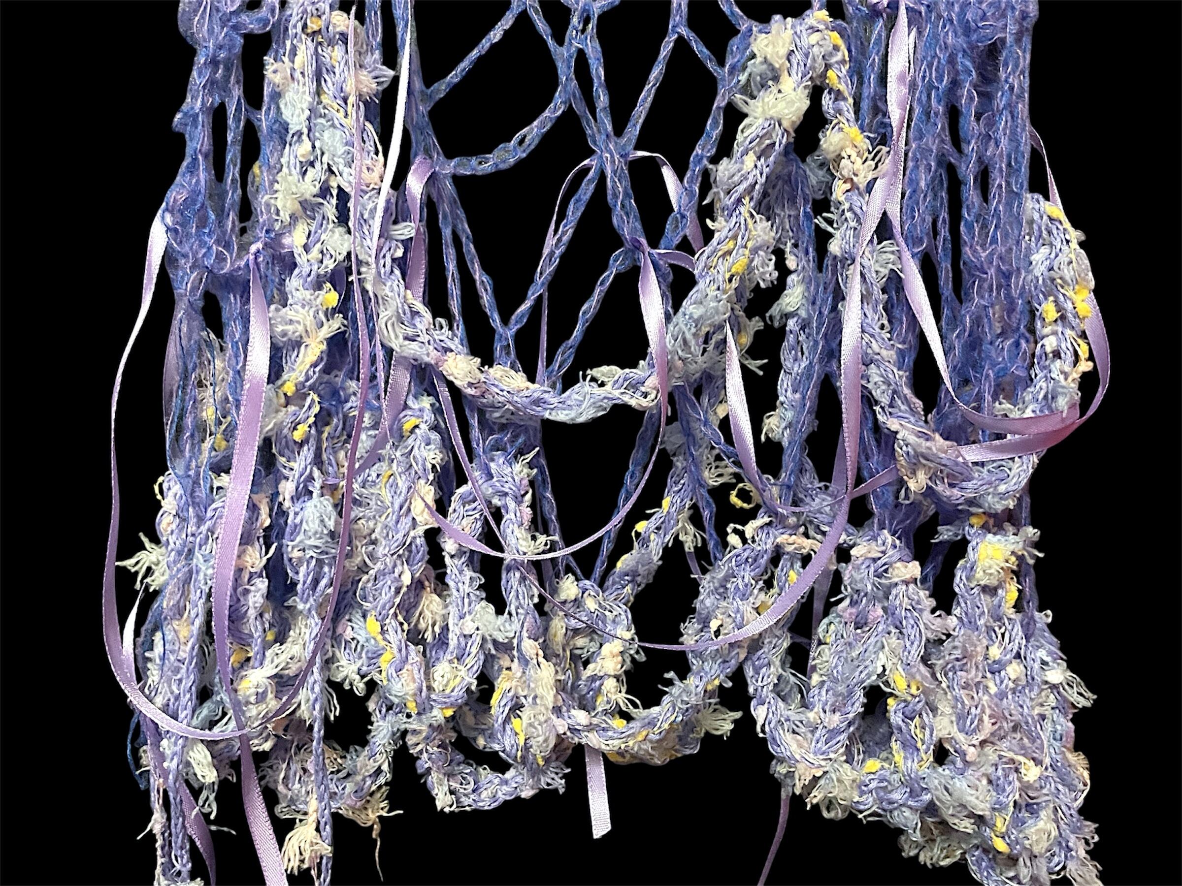 パープルとブルーの細い毛糸を組み合わせて編みました。とても鮮やかな色です。