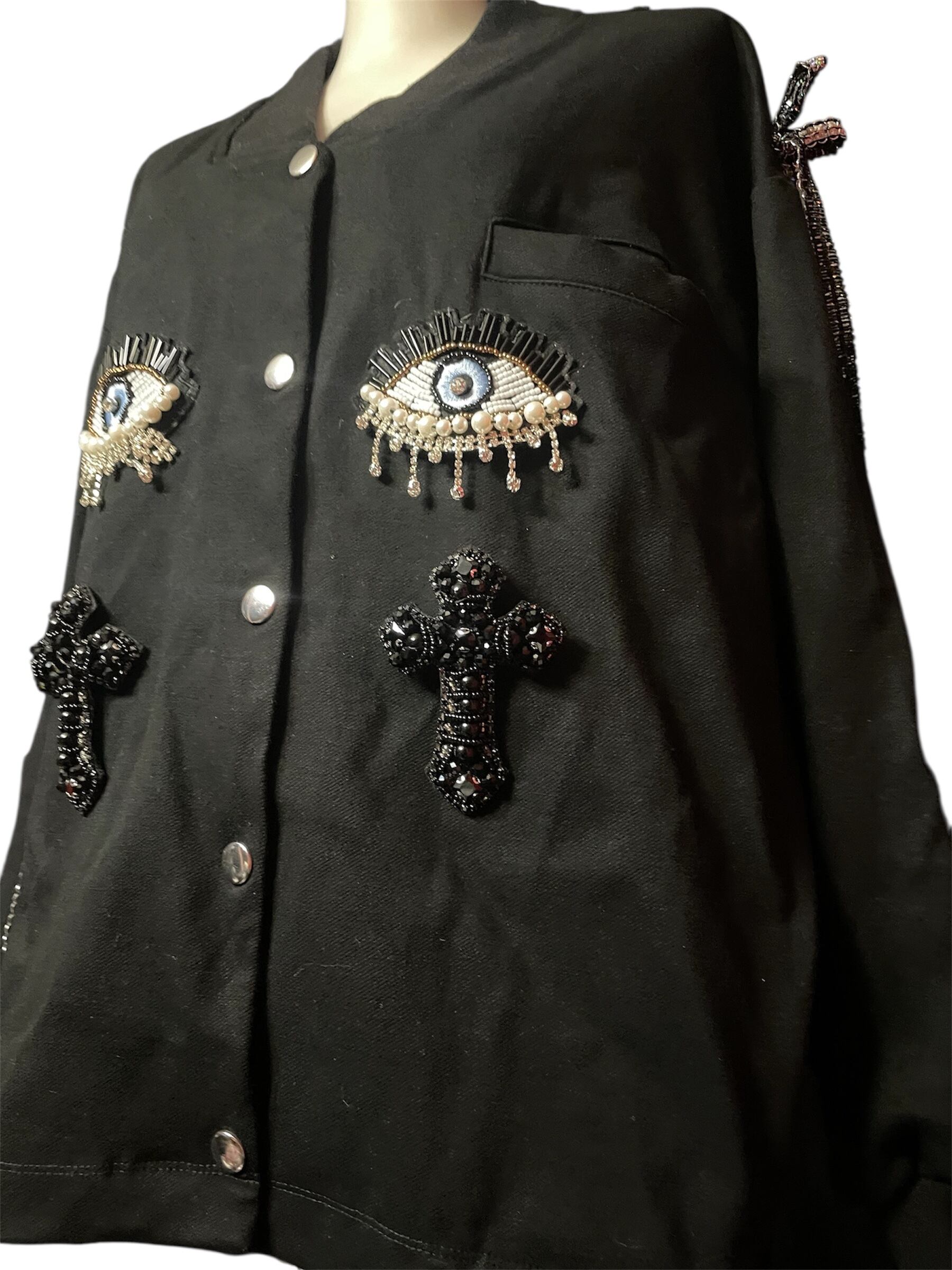 フロントに配置されたアイモチーフとクロスの立体ビジューが印象的なデザインジャケット。