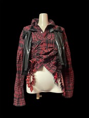 赤のチェックシャツをベースに、フロント全体へギャザーを寄せ、立体的なシルエットに再構築した一点物。肩から胸元にかけて光沢のあるブラックのリボンをつけ、存在感を持つデザインに仕上げました。ギャザー部分に左右異なるレースも入れ、動くたび揺れるアシンメトリーな表情が特徴です。