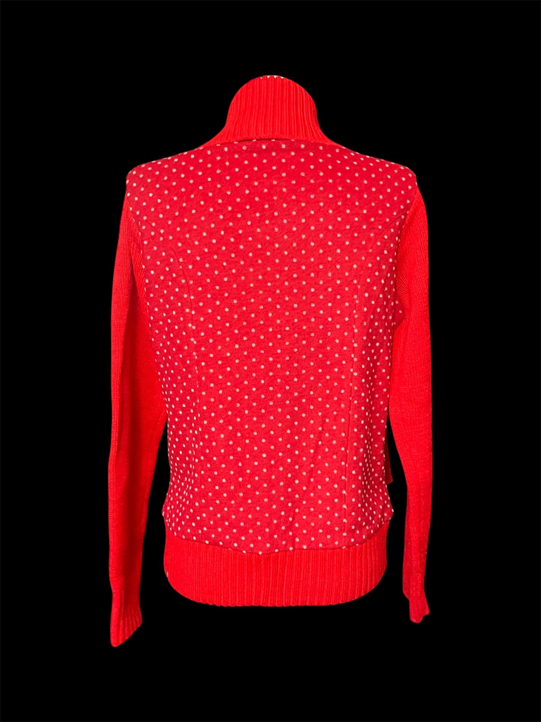 ベースの赤いドット柄ニットは柔らかな着心地で、程よく厚みがあります。
