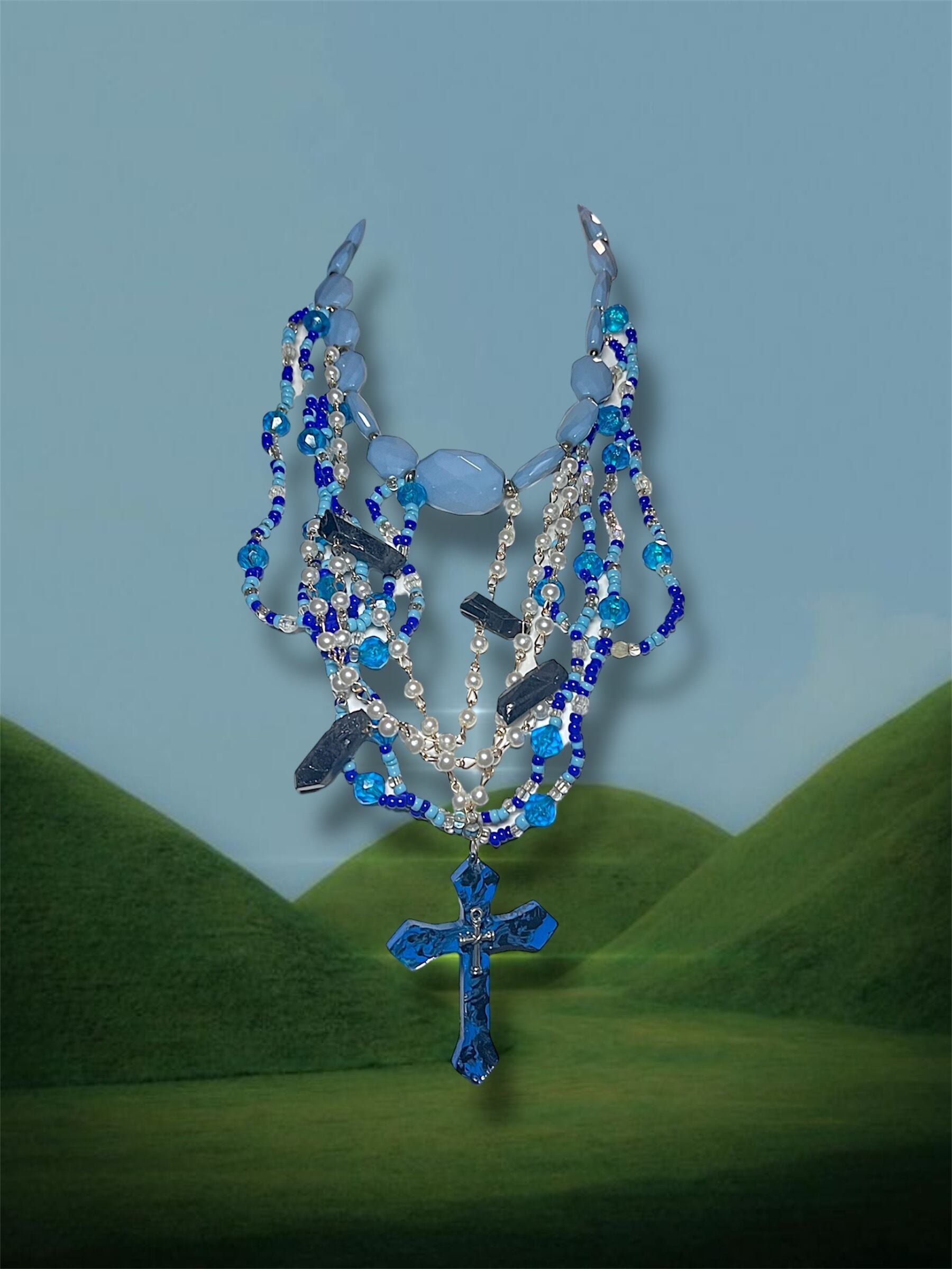 ブルー系クリスタルやビーズを重ねたレイヤーデザイン。複数のチェーンと異なる質感のパーツが重なり、立体感のある仕上がりです。