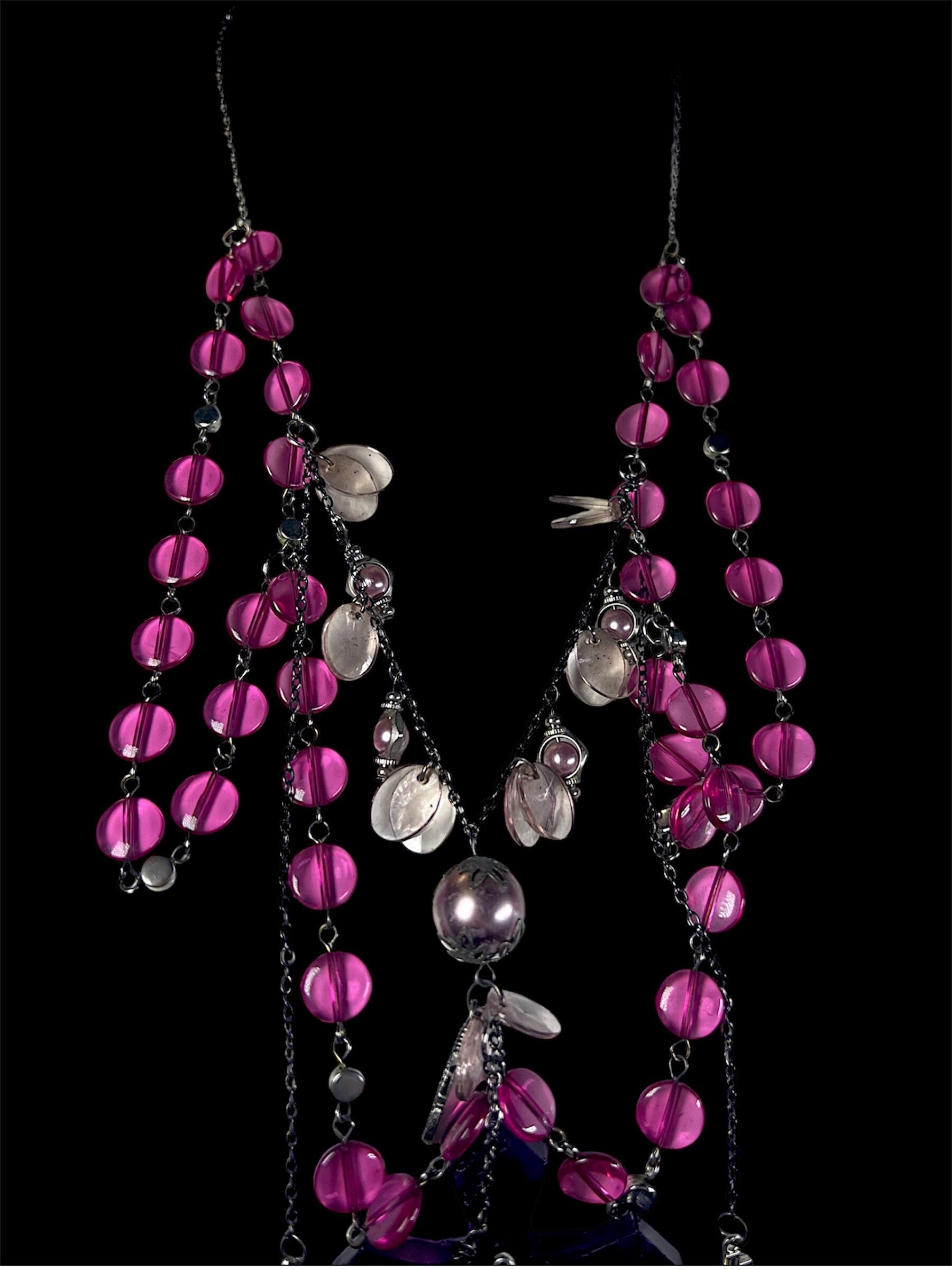 紫よりの濃いピンクのビーズとシルバーカラーのクロスを組み合わせたネックレスです。複数の連を重ね、大小のクロスパーツやラウンドビーズを配置しています。中央に淡紫色のクロスパーツを取り付けています。