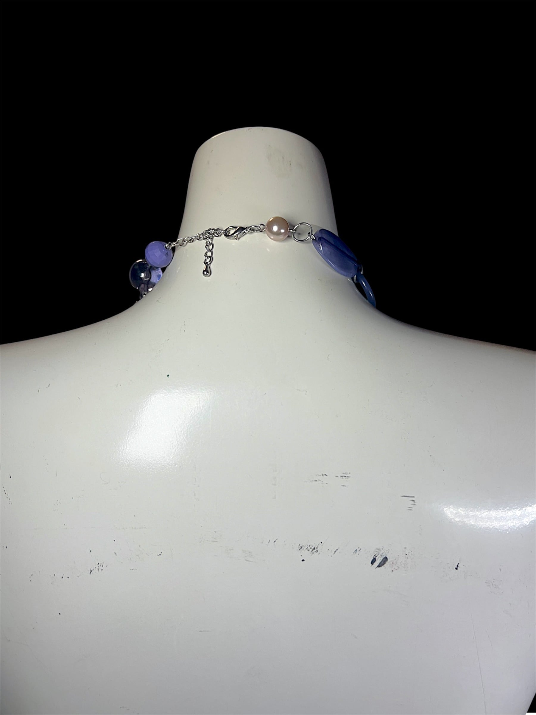 紫系ビーズとシルバーカラーのパーツを組み合わせた多連ネックレスです。中央にクマ型パーツとクロスパーツを配置しています。リングパーツや半透明のビーズを使用し、全体をまとめています。