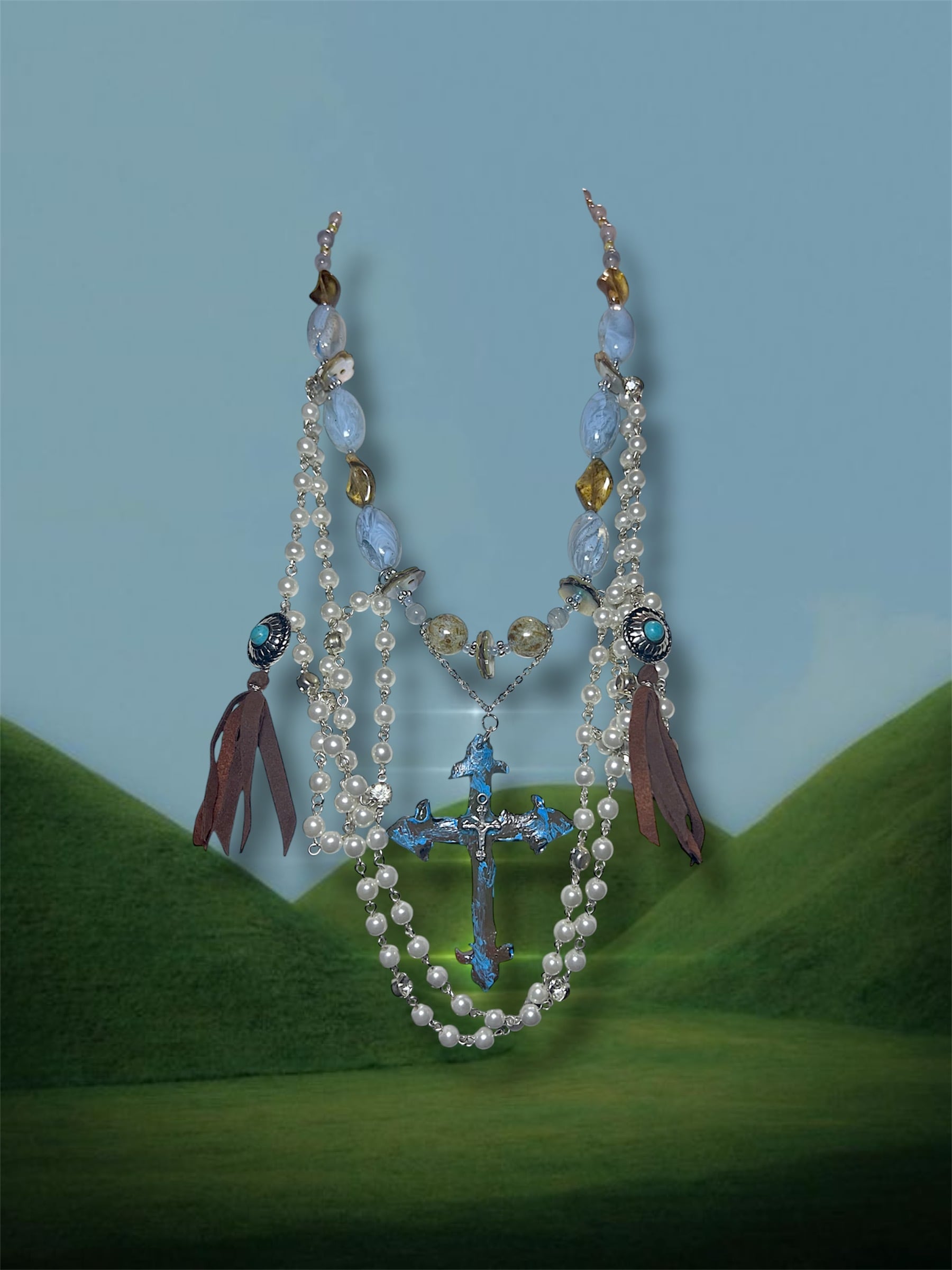 ブルー系ビーズや天然風パーツ、レザーパーツを組み合わせたレイヤードデザイン。複数連の奥行きと異素材のコントラストが特徴です。