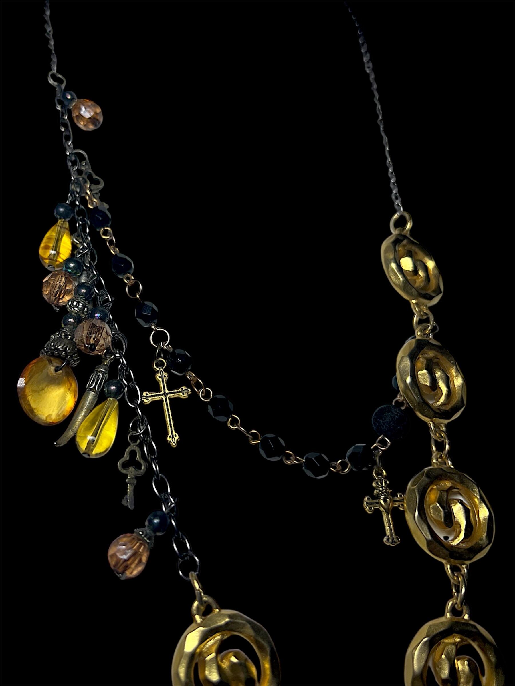 ゴールドカラーのバラ型パーツを連ねたネックレスです。黒系ビーズやチェーンを組み合わせ、下部にゴールドカラーの大きなクロスパーツを配置しています。複数のビーズとチェーンを使用した構成です。