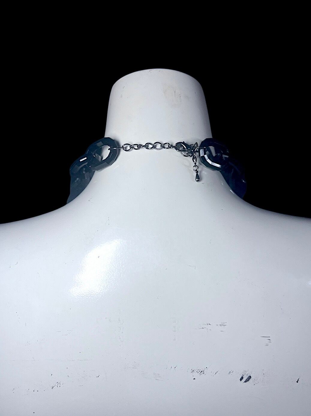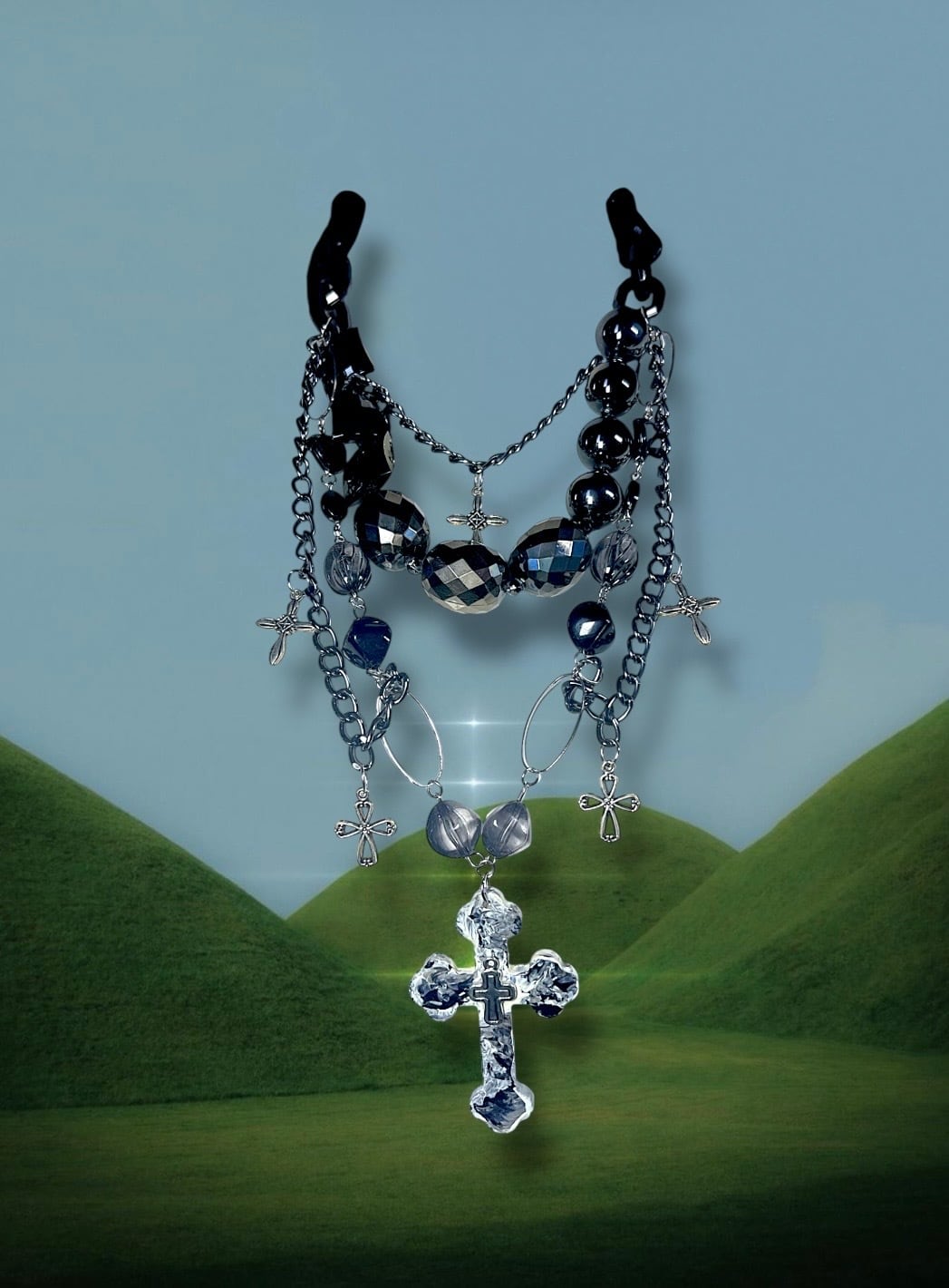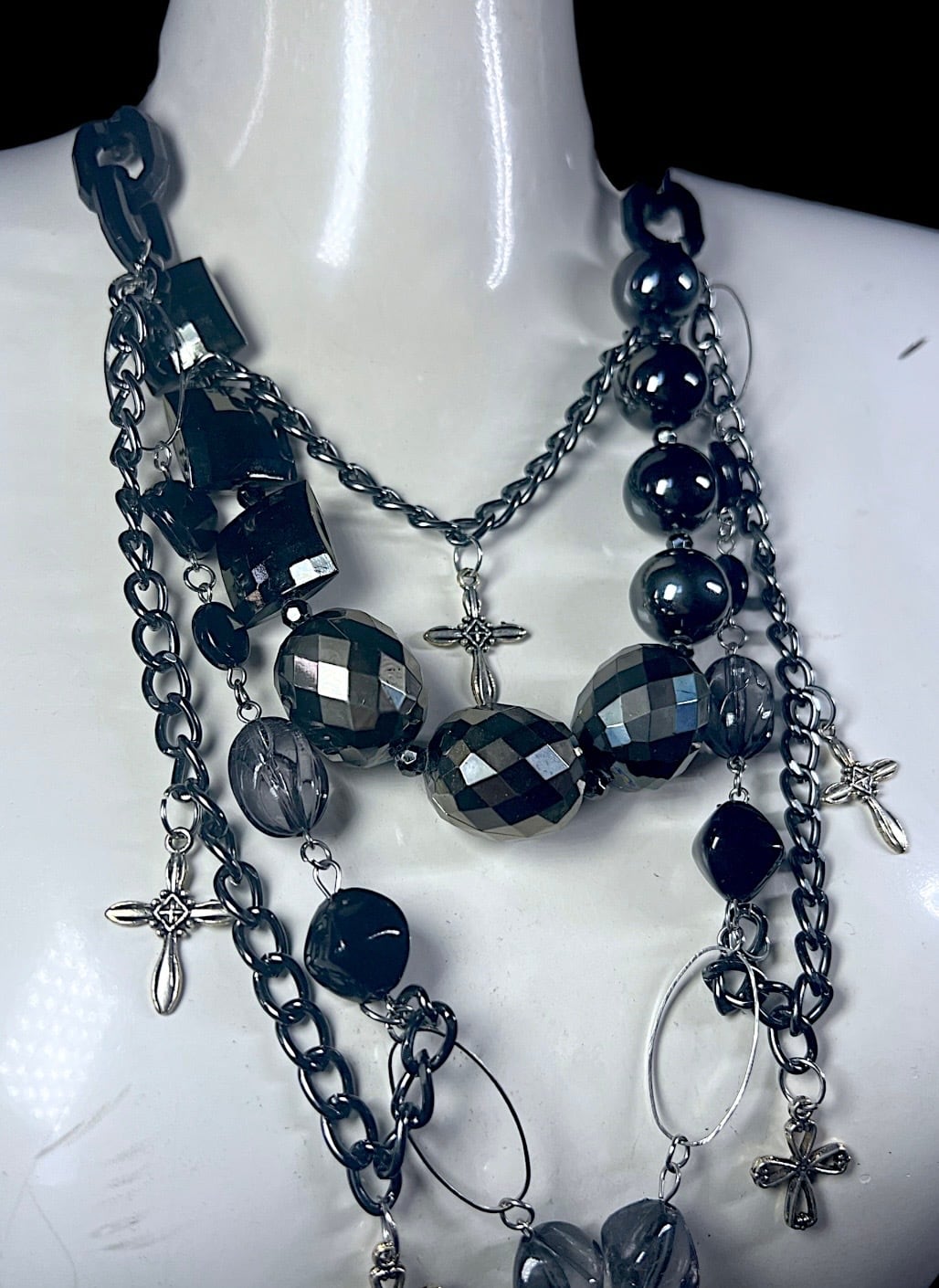 黒系ビーズとシルバーカラーのチェーンを組み合わせた多連ネックレスです。大粒のビーズや小さなクロスチャームを配置し、中央には黒と白のマーブル模様のクロスパーツを取り付けています。