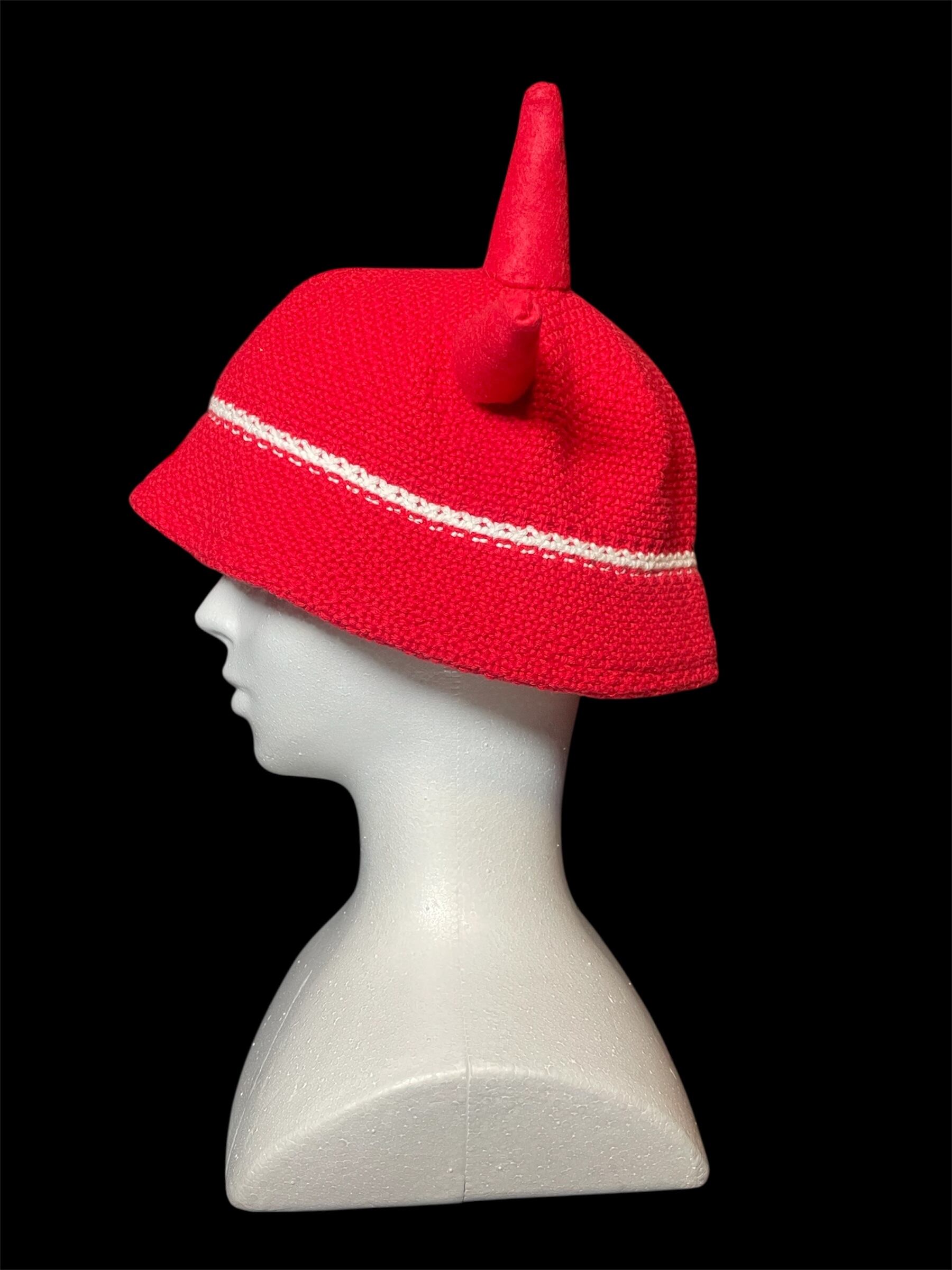 複数の角を立体的に配置した帽子。正面には白いライン状の編み模様が入っています。