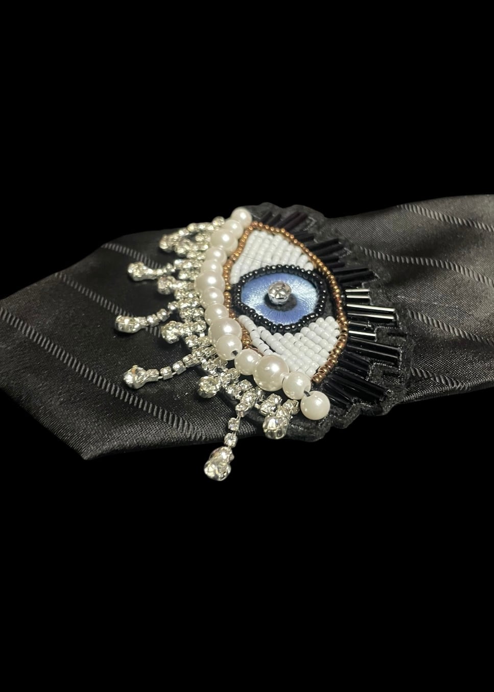 無地調のネクタイに、ビーズ装飾のアイモチーフをあしらった一点。