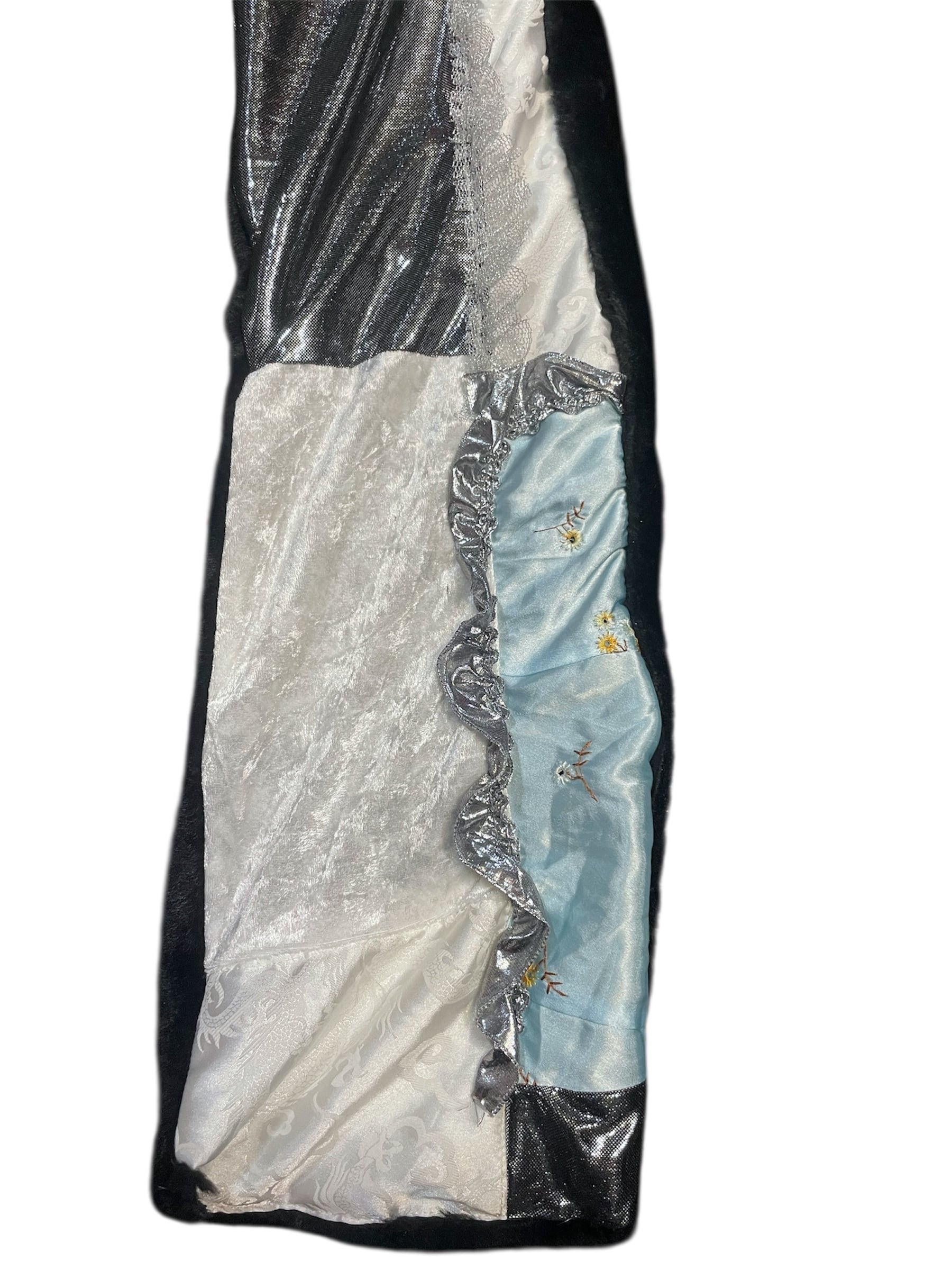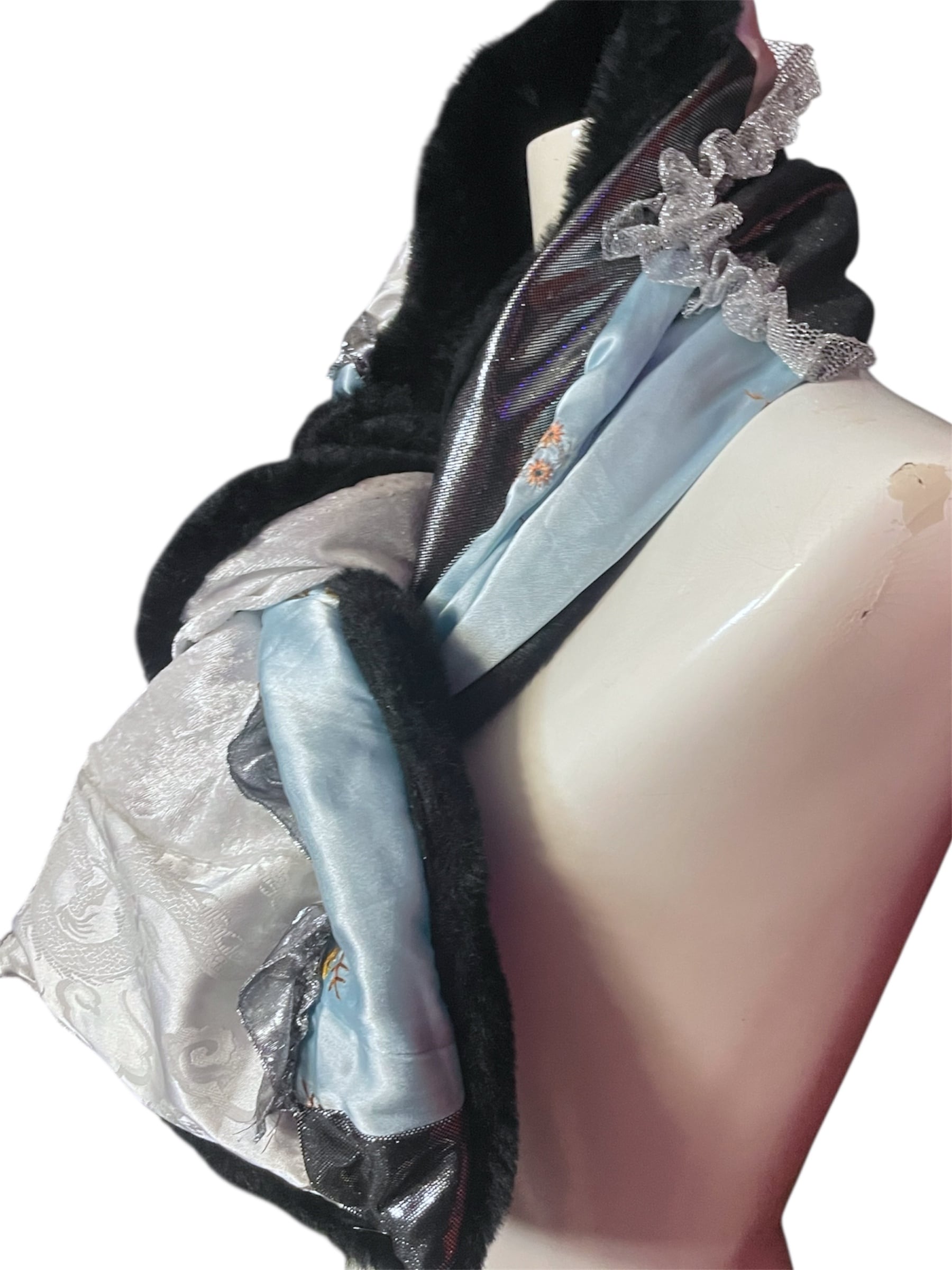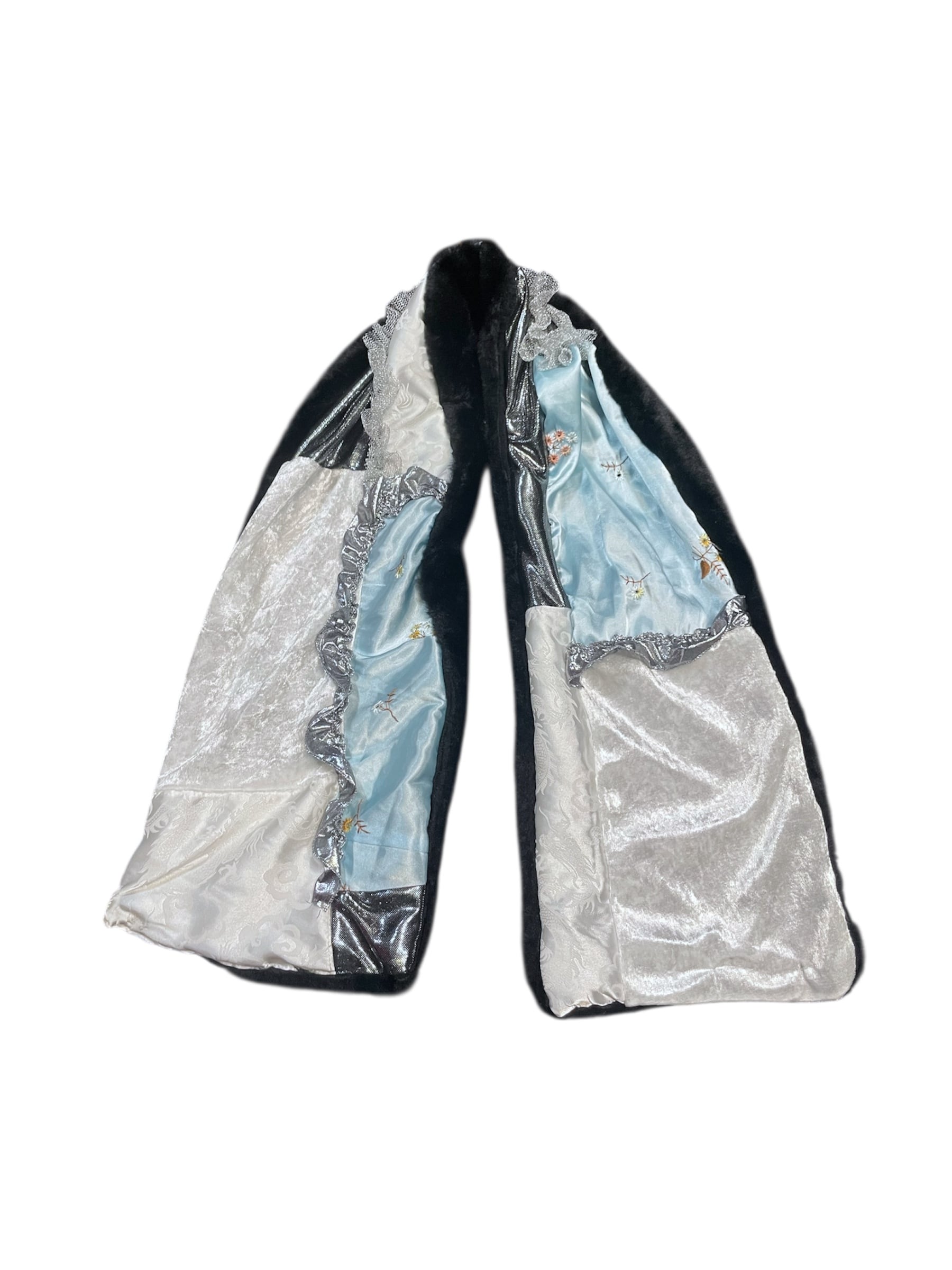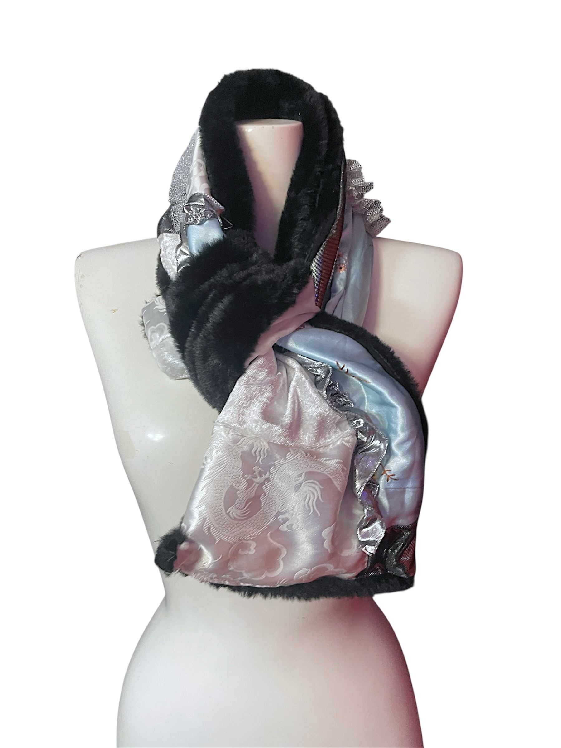 異素材を組み合わせたパッチワークデザインに、さりげなくシルバーレースをあしらったショートマフラーです。