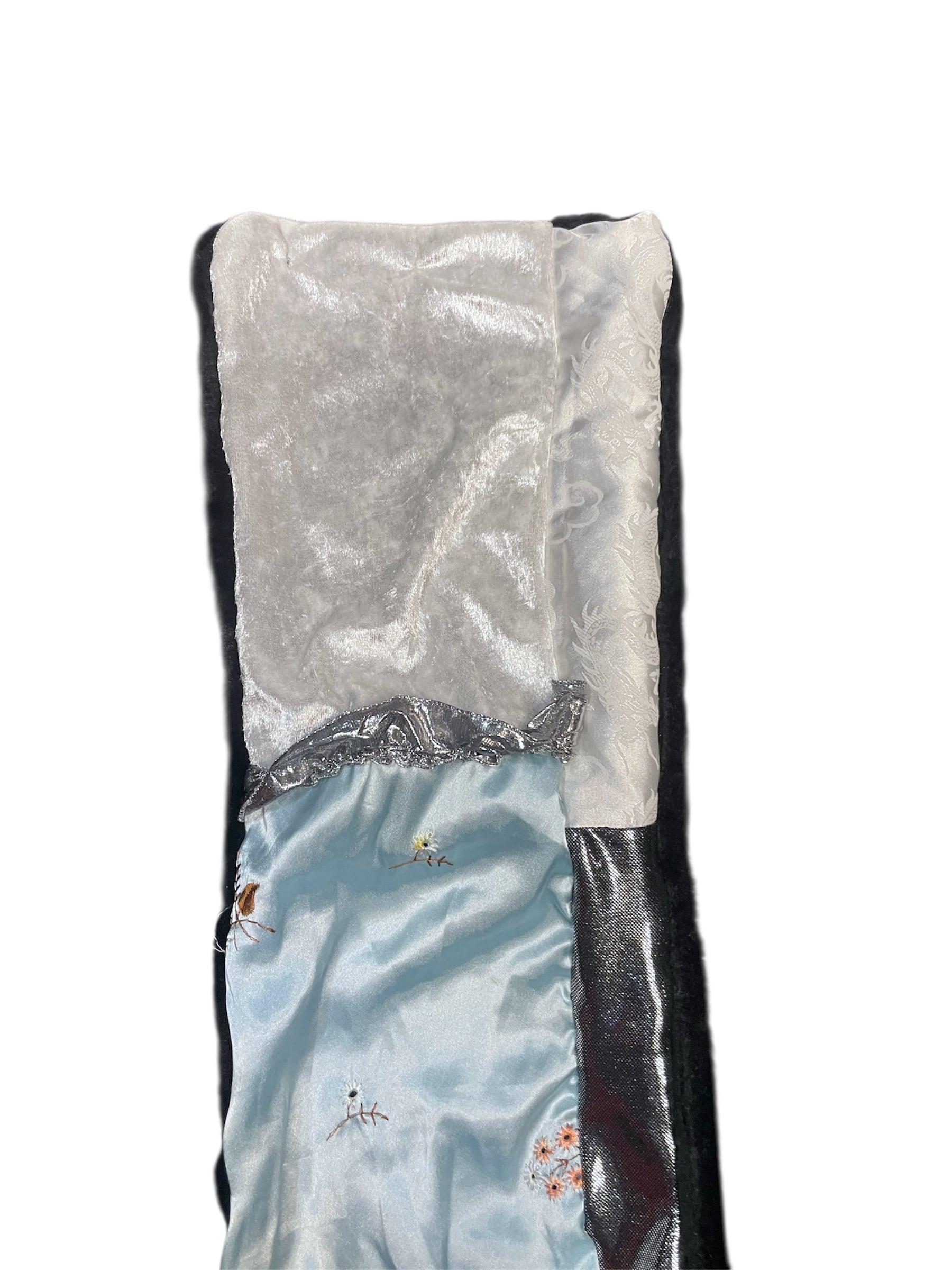 ホワイト、水色、シルバー調の生地が入り、落ち着きの中に個性を感じる見た目に仕上がっています。